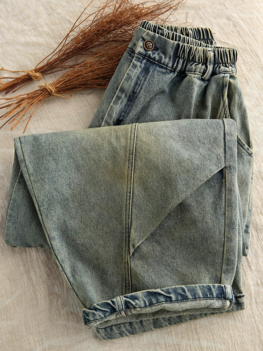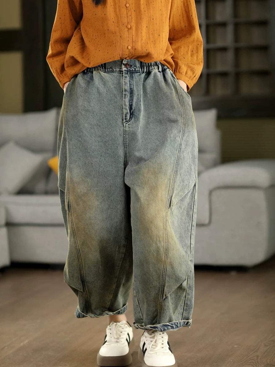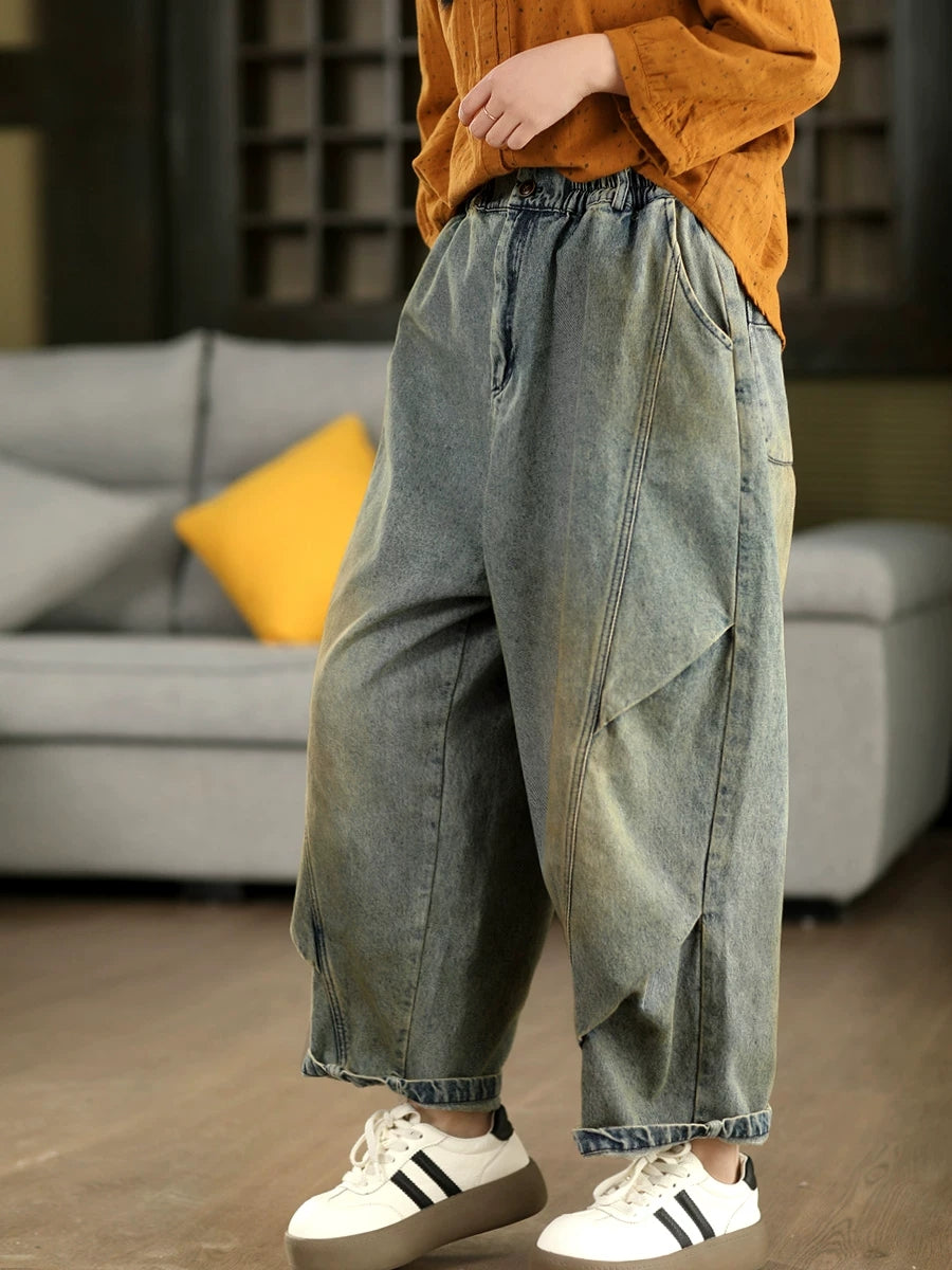女士春季復古牛仔拼接哈倫褲