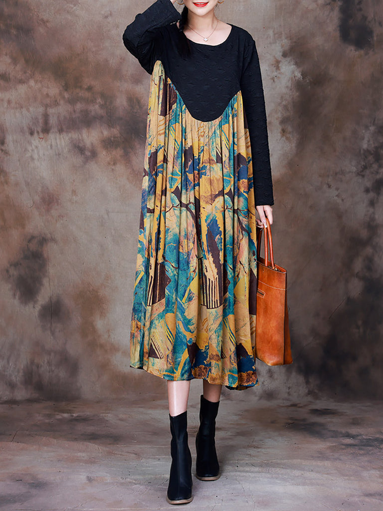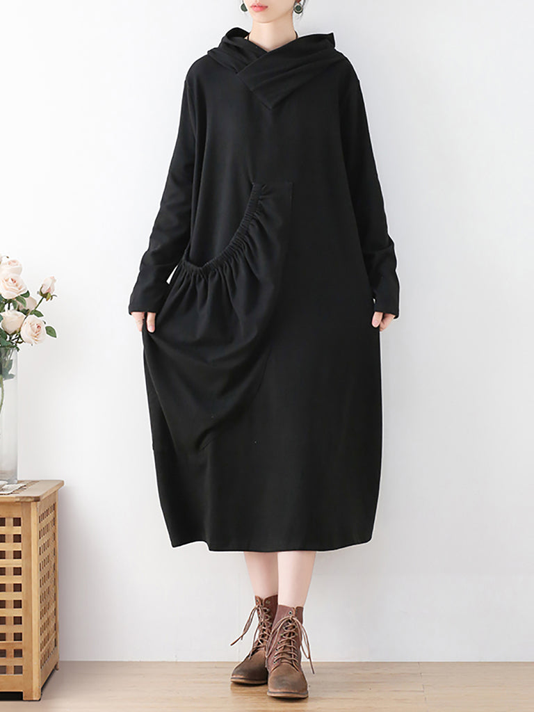 大尺碼女式復古碎花抽褶寬鬆連帽連身裙