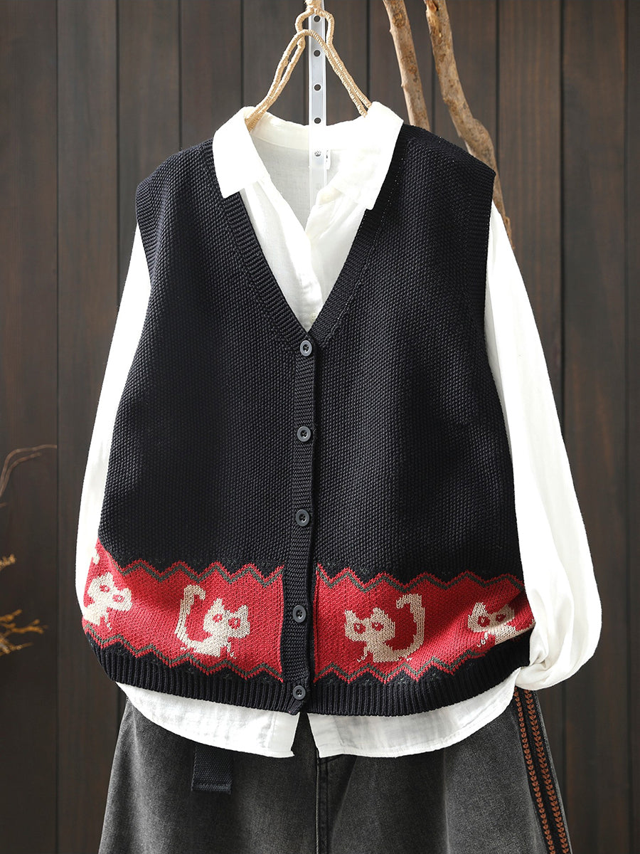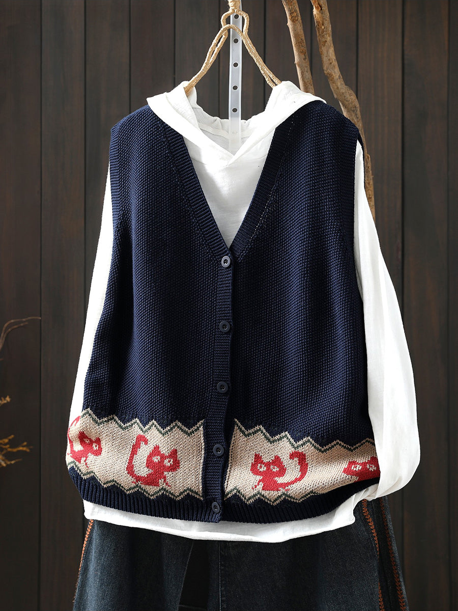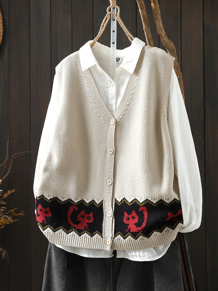 女士春季藝術貓針織V領背心