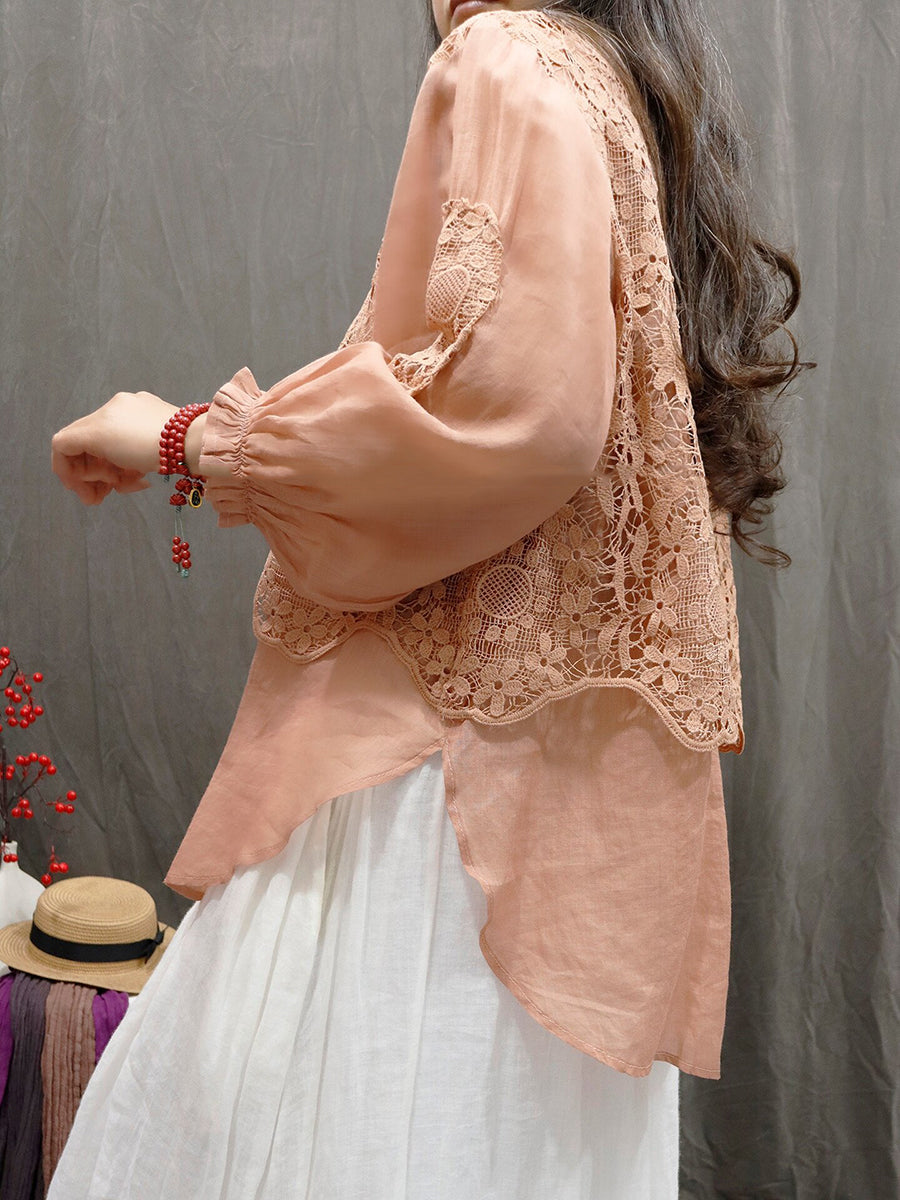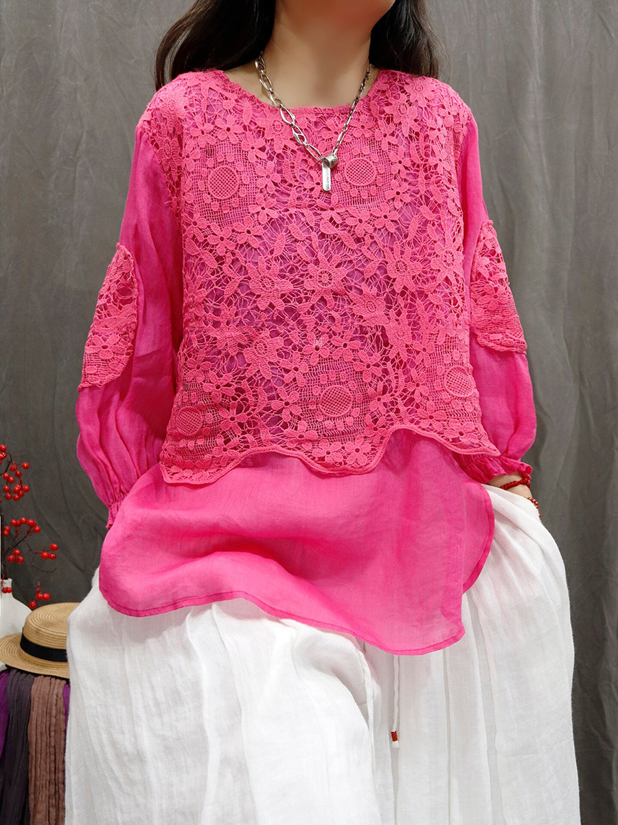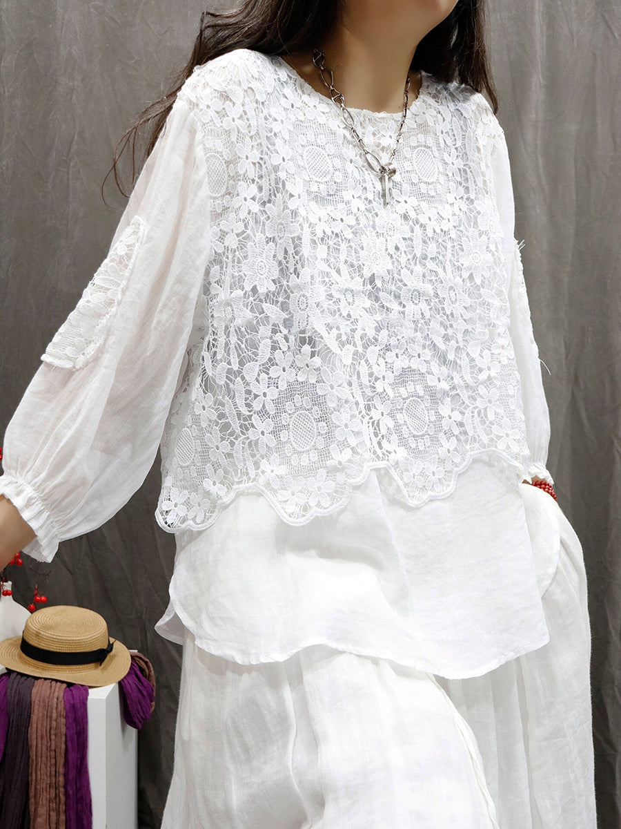女士夏季藝術風花朵蕾絲圓領100%苧麻襯衫