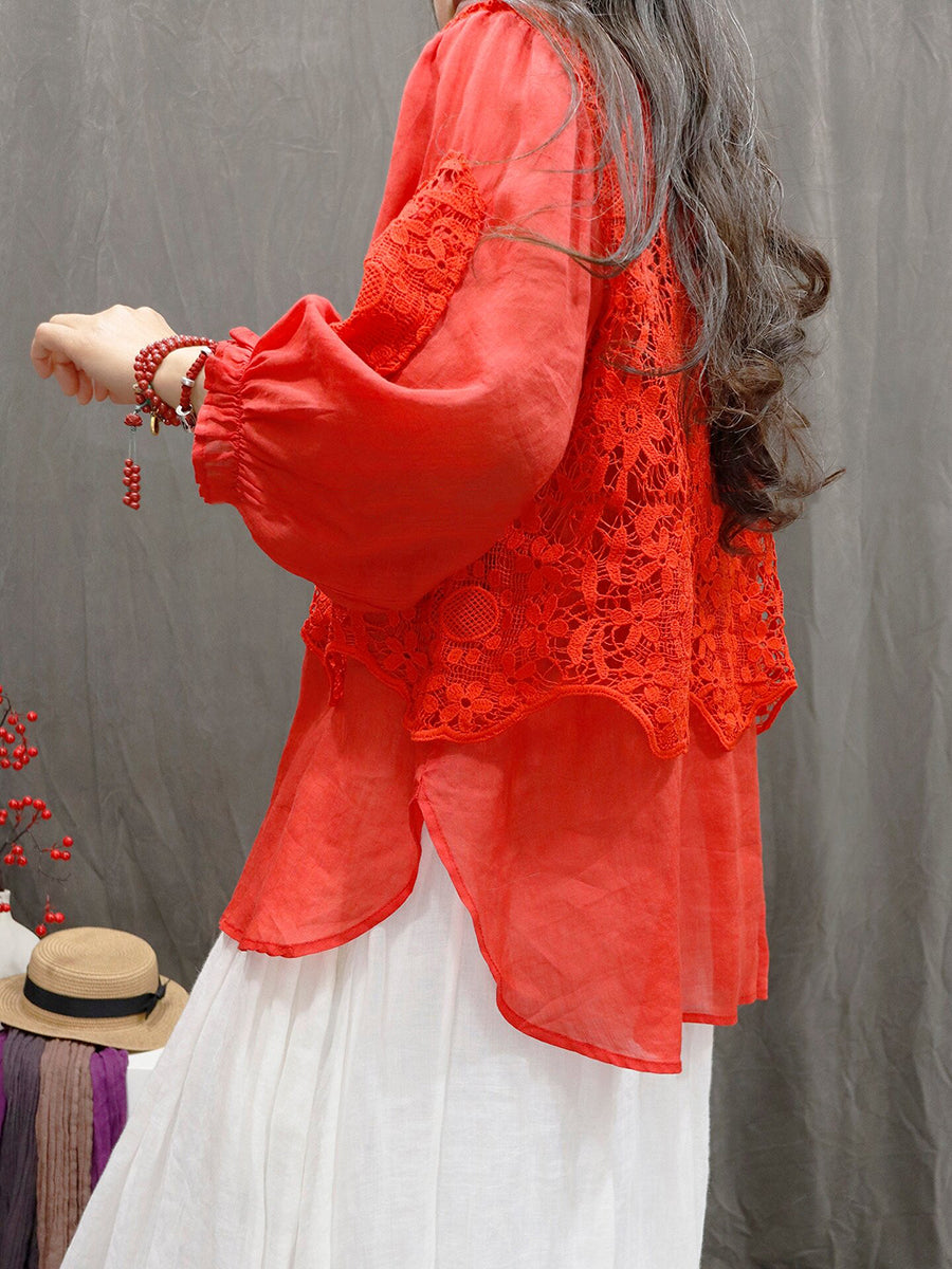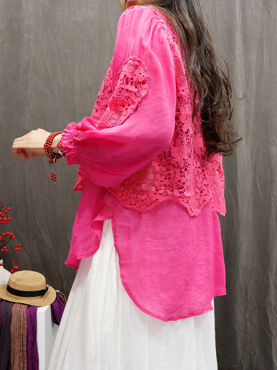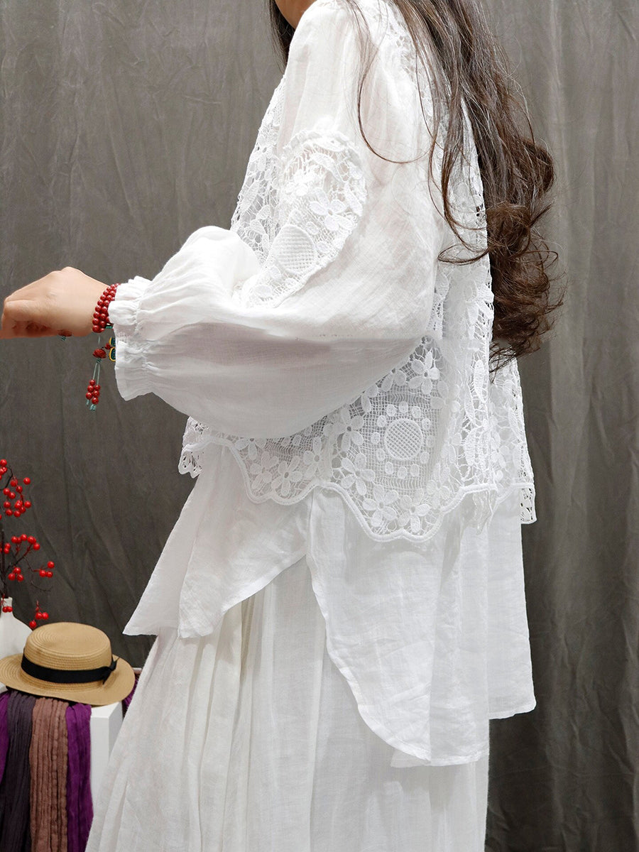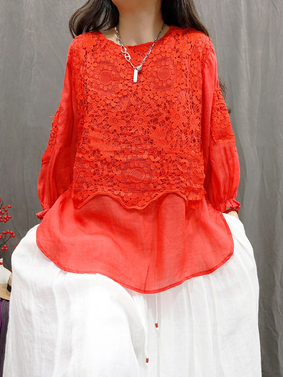 女士夏季藝術風花朵蕾絲圓領100%苧麻襯衫