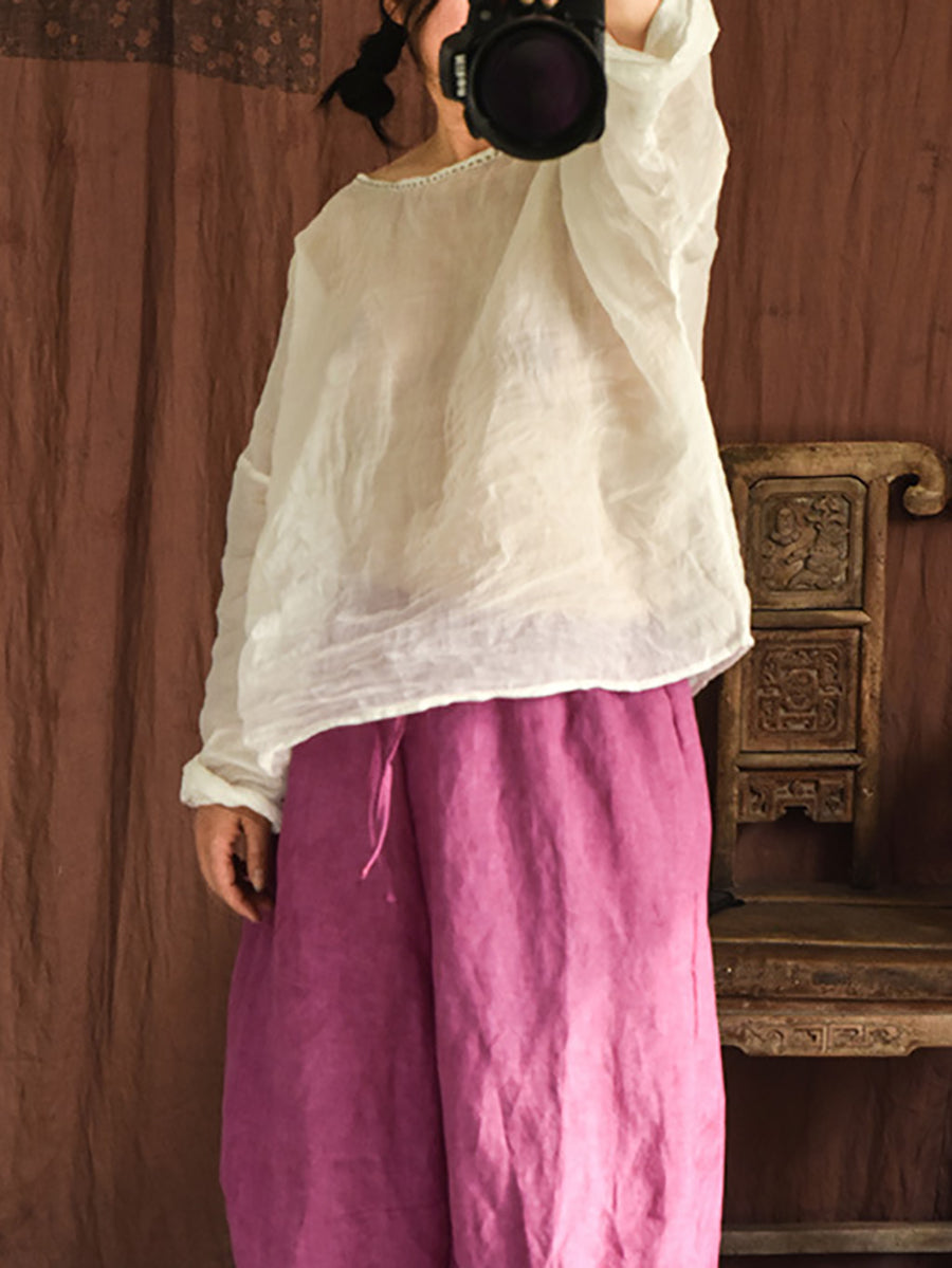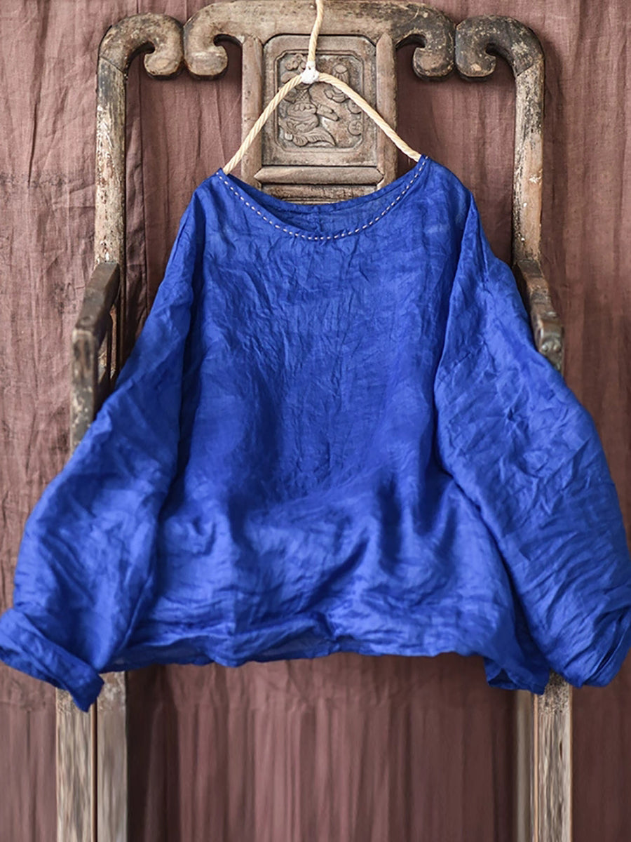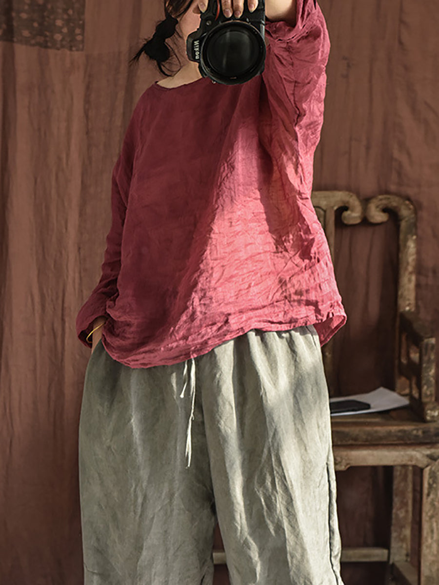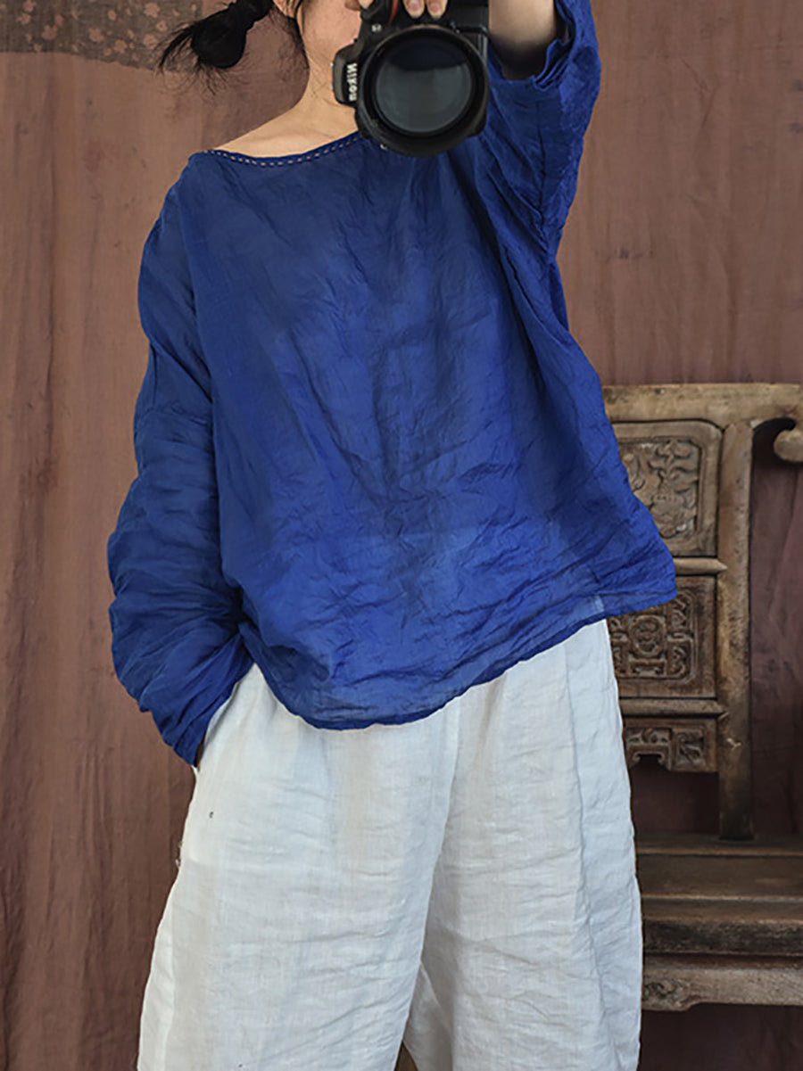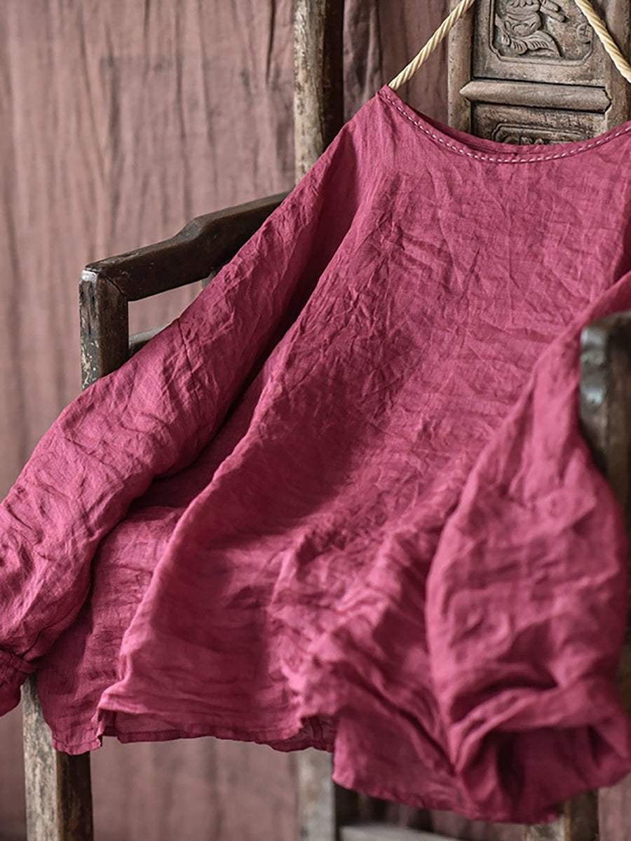 女士夏季復古苧麻圓領襯衫