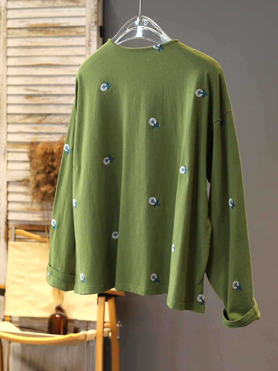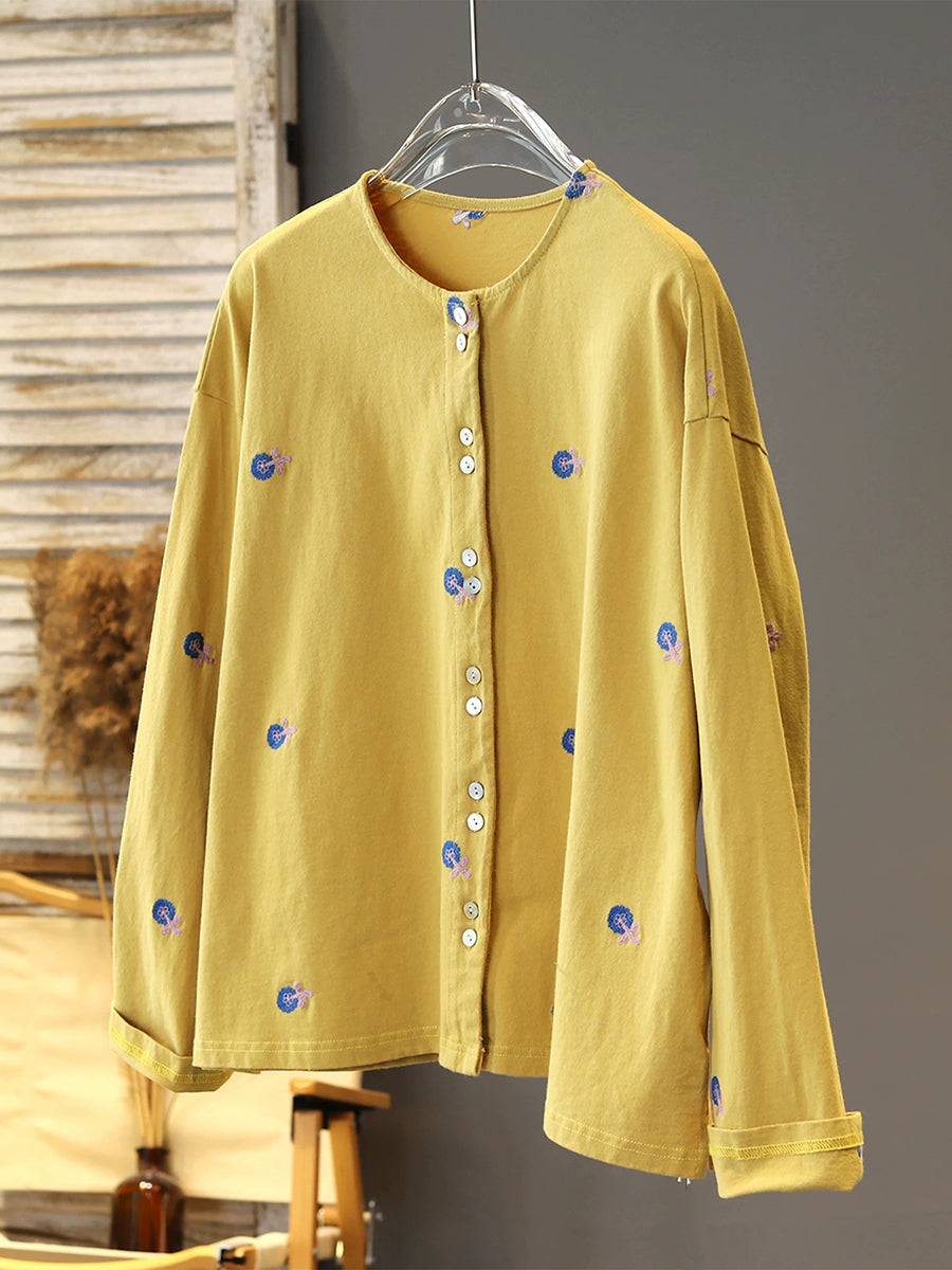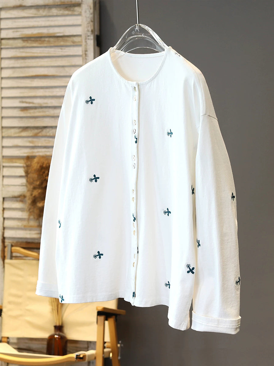 女士春季花卉刺繡圓領襯衫