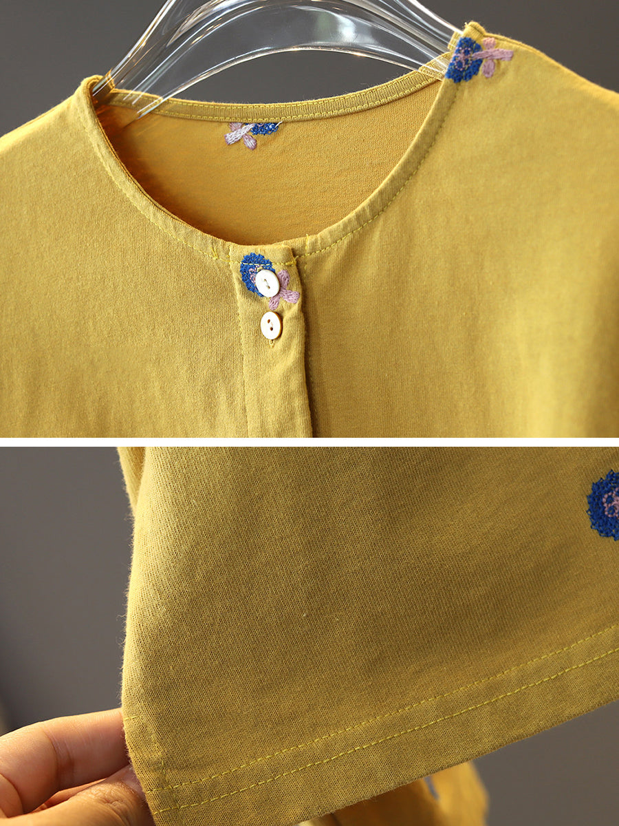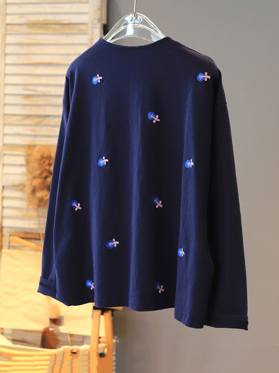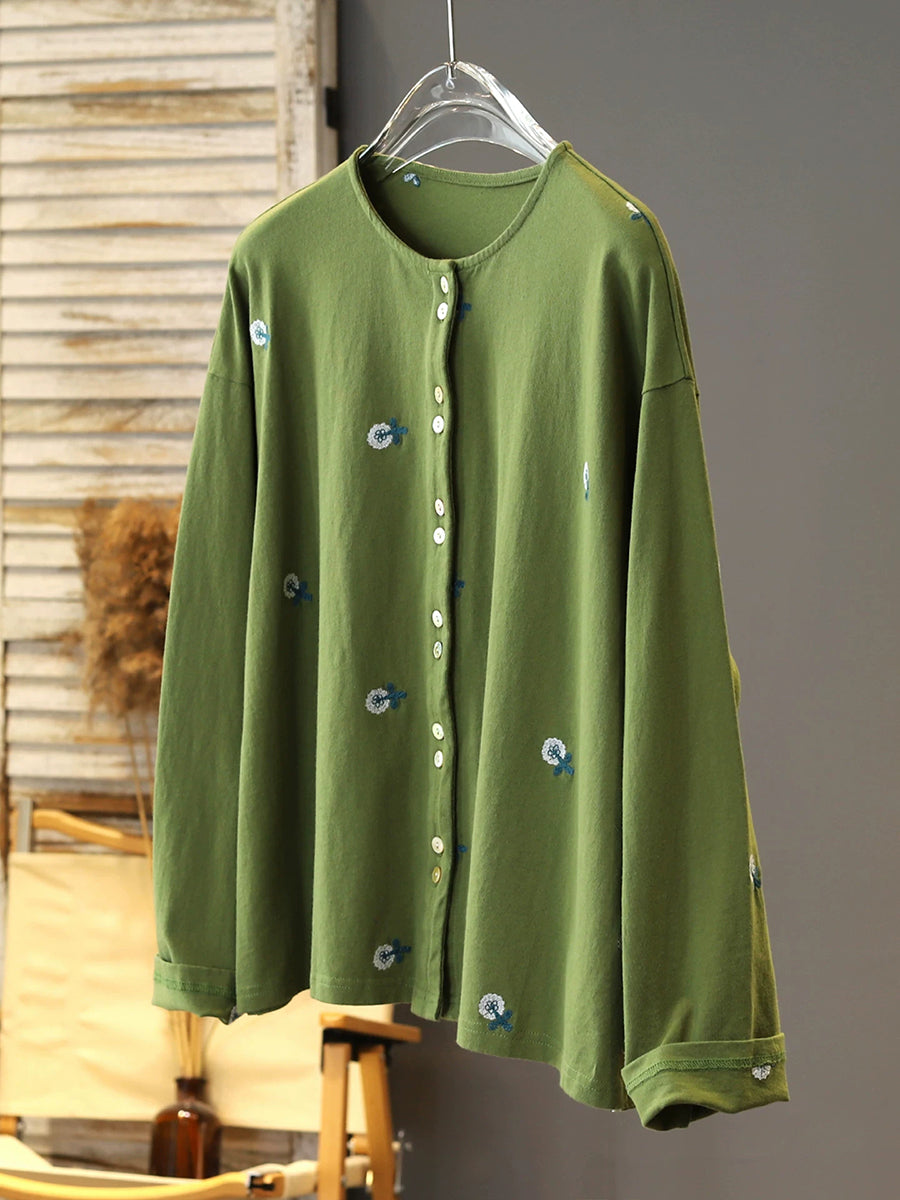 女士春季花卉刺繡圓領襯衫