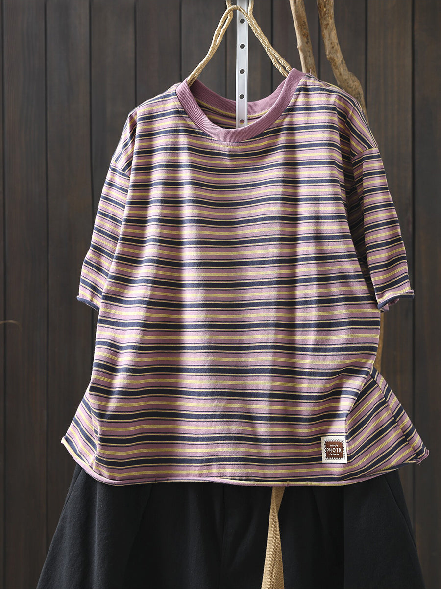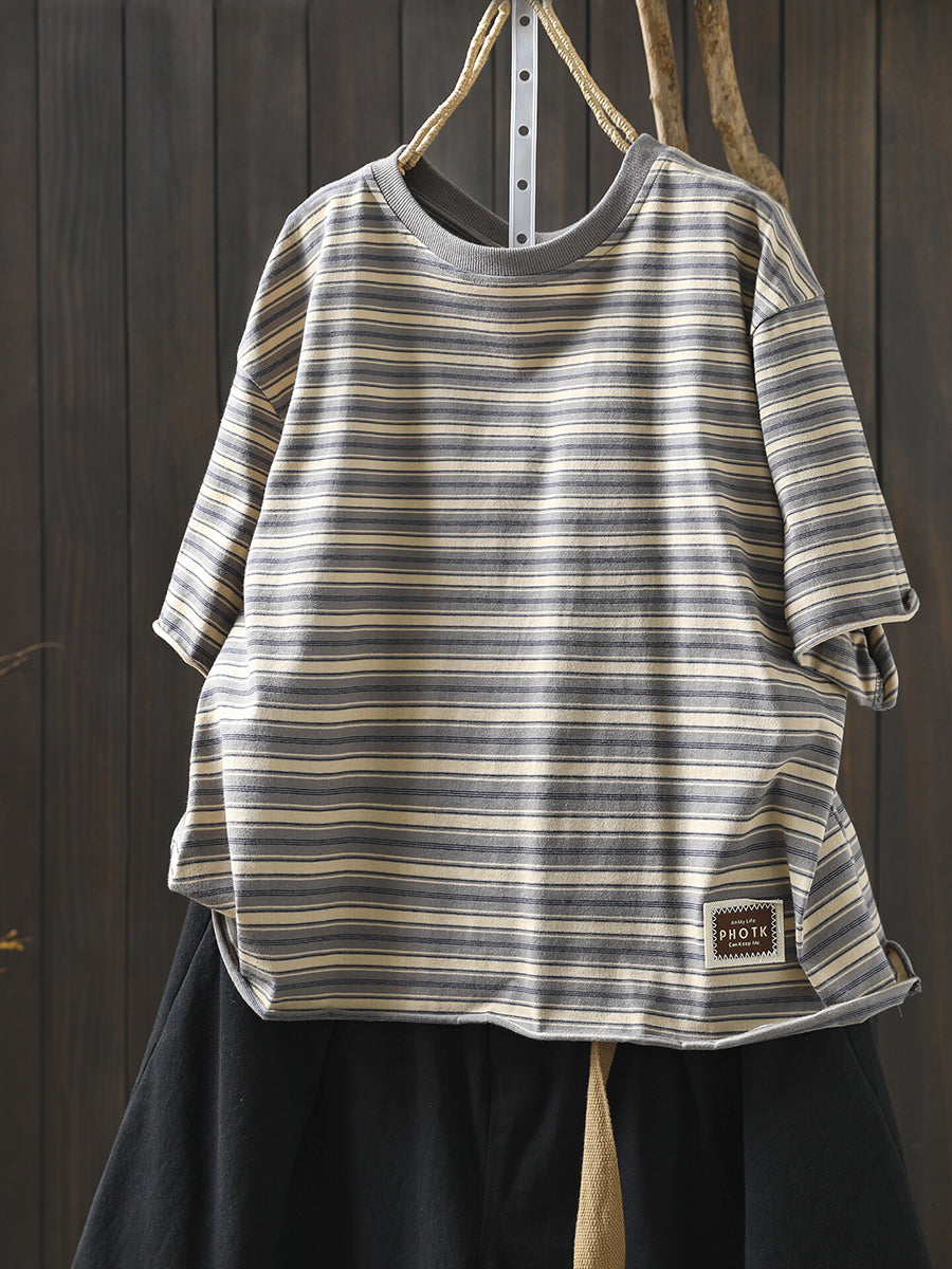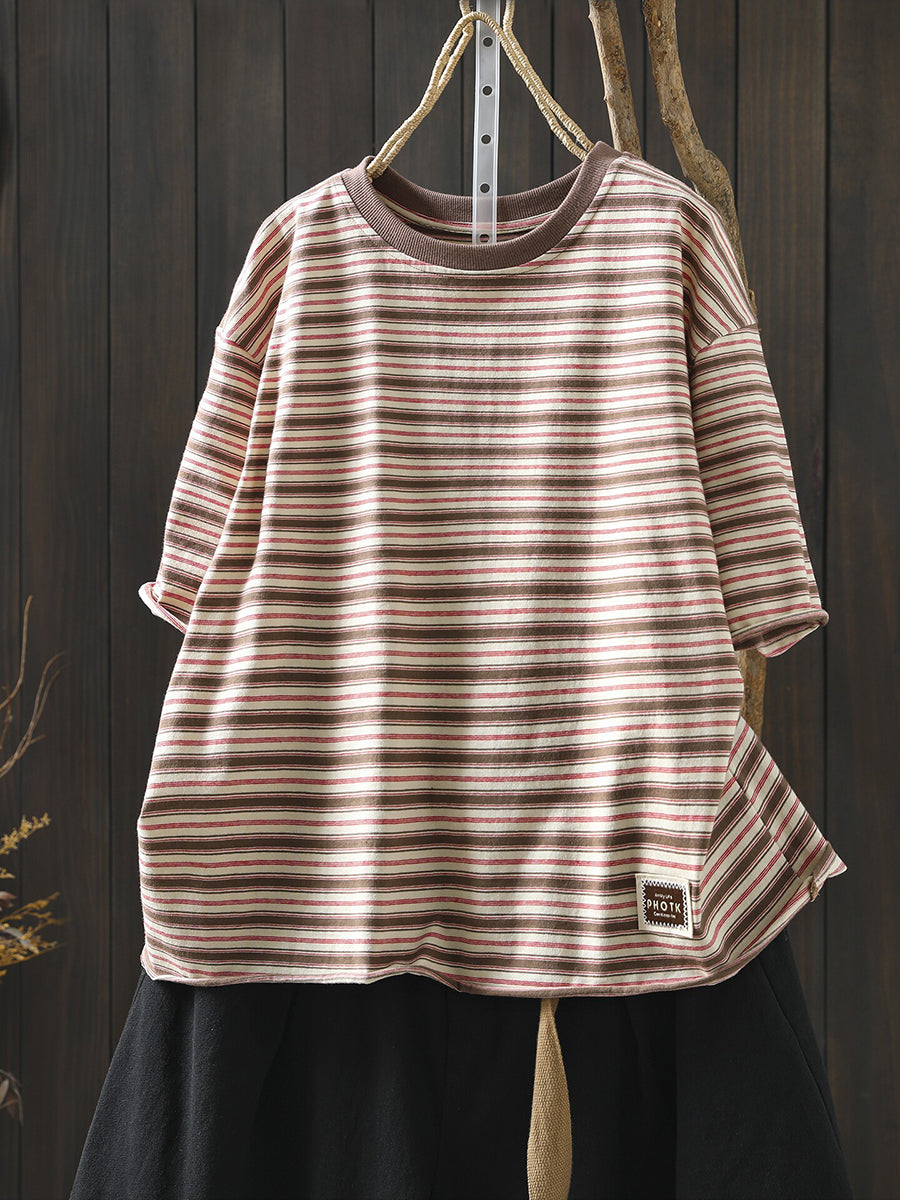 女士夏季條紋圓領100%純棉襯衫