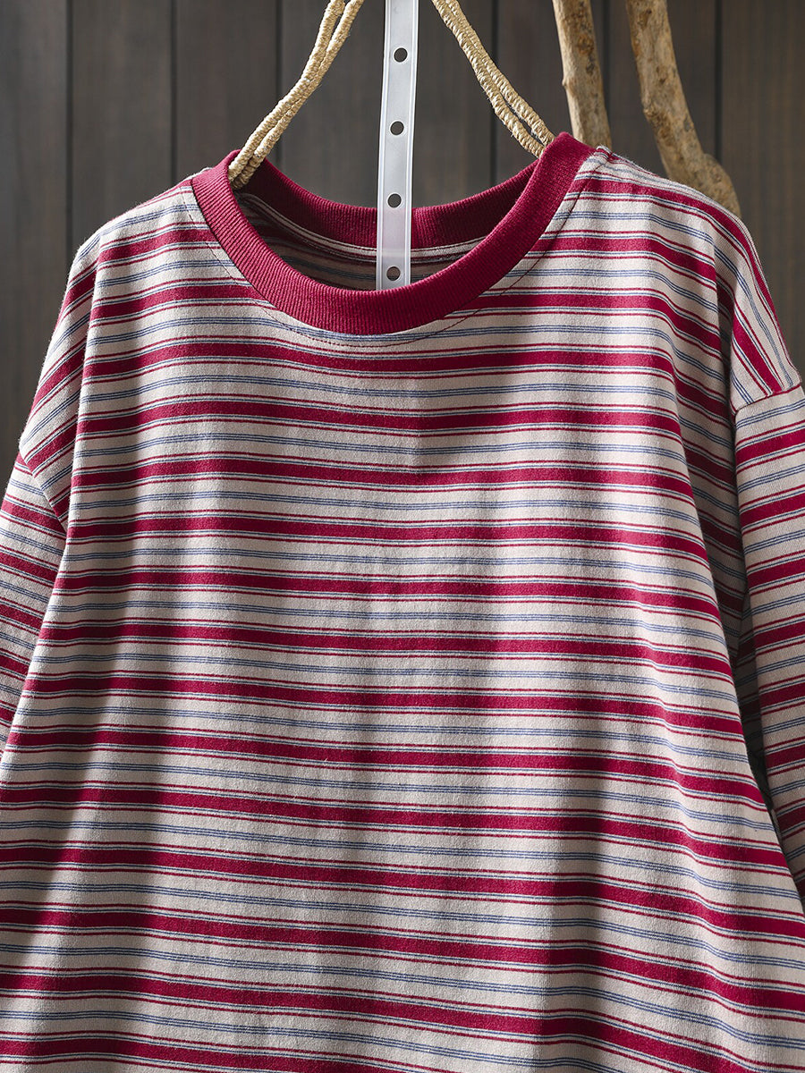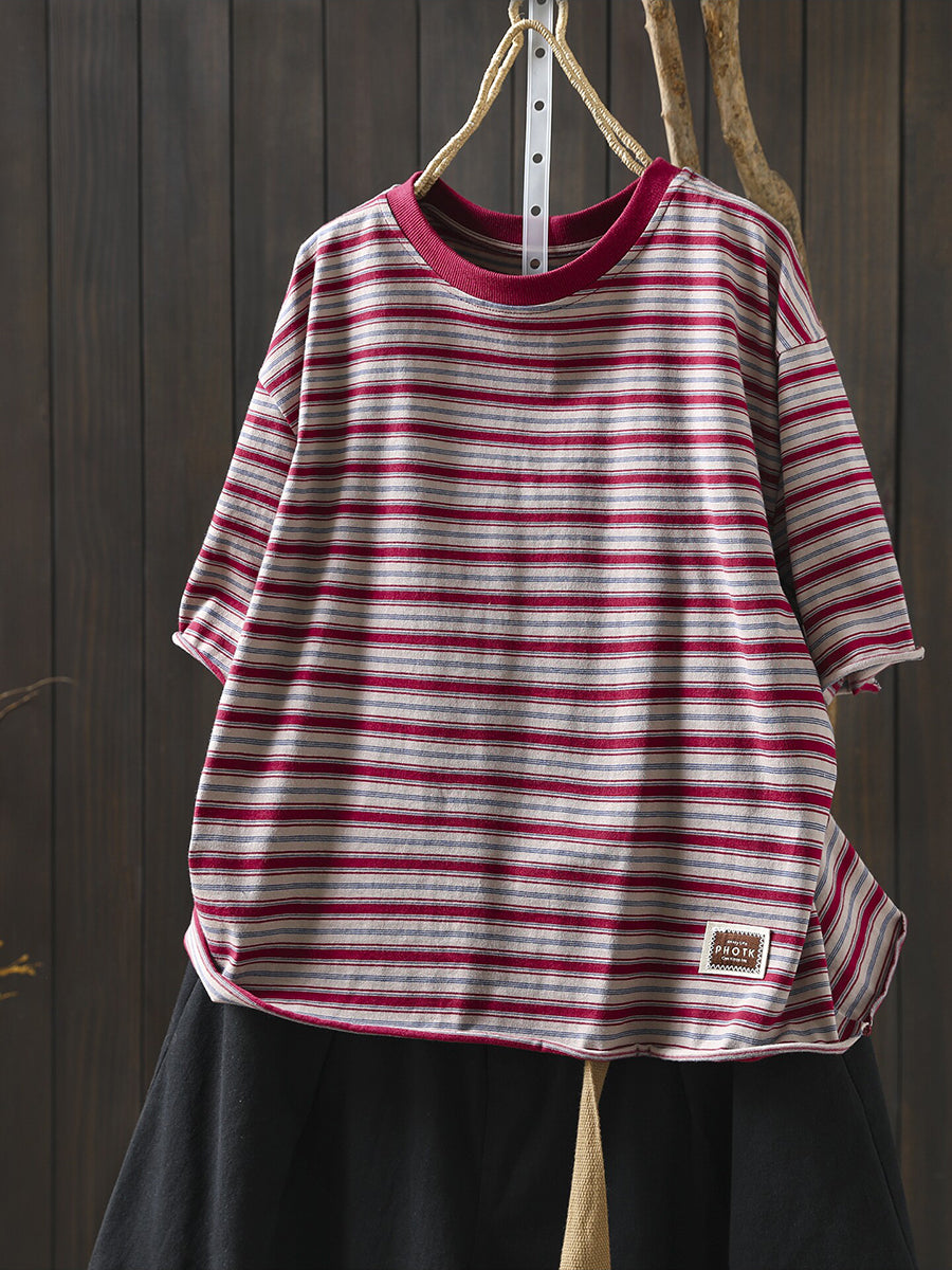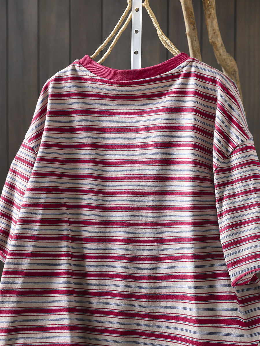 女士夏季條紋圓領100%純棉襯衫