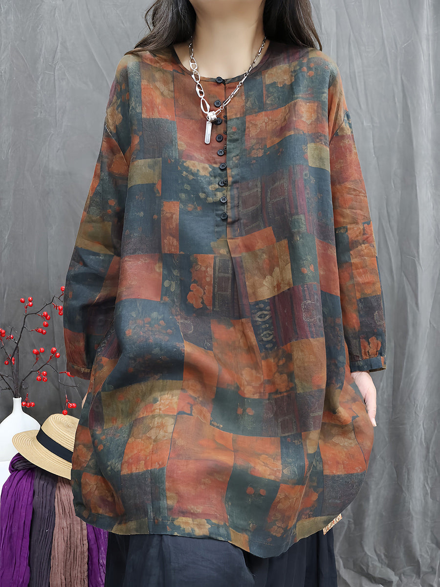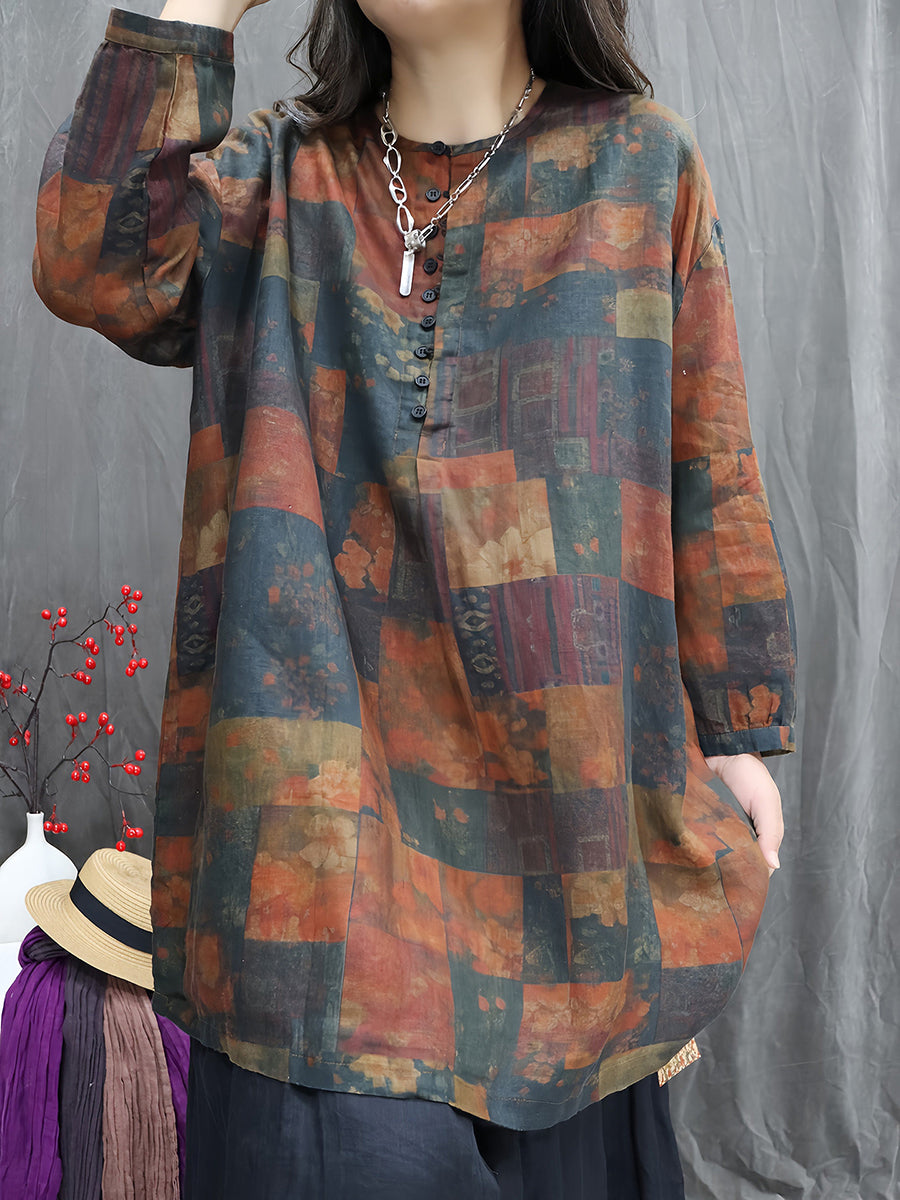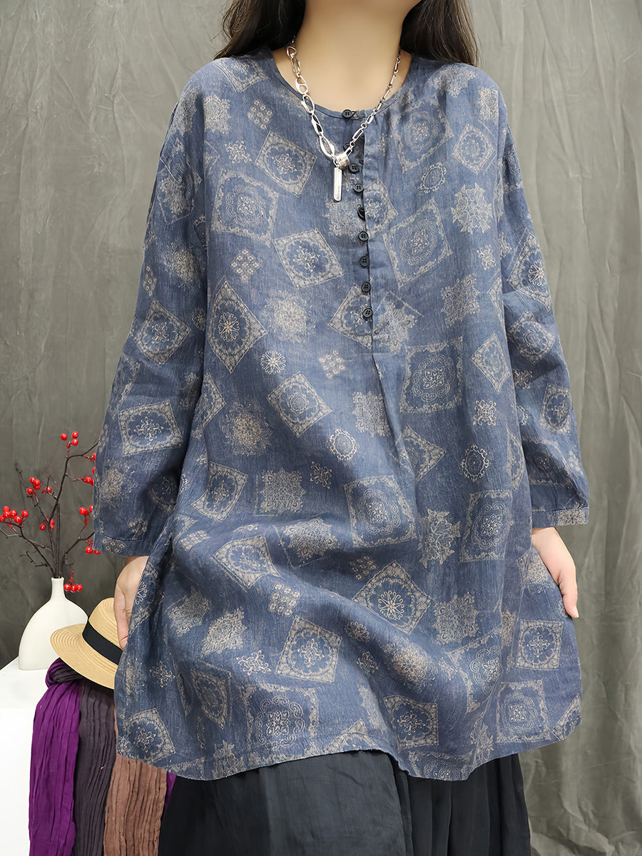 女士藝術風春季花卉圓領100%亞麻襯衫