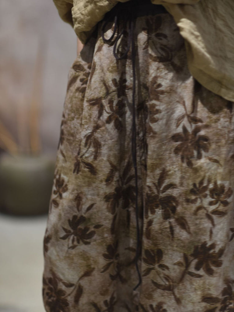 女士夏季復古花卉亞麻直筒褲