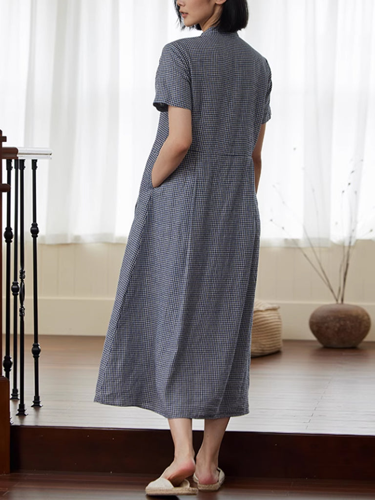 女士夏季格子立領 100% 亞麻寬鬆連身裙