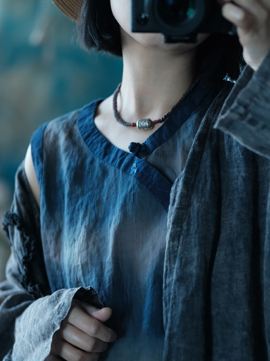 這款背心採用優質苧麻製成,具有獨特的紮染圖案,時尚的 V 領設計散發著藝術氣息。這款單品非常適合溫暖天氣,是時尚女性春夏衣櫥的必備單品。