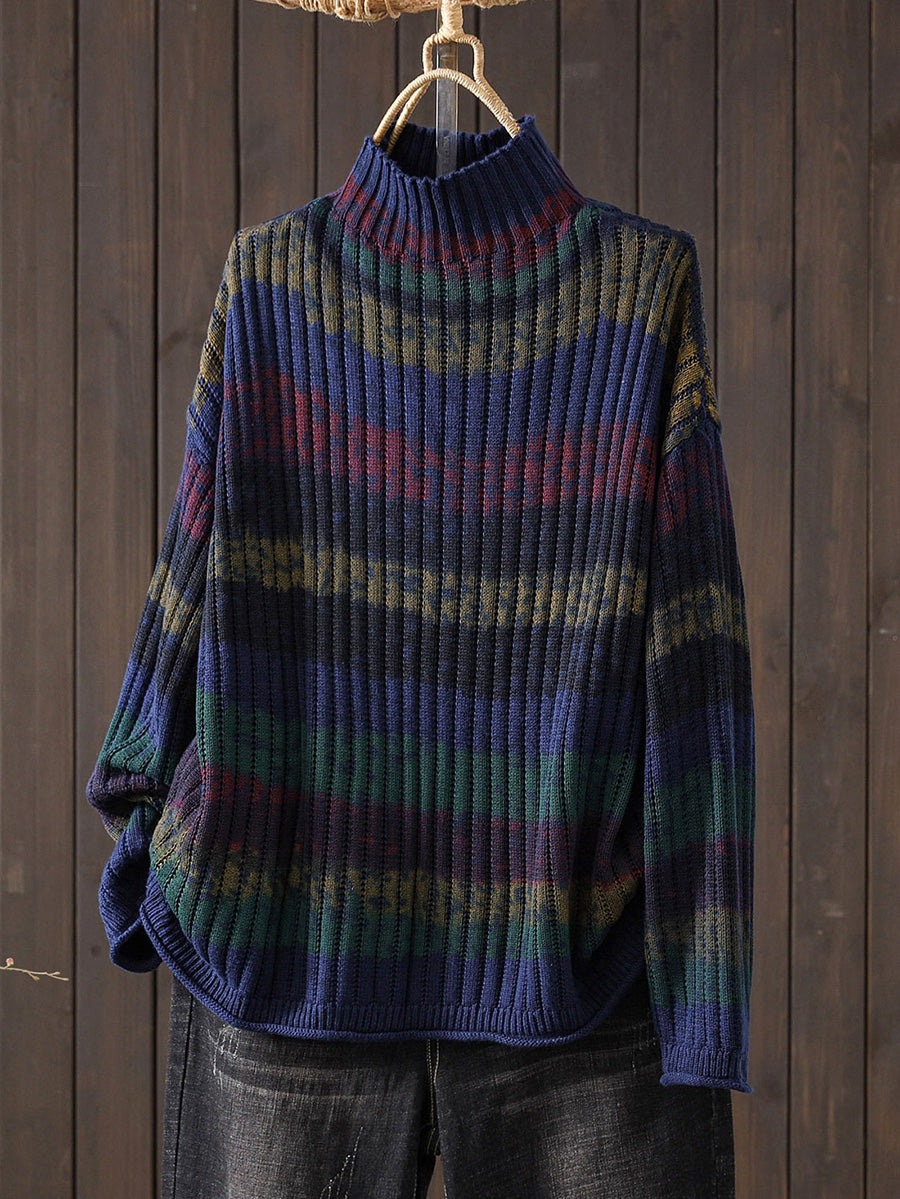 這款毛衣採用條紋圖案,半高領設計,全長插肩袖,復古設計。它完美融合了經典風格和季節性舒適感,是春秋季節的理想選擇。