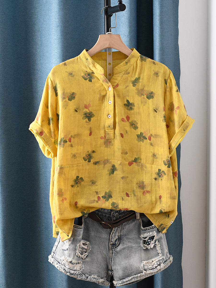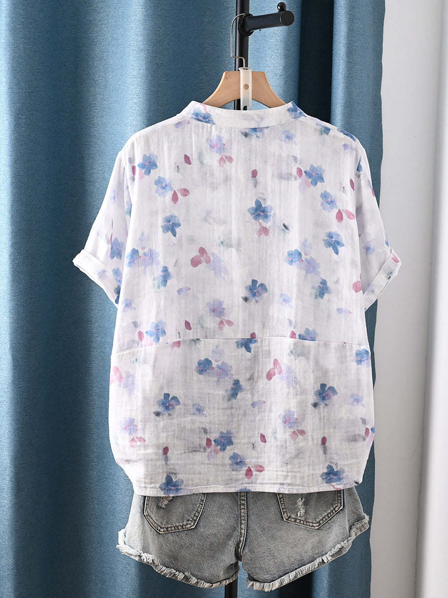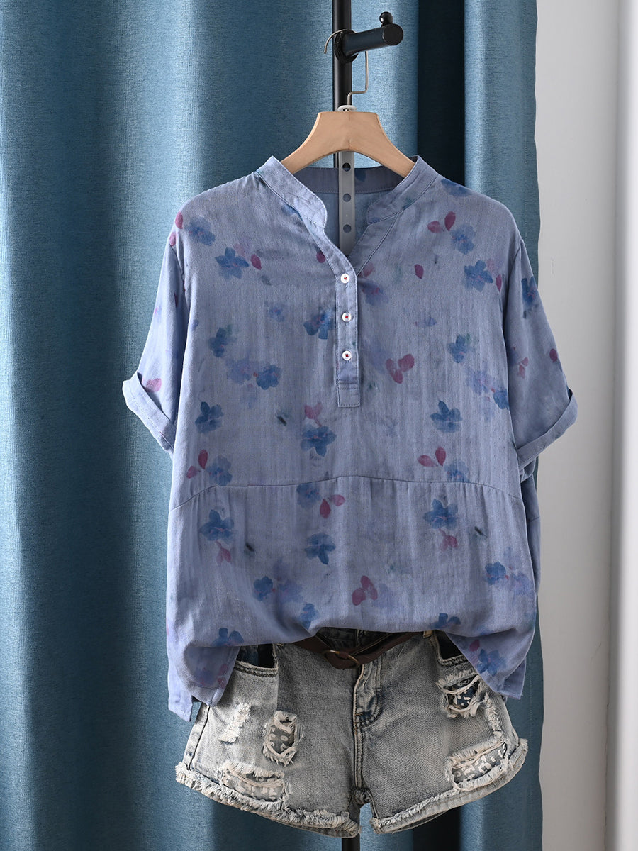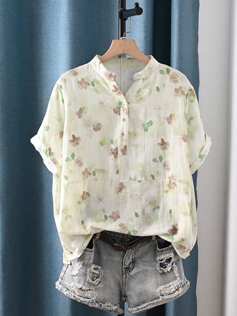 女士夏季藝術風花卉100%純棉V領襯衫