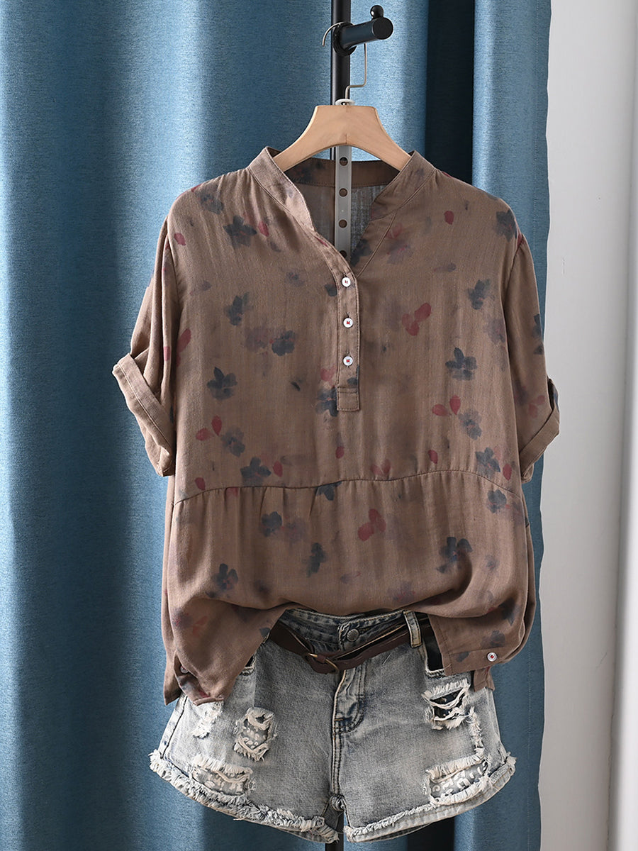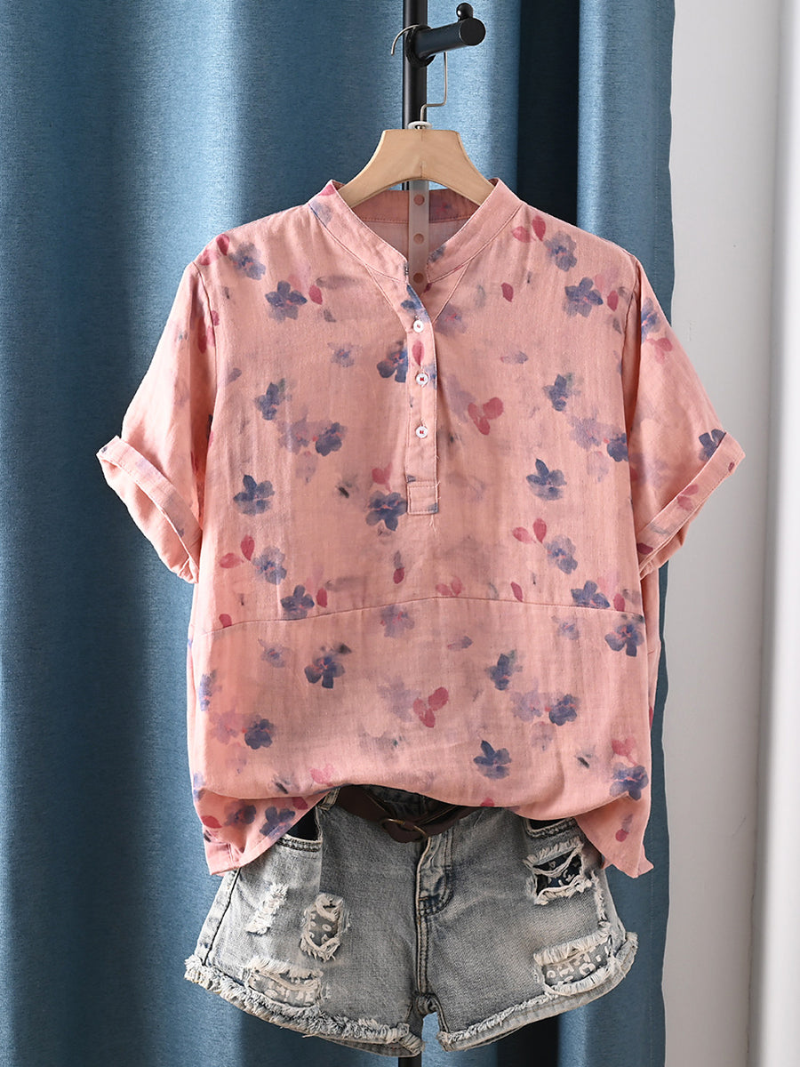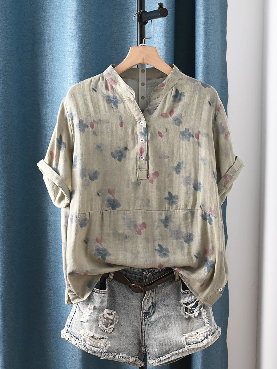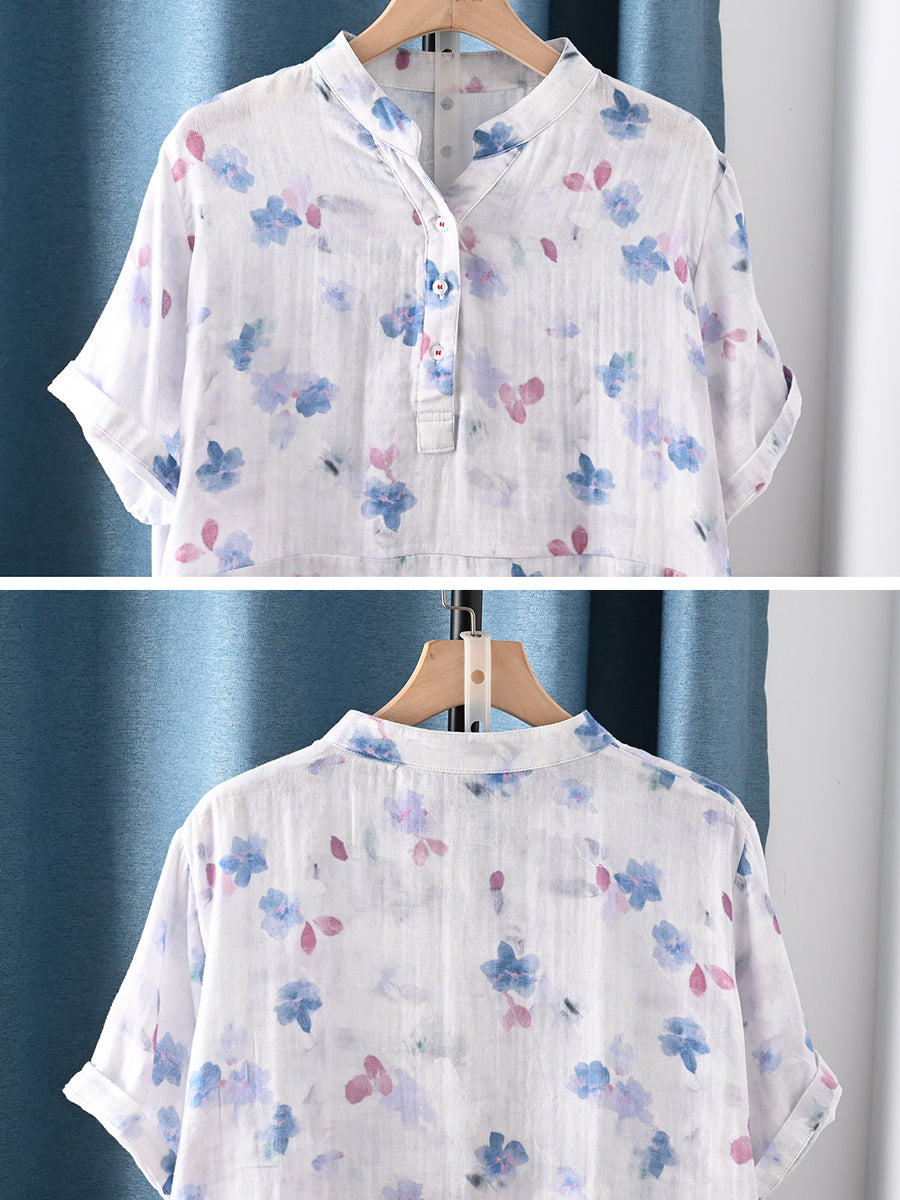 女士夏季藝術風花卉100%純棉V領襯衫