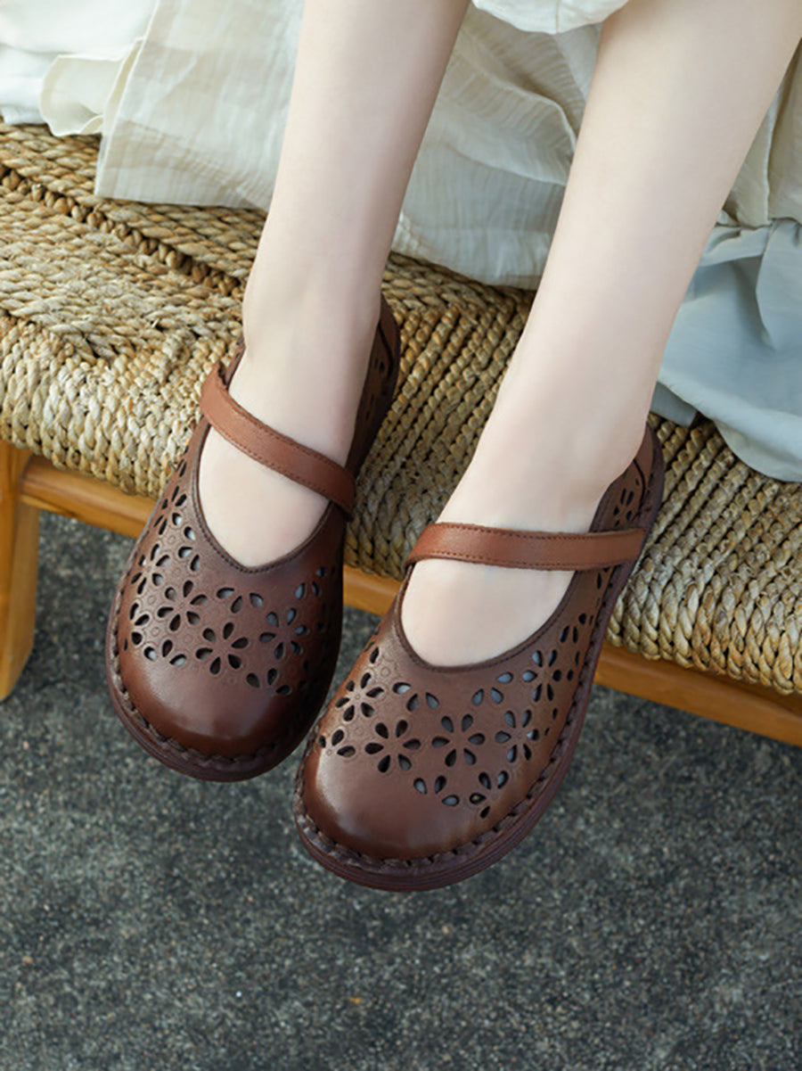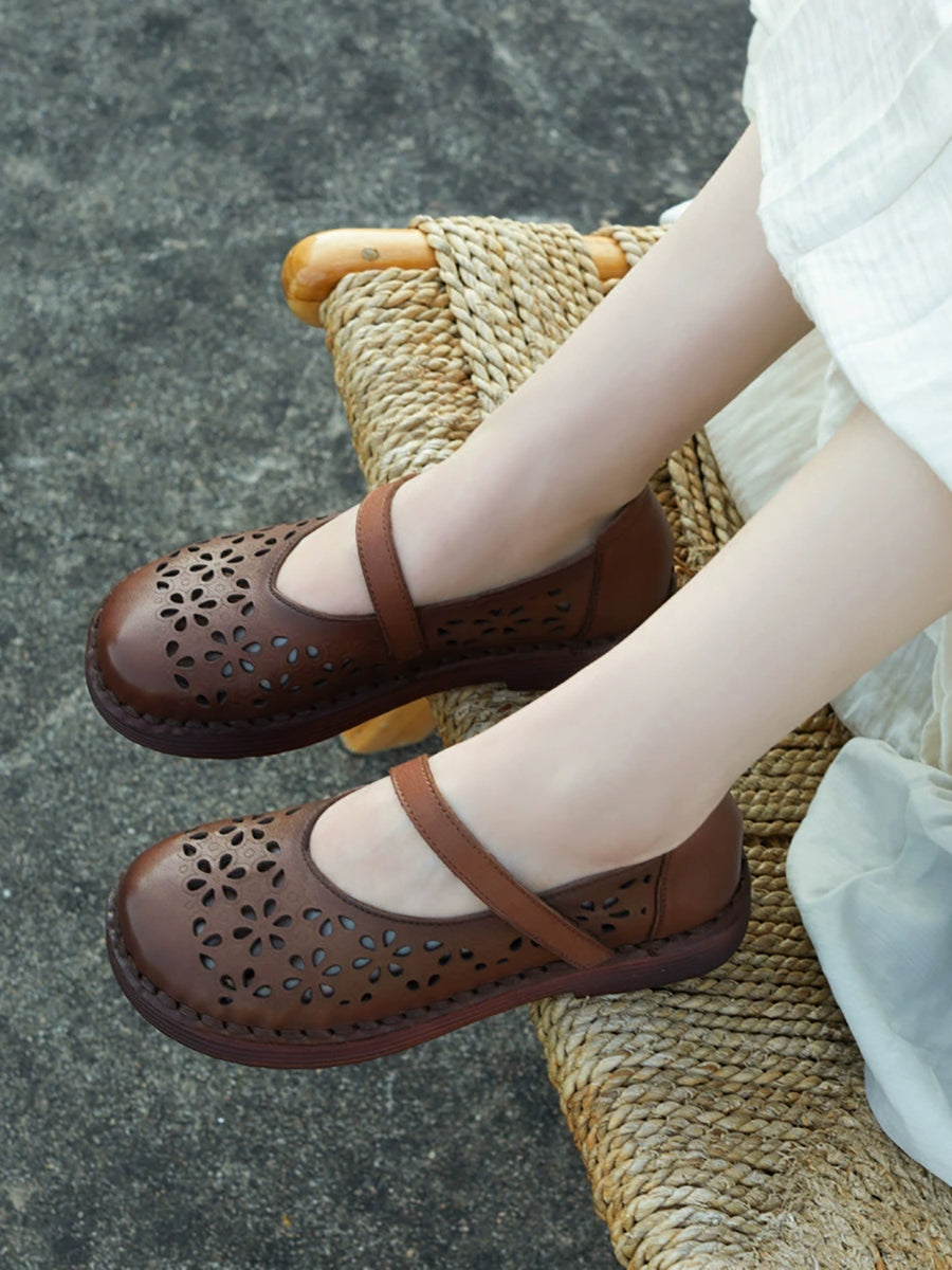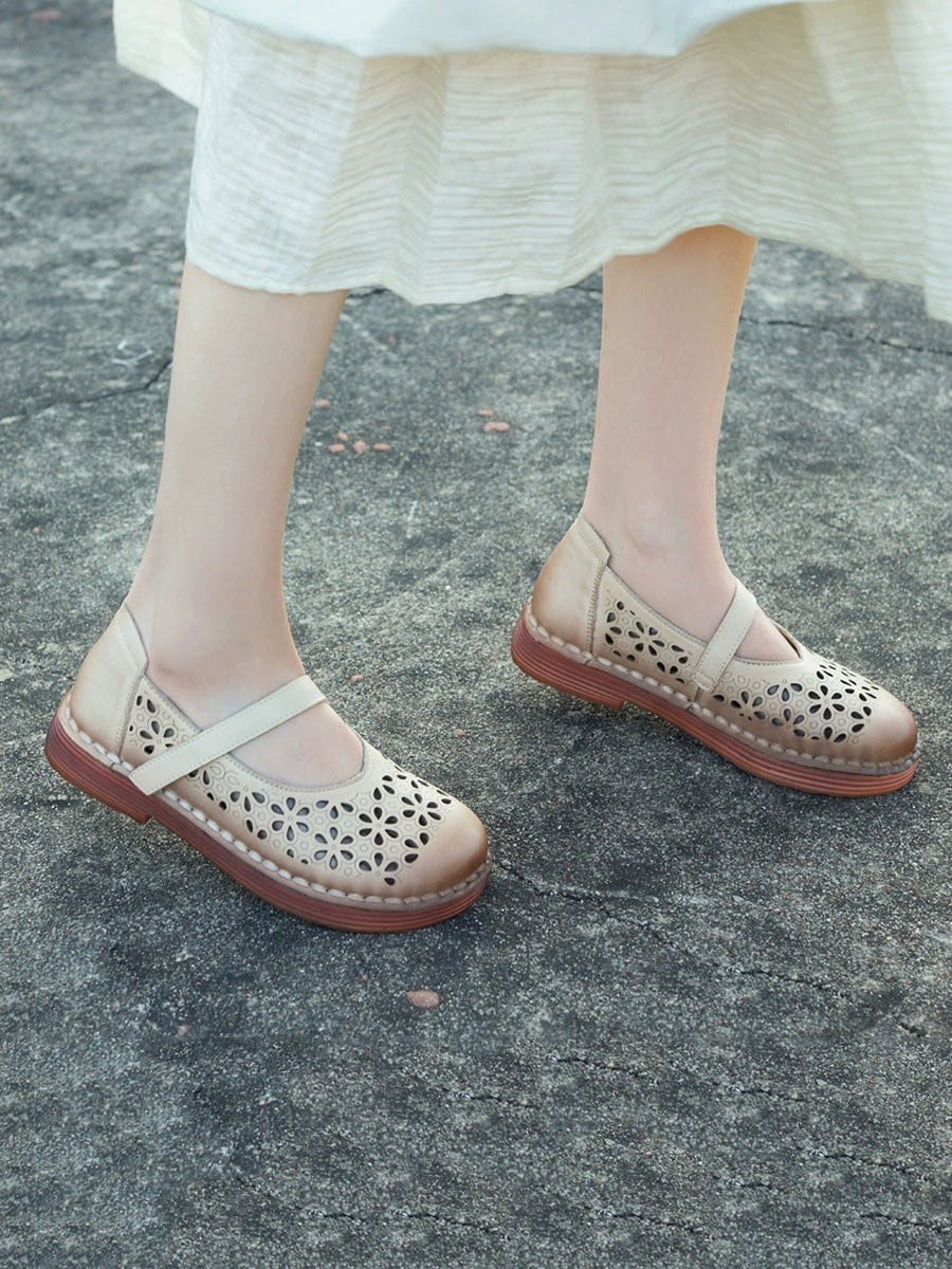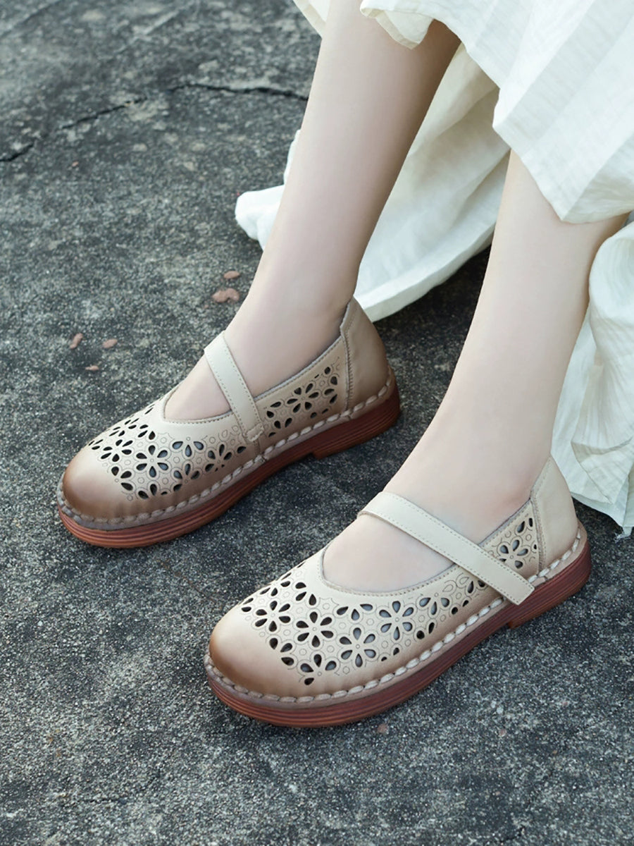 女士夏季真皮鏤空花朵平底鞋
