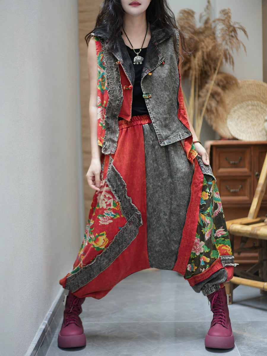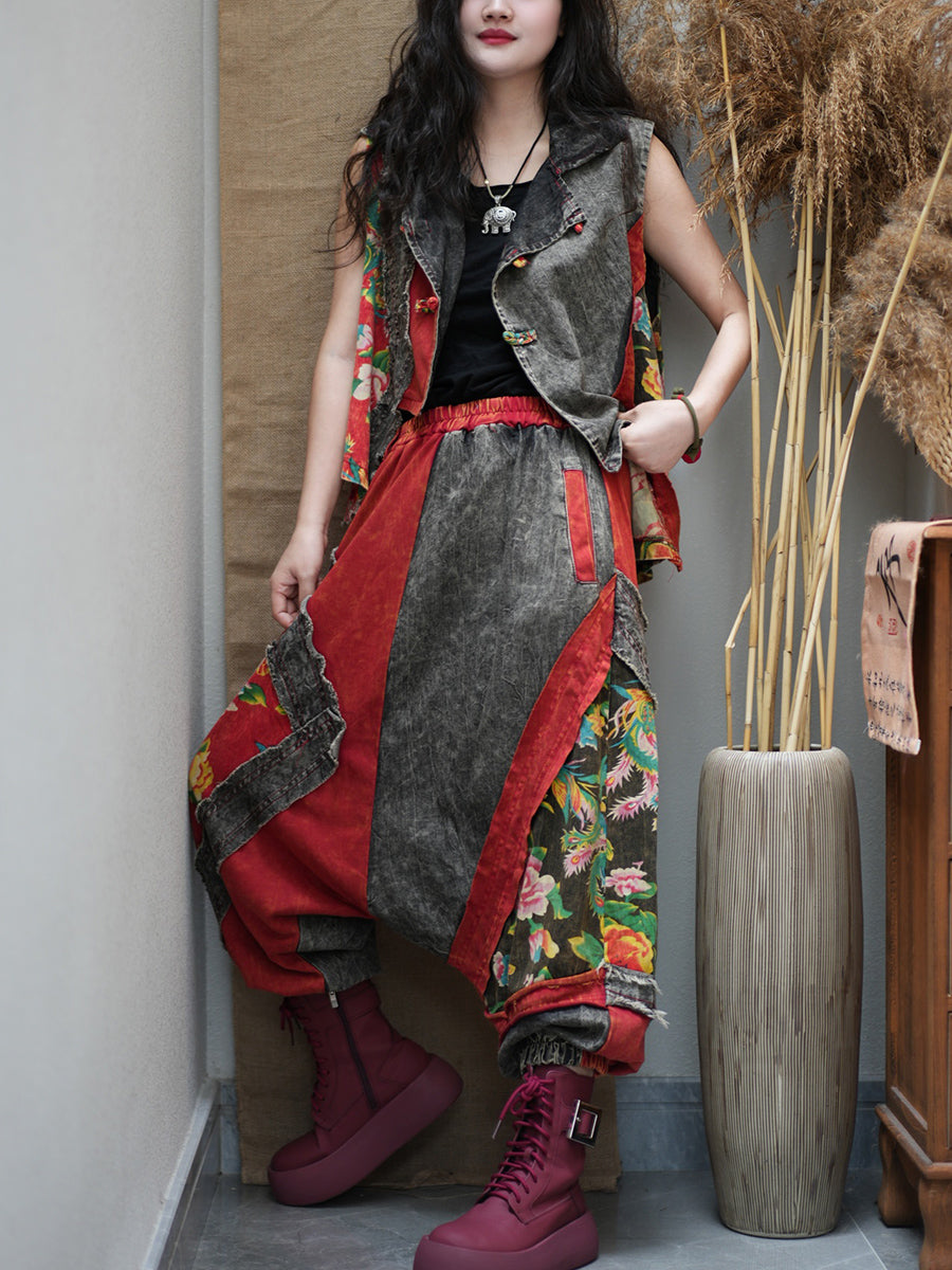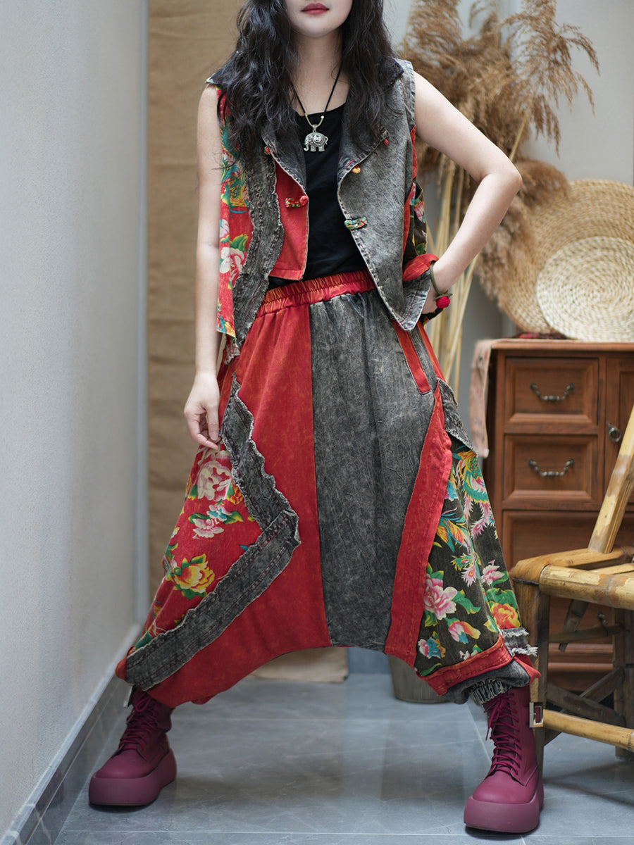 女士夏季復古花朵拼接寬鬆套裝