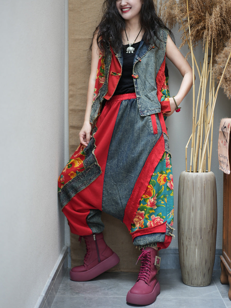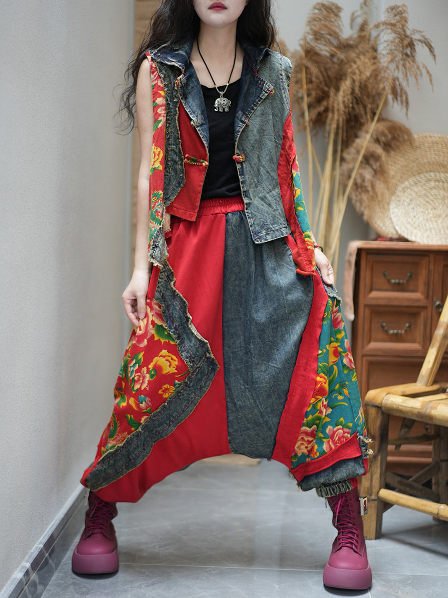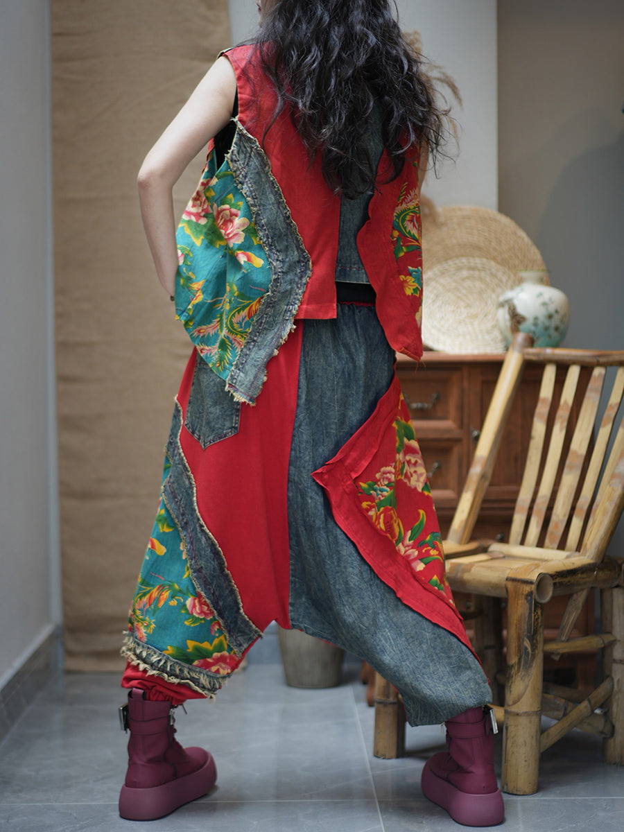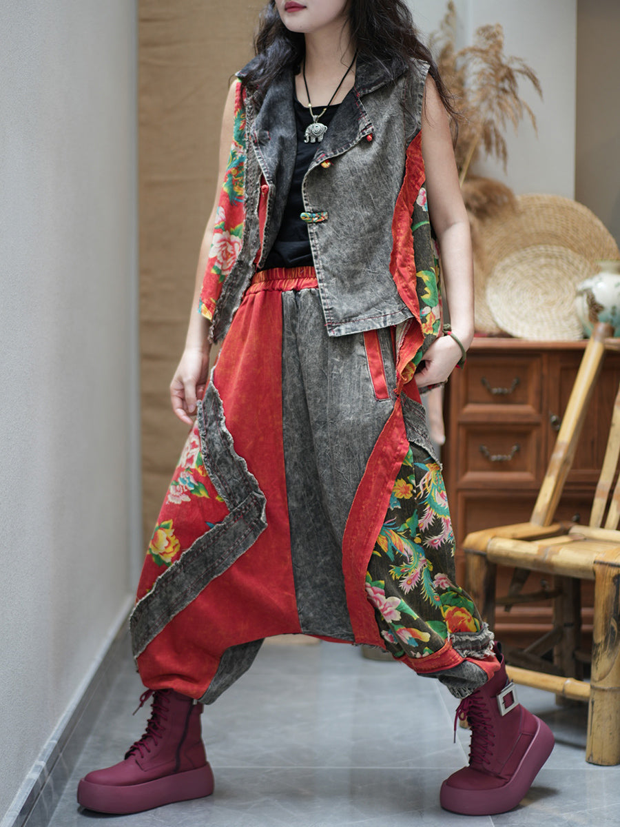 女士夏季復古花朵拼接寬鬆套裝