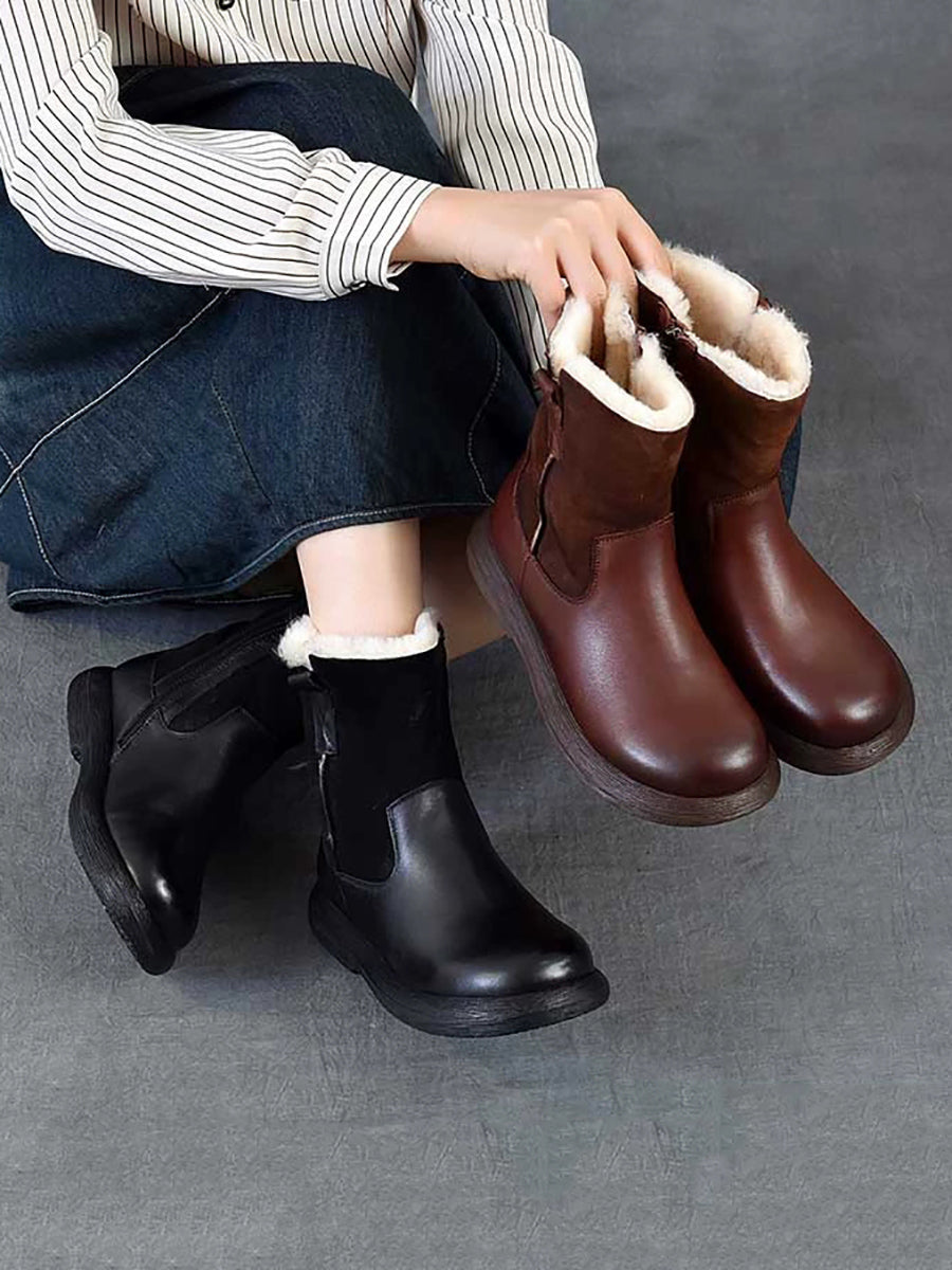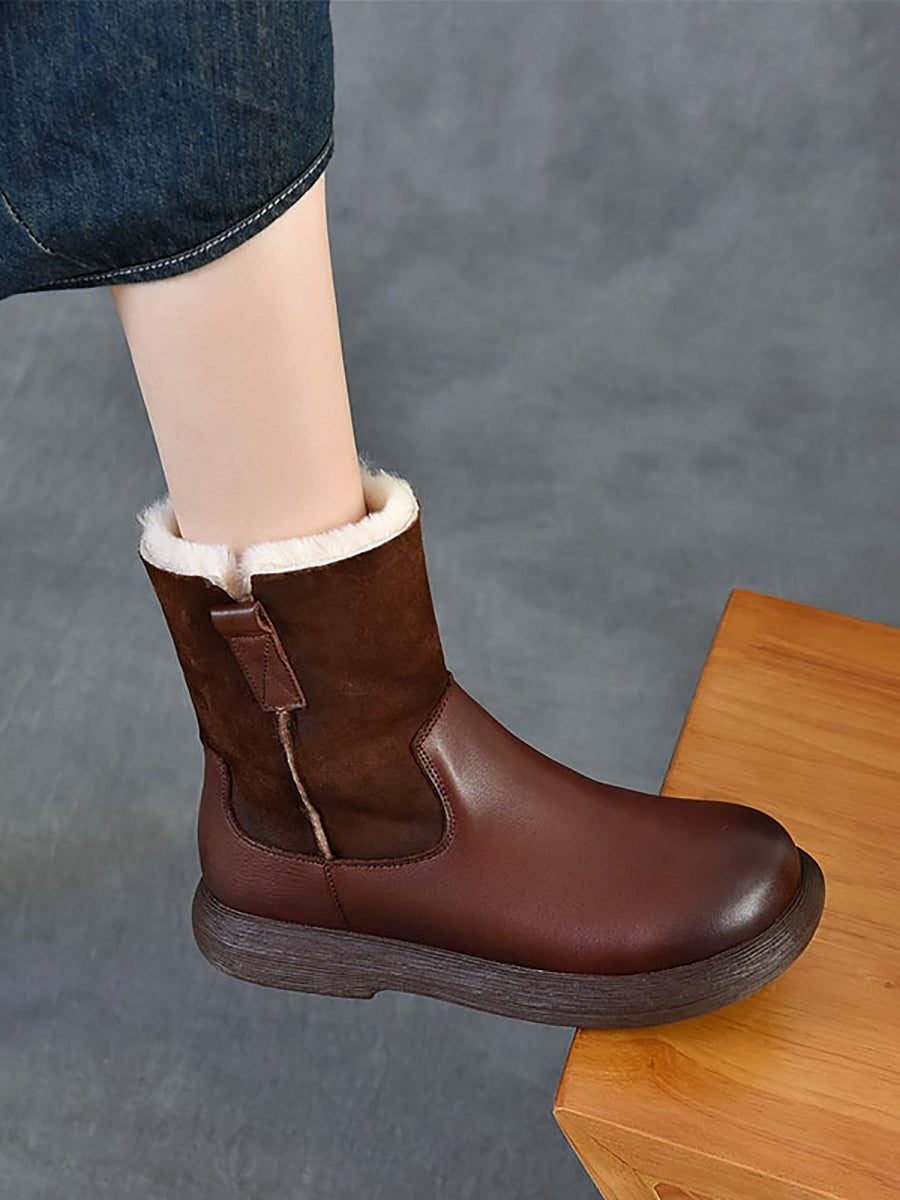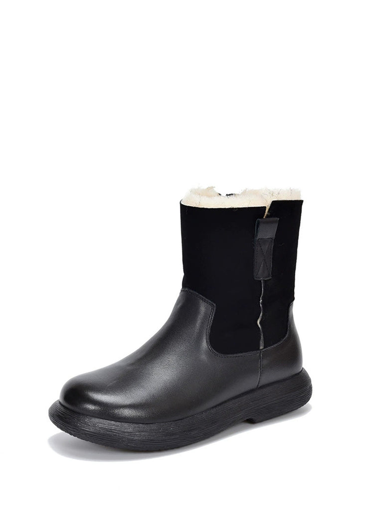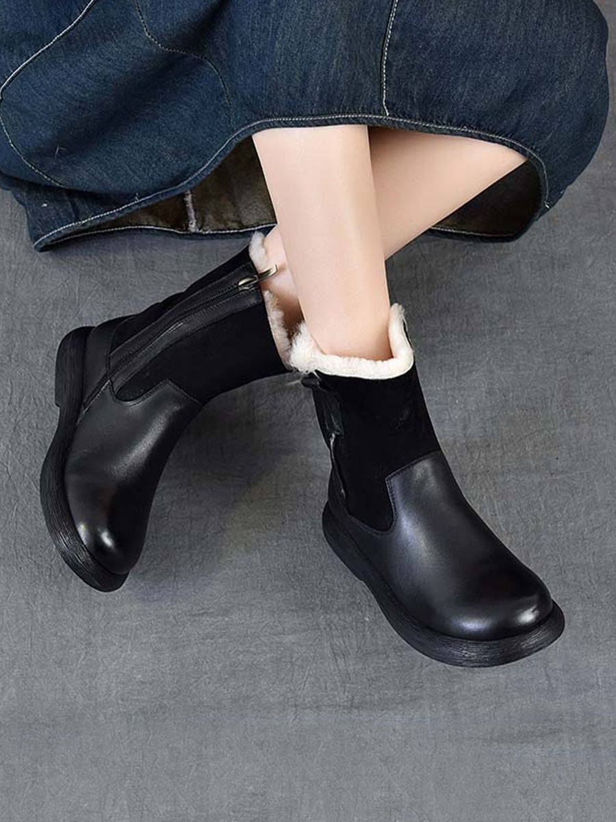 女士冬季復古皮革拼接羊毛內襯靴