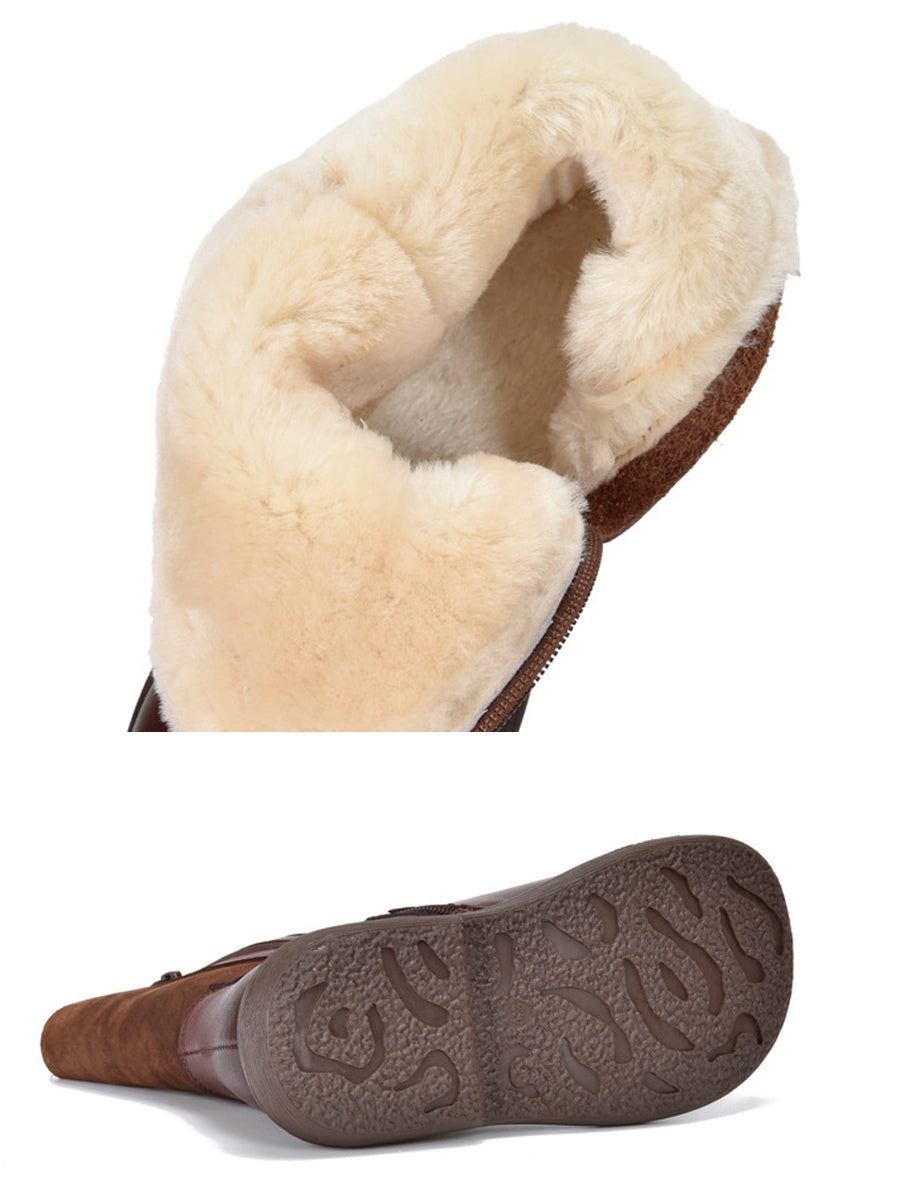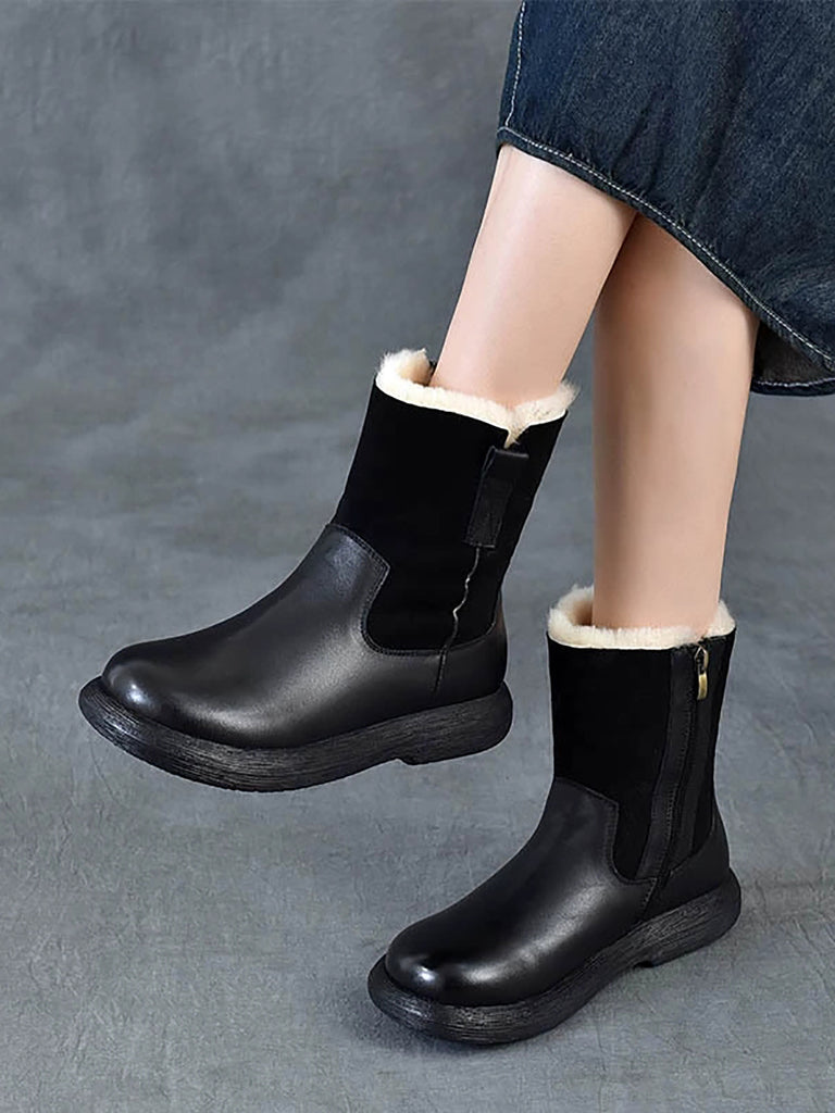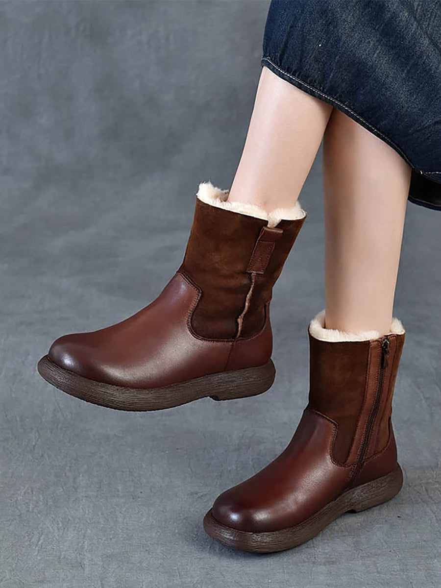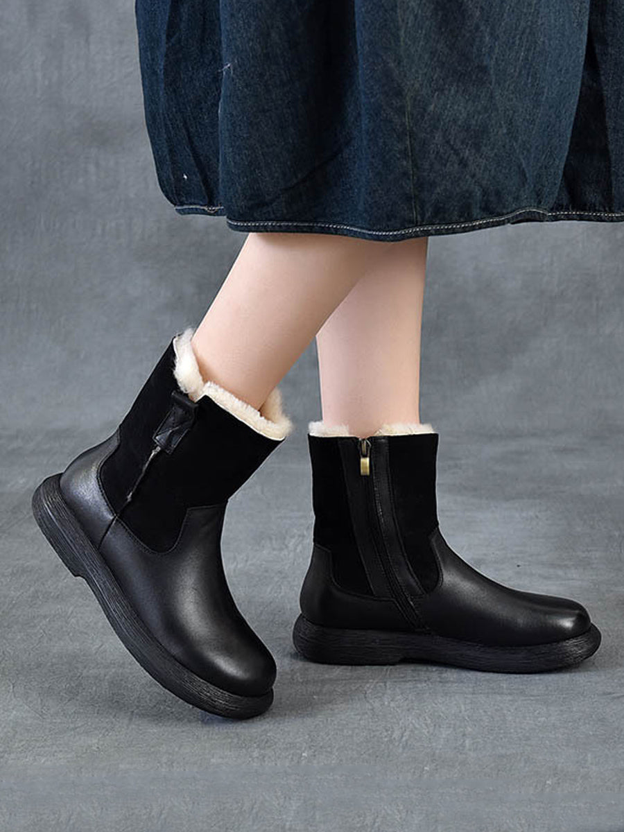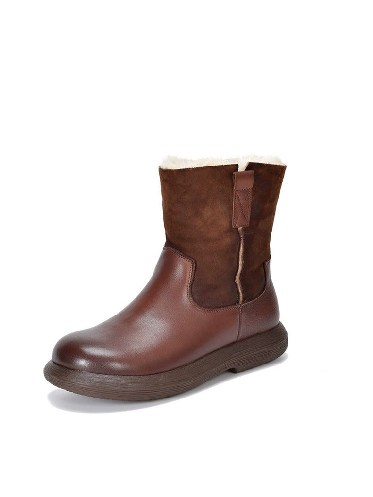 女士冬季復古皮革拼接羊毛內襯靴