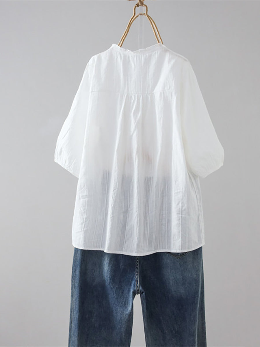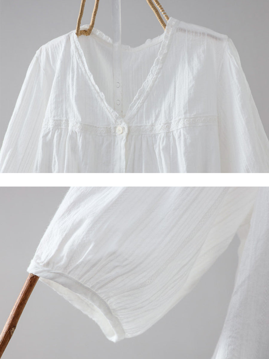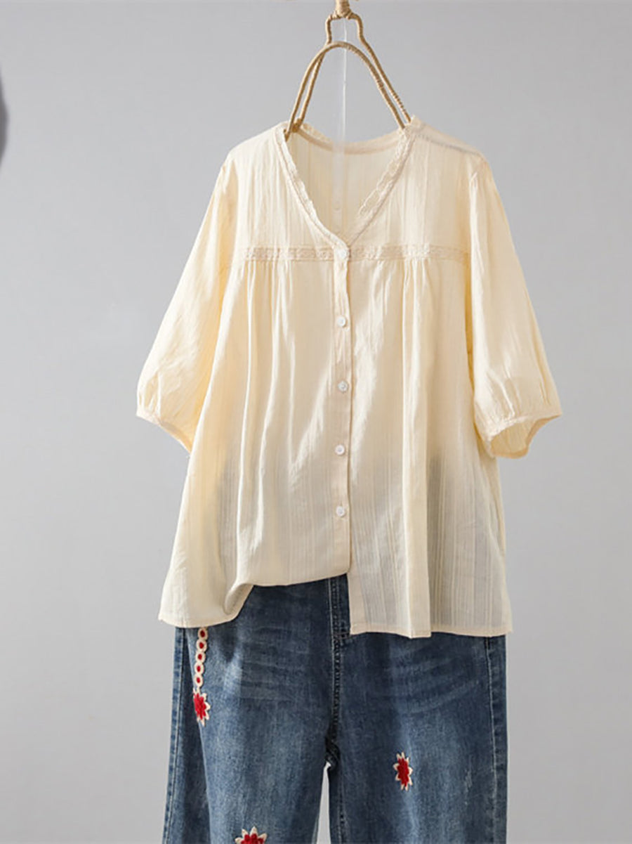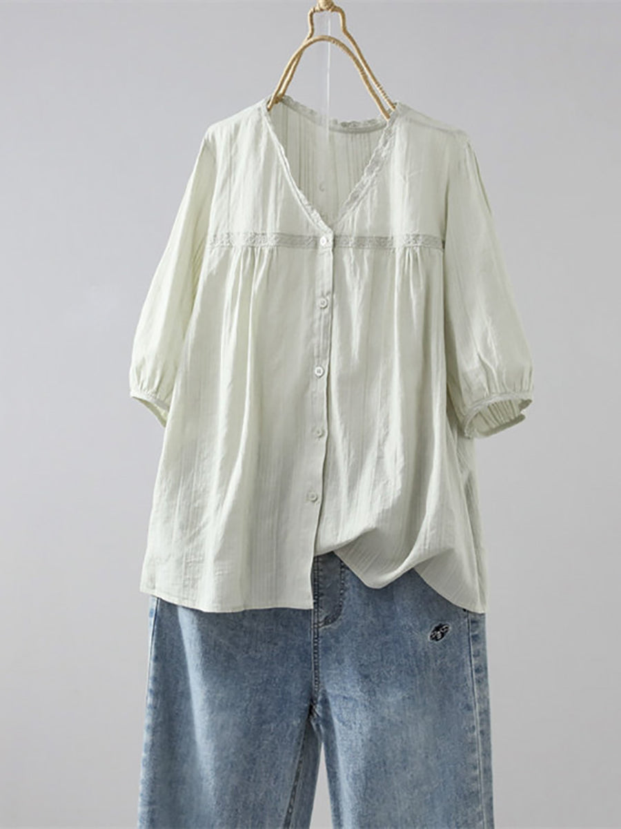 女士夏季藝術純色100%棉V領襯衫