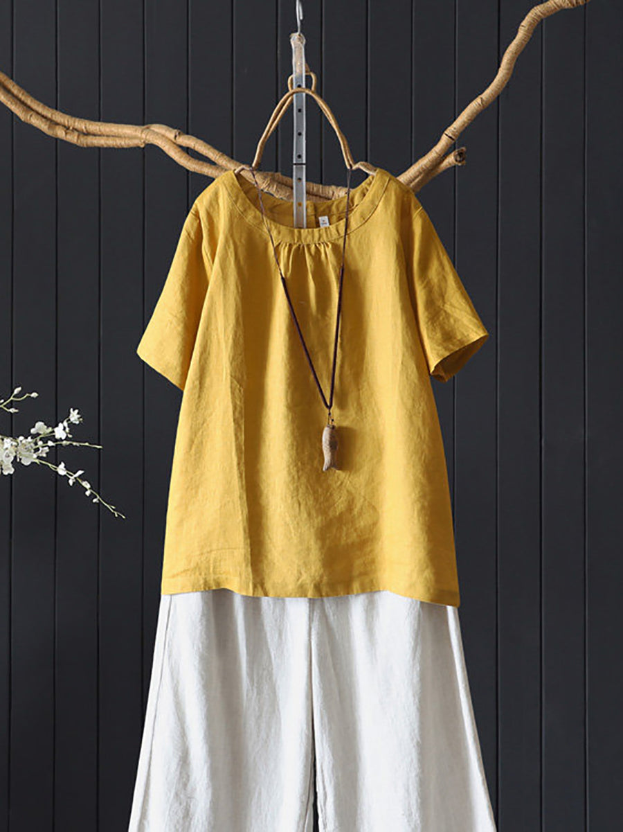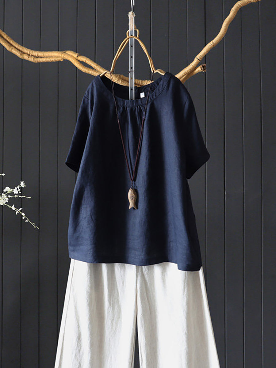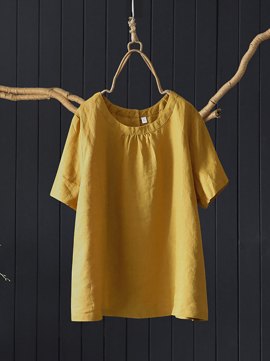 女士夏季藝術純色100%亞麻圓領襯衫