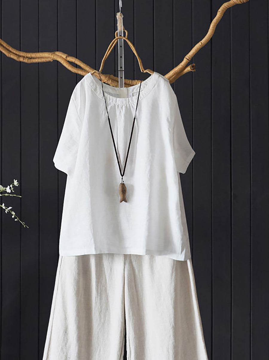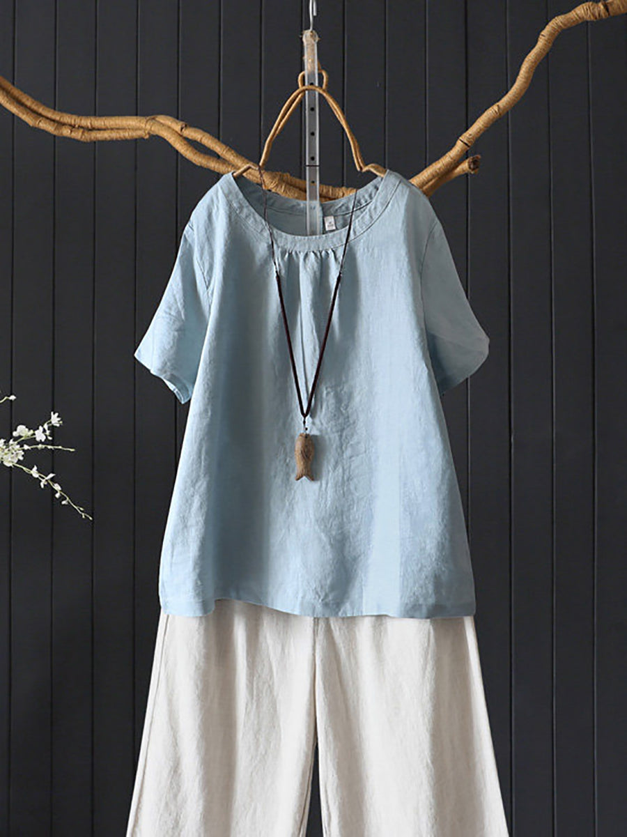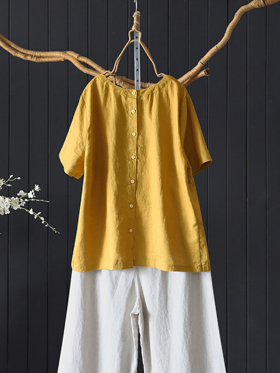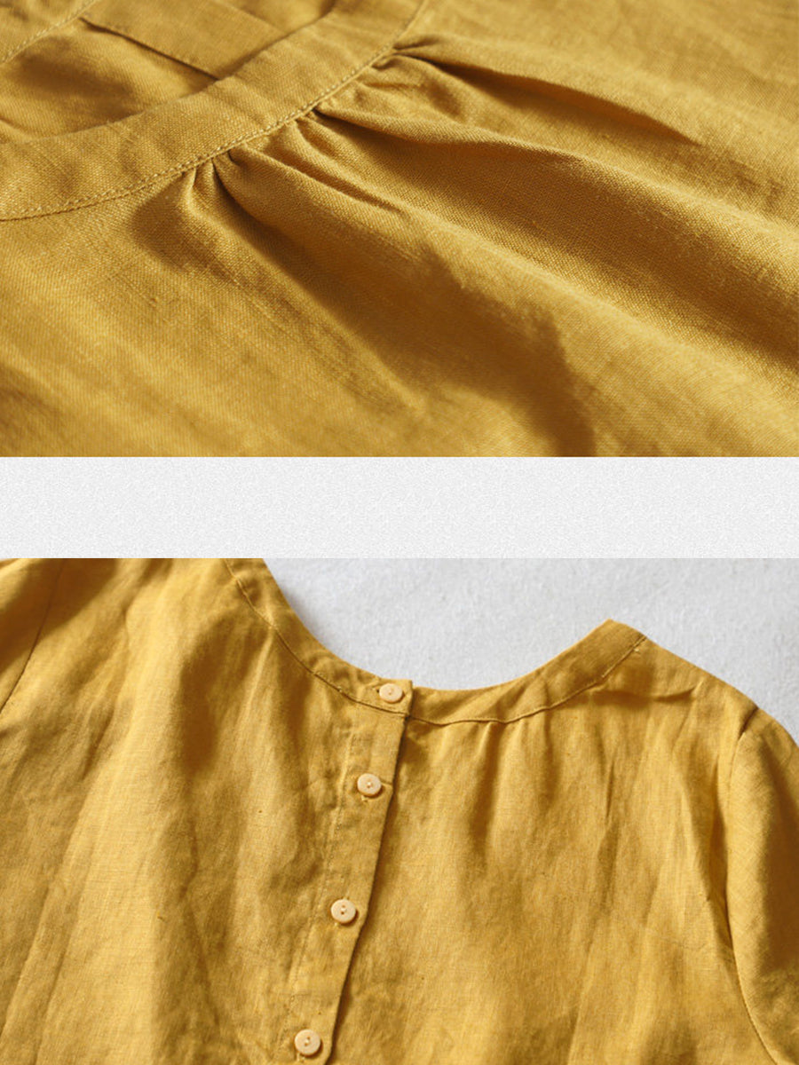 女士夏季藝術純色100%亞麻圓領襯衫