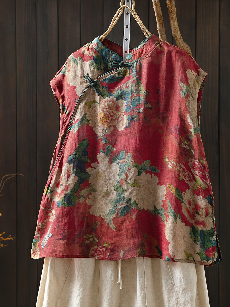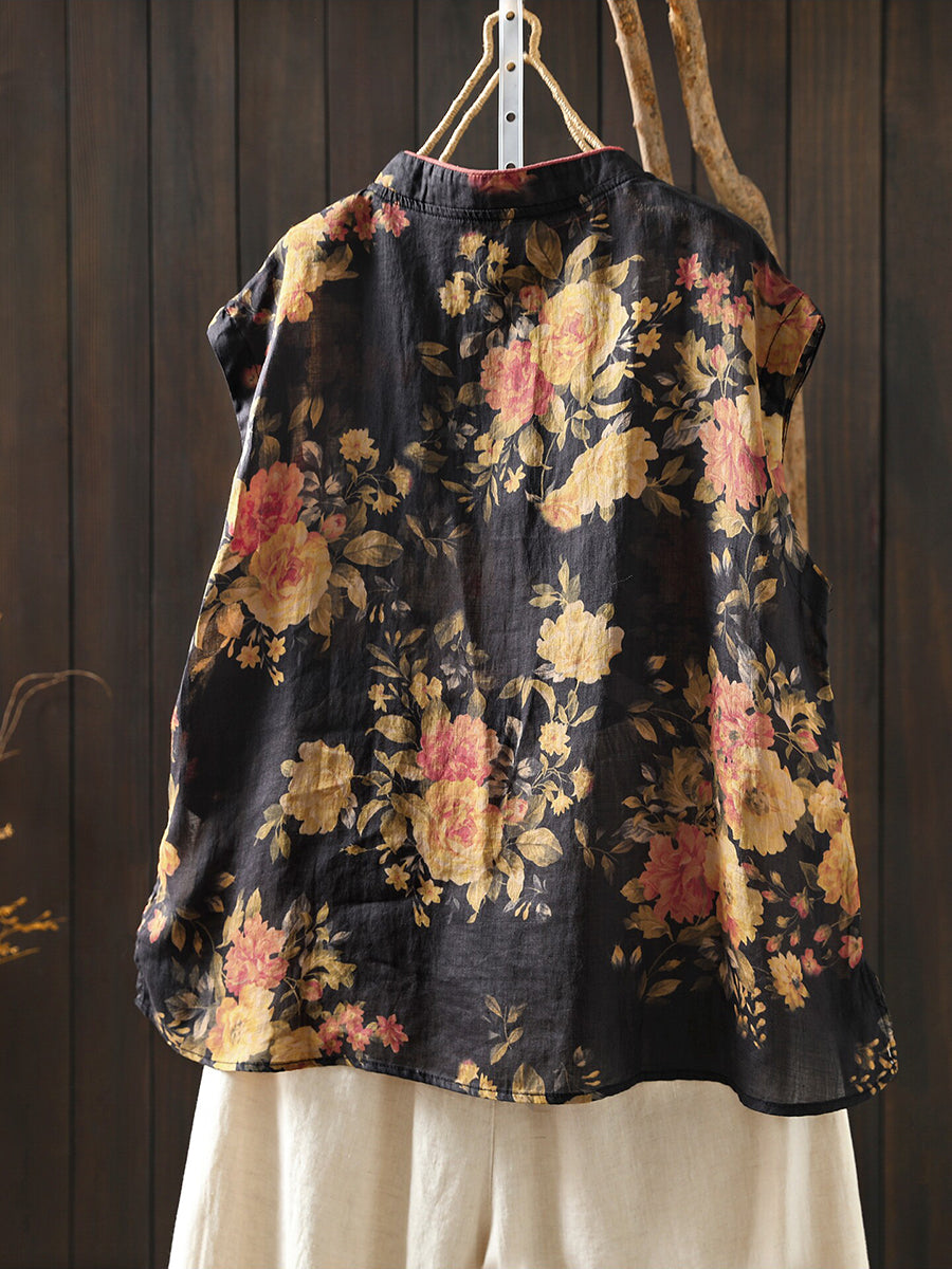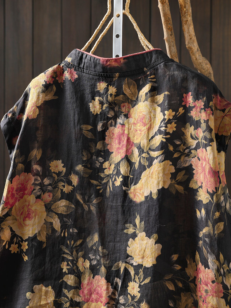 女士夏季民族風花朵立領100%苧麻襯衫