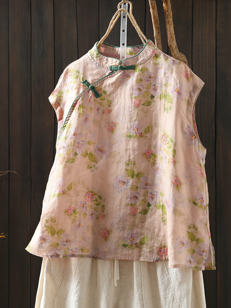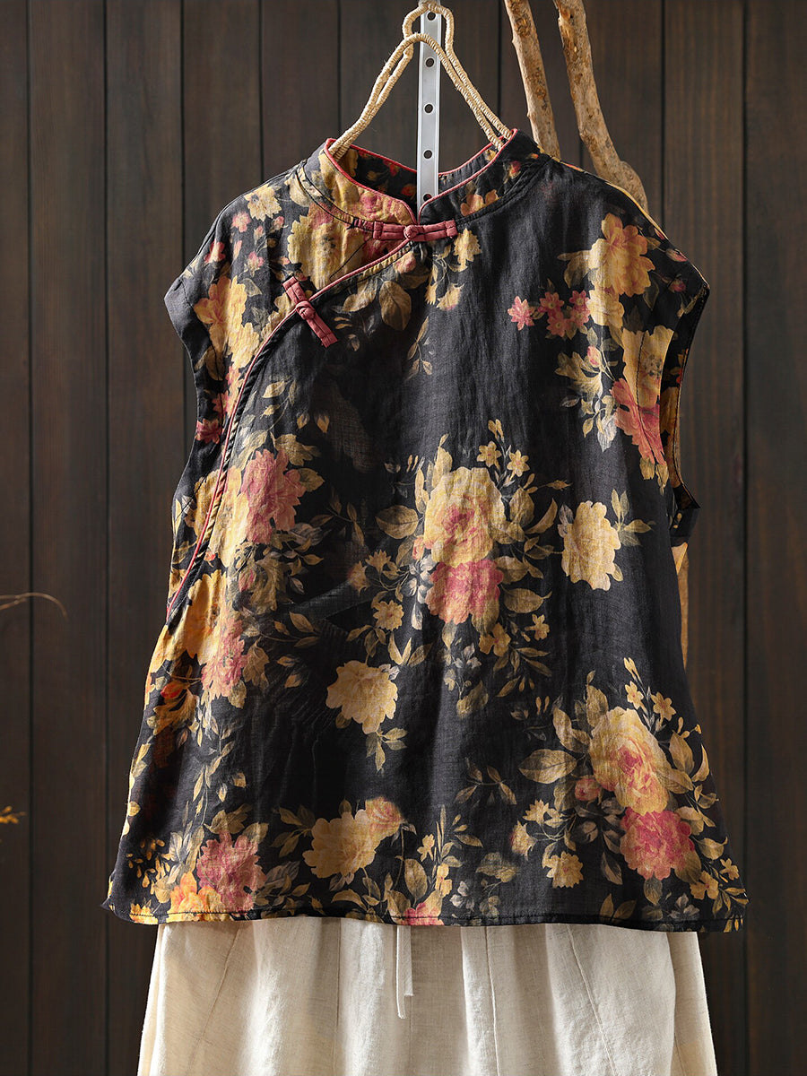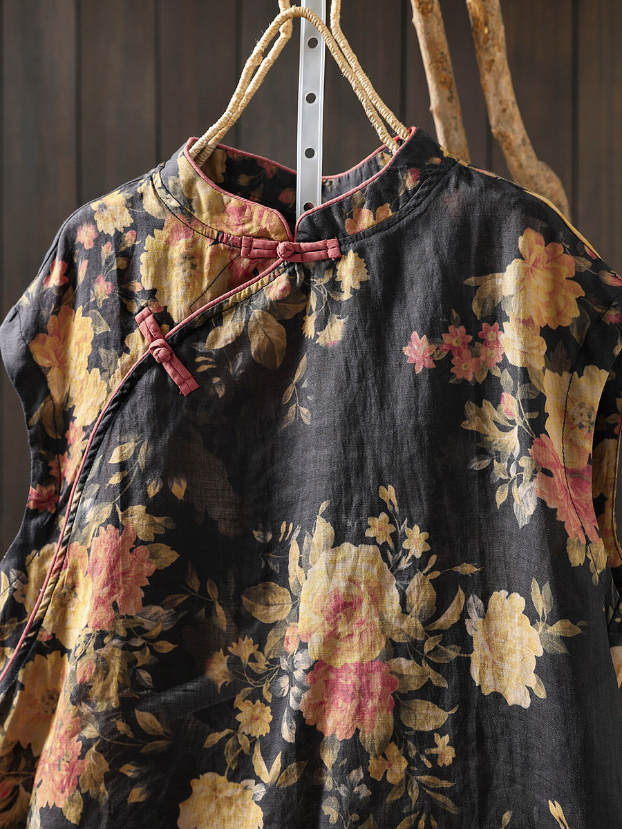 女士夏季民族風花朵立領100%苧麻襯衫