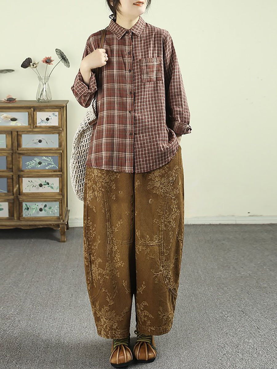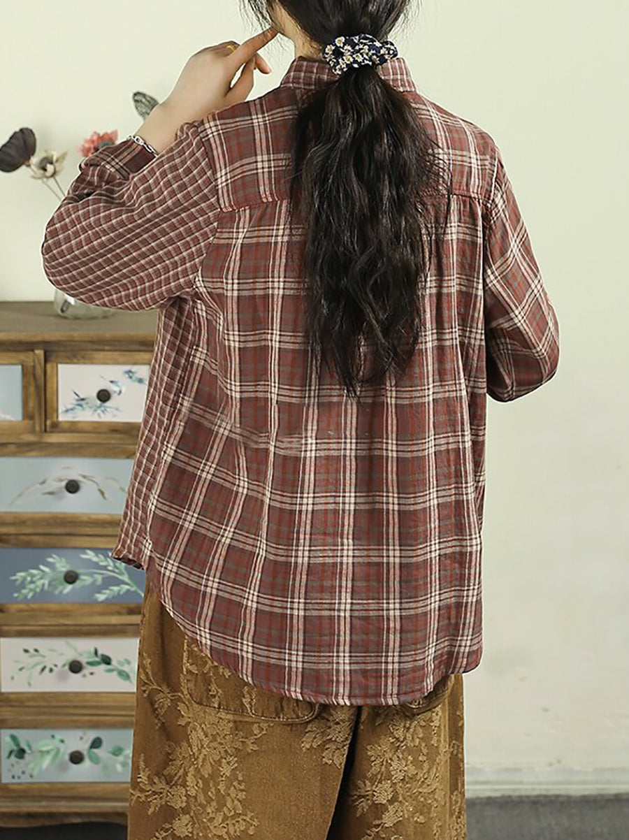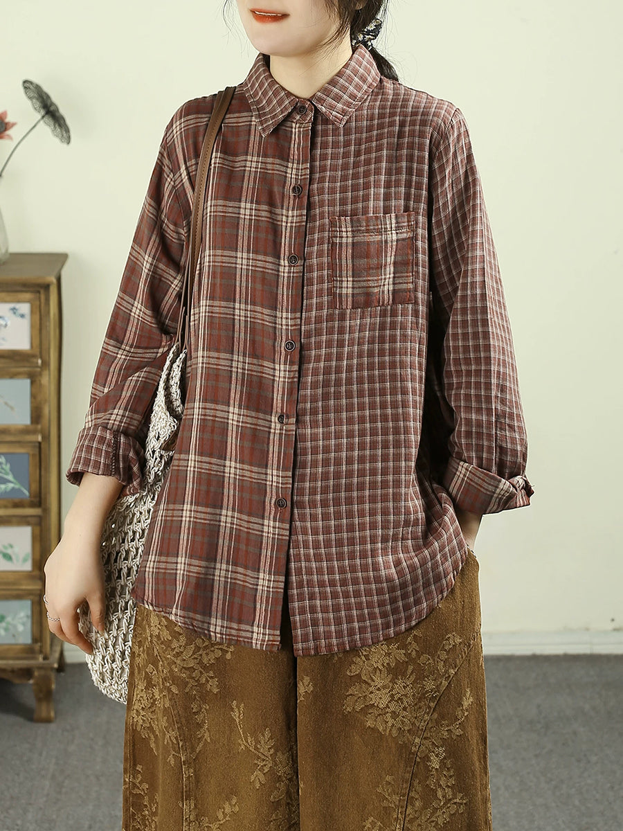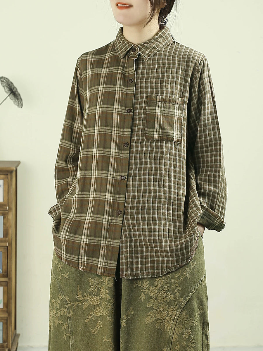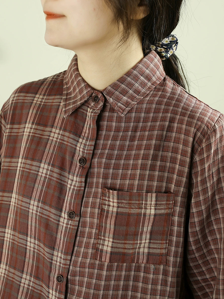 女士復古春季格紋翻領100%純棉襯衫