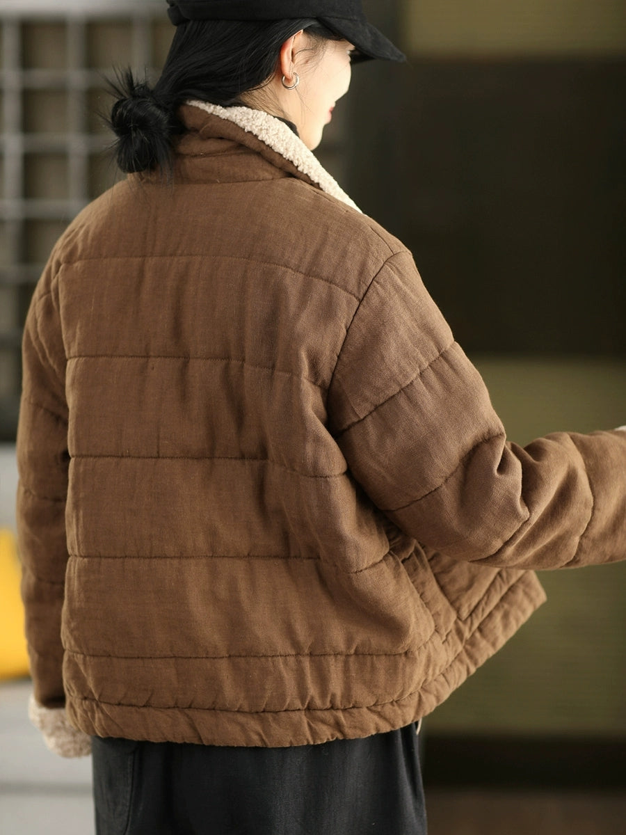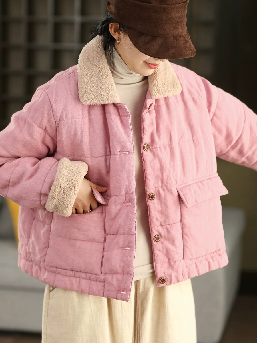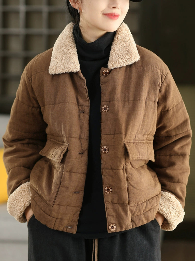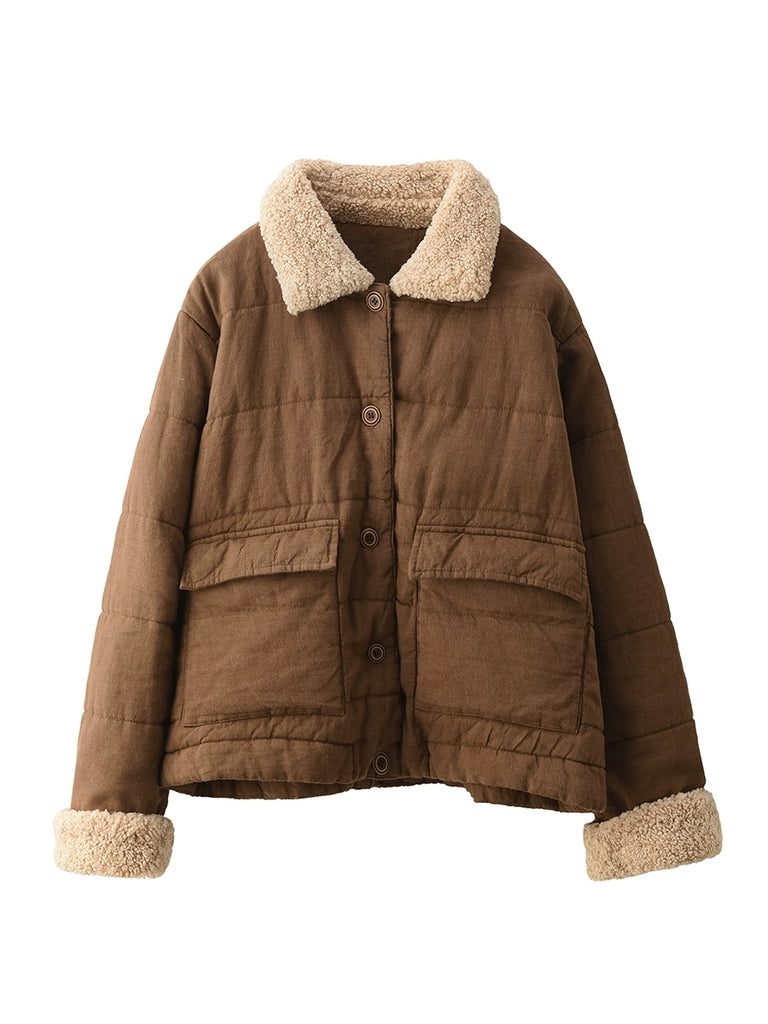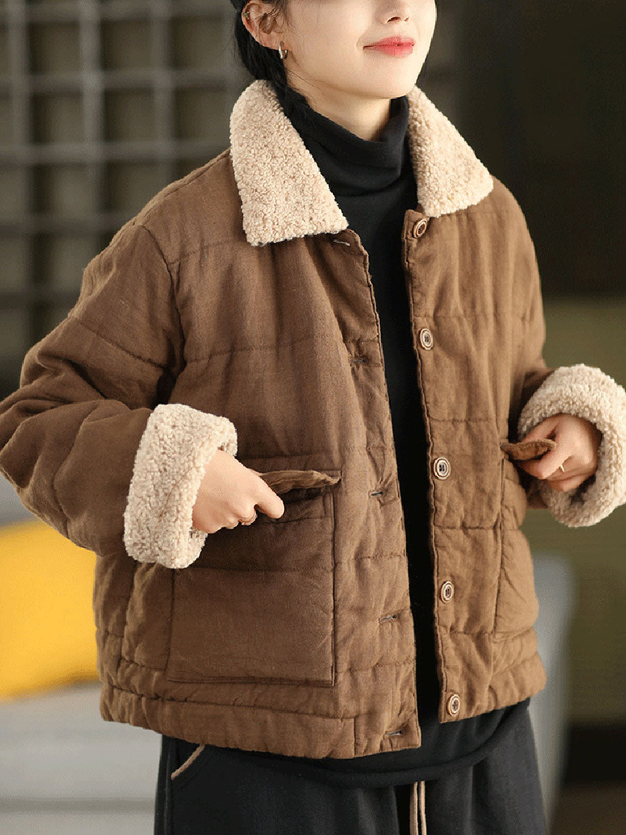女士冬季復古100%亞麻抓絨拼接羽絨服