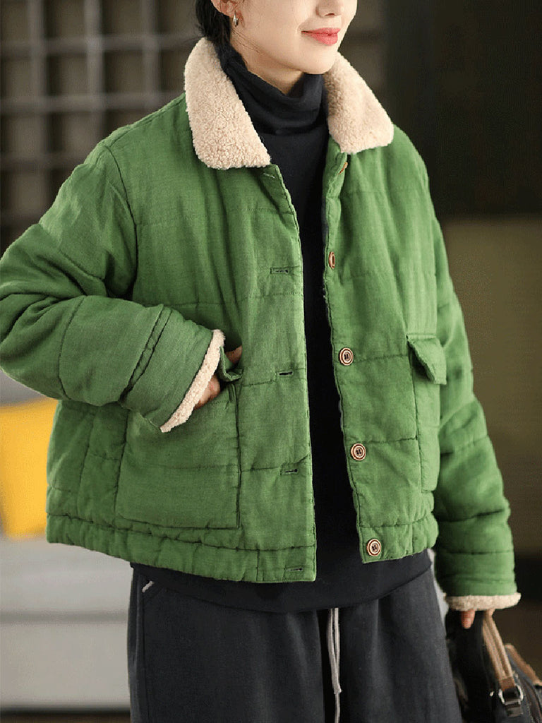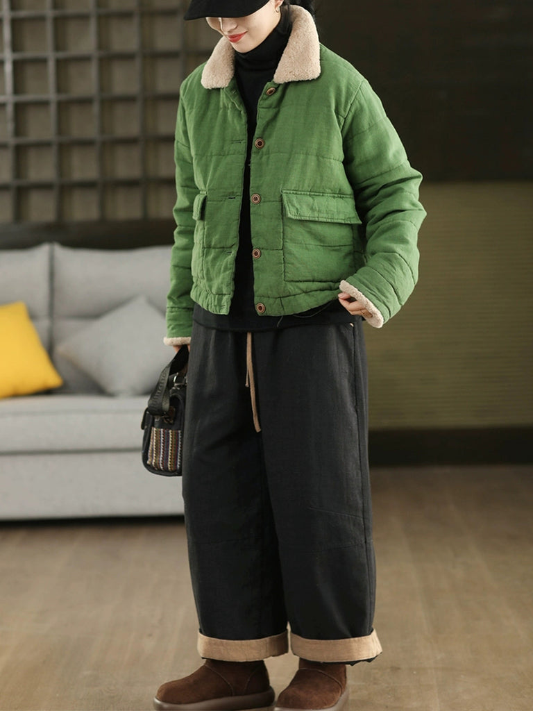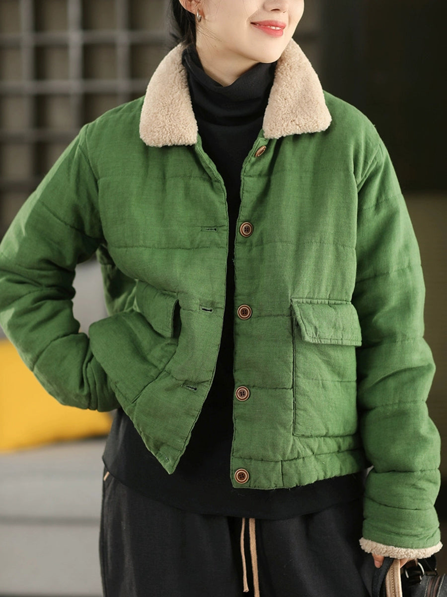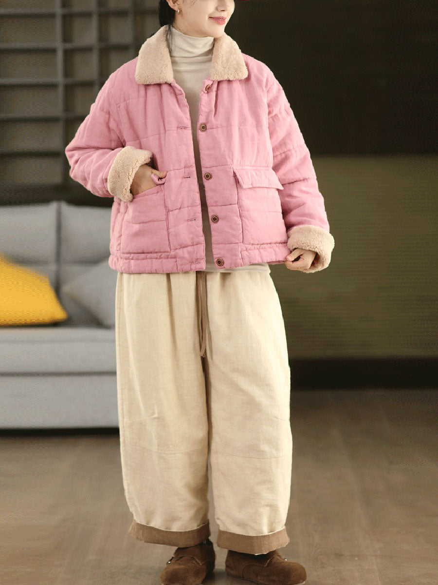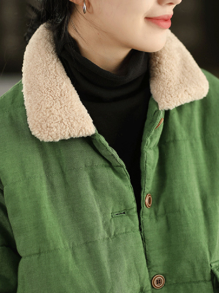 女士冬季復古100%亞麻抓絨拼接羽絨服