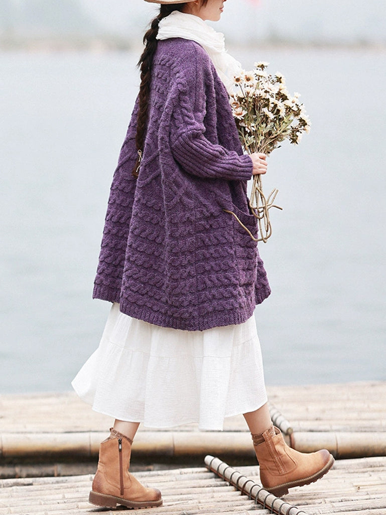 這款外套採用經典的絞花針織圖案、時尚的 V 領和全插肩袖,讓人想起復古時尚。非常適合秋冬季節。