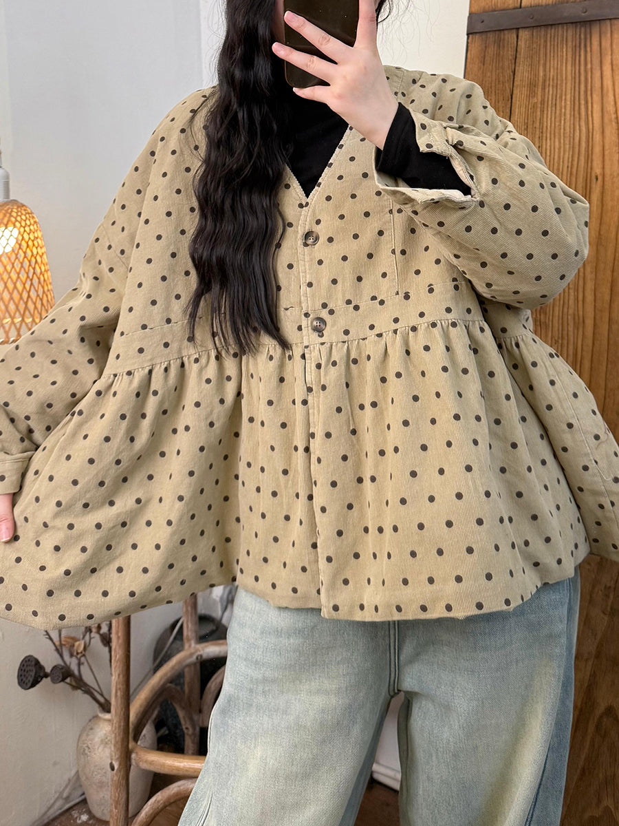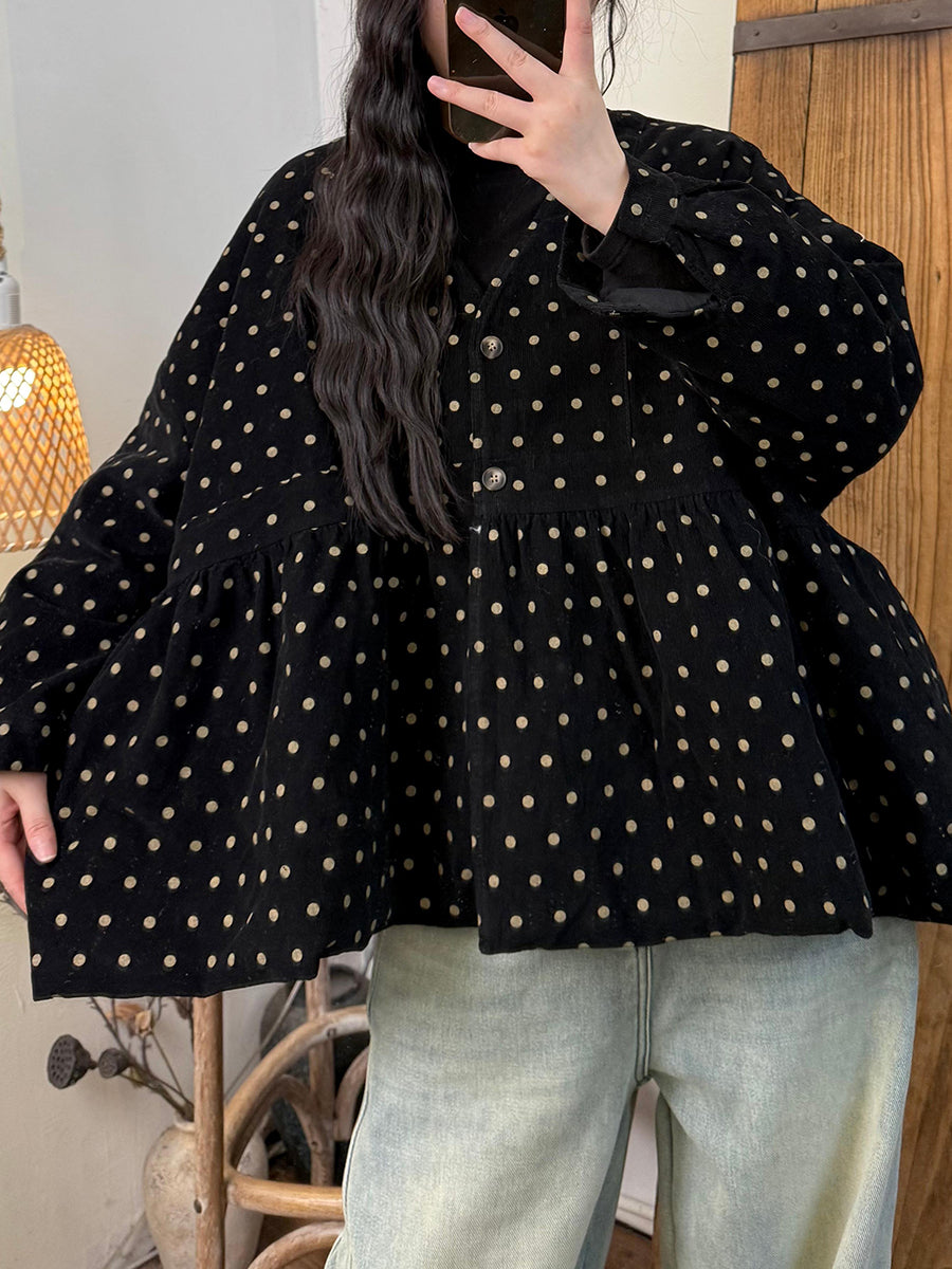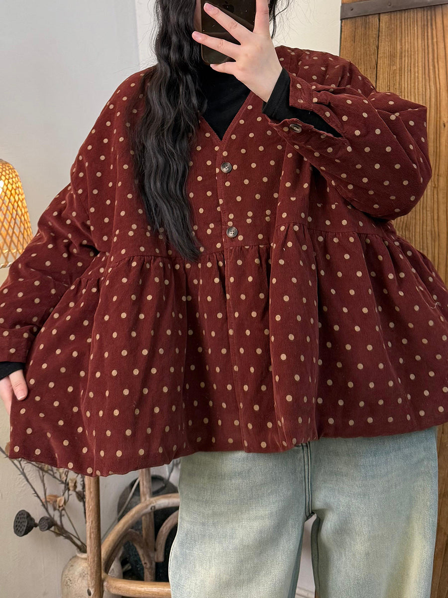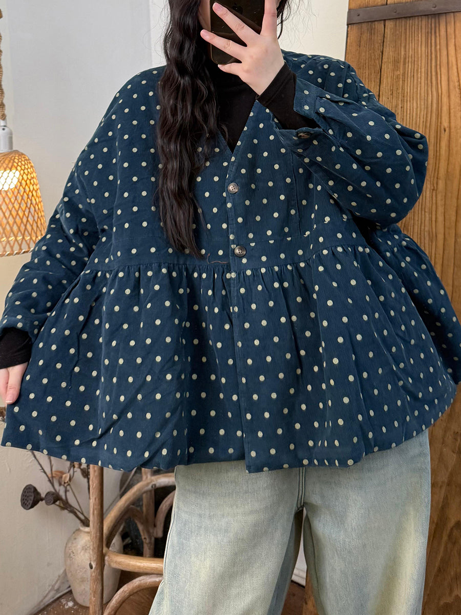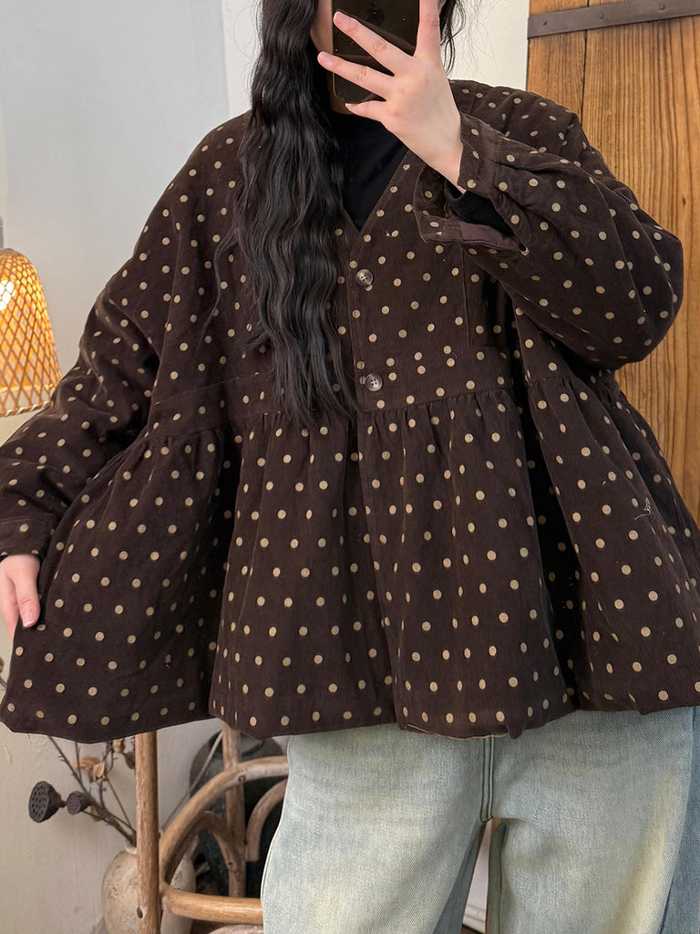 女款復古秋季圓點棉質 V 領夾棉大衣