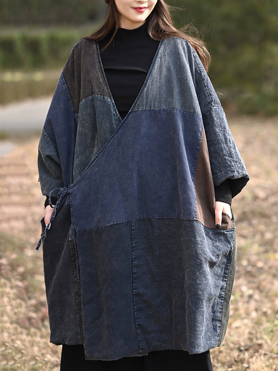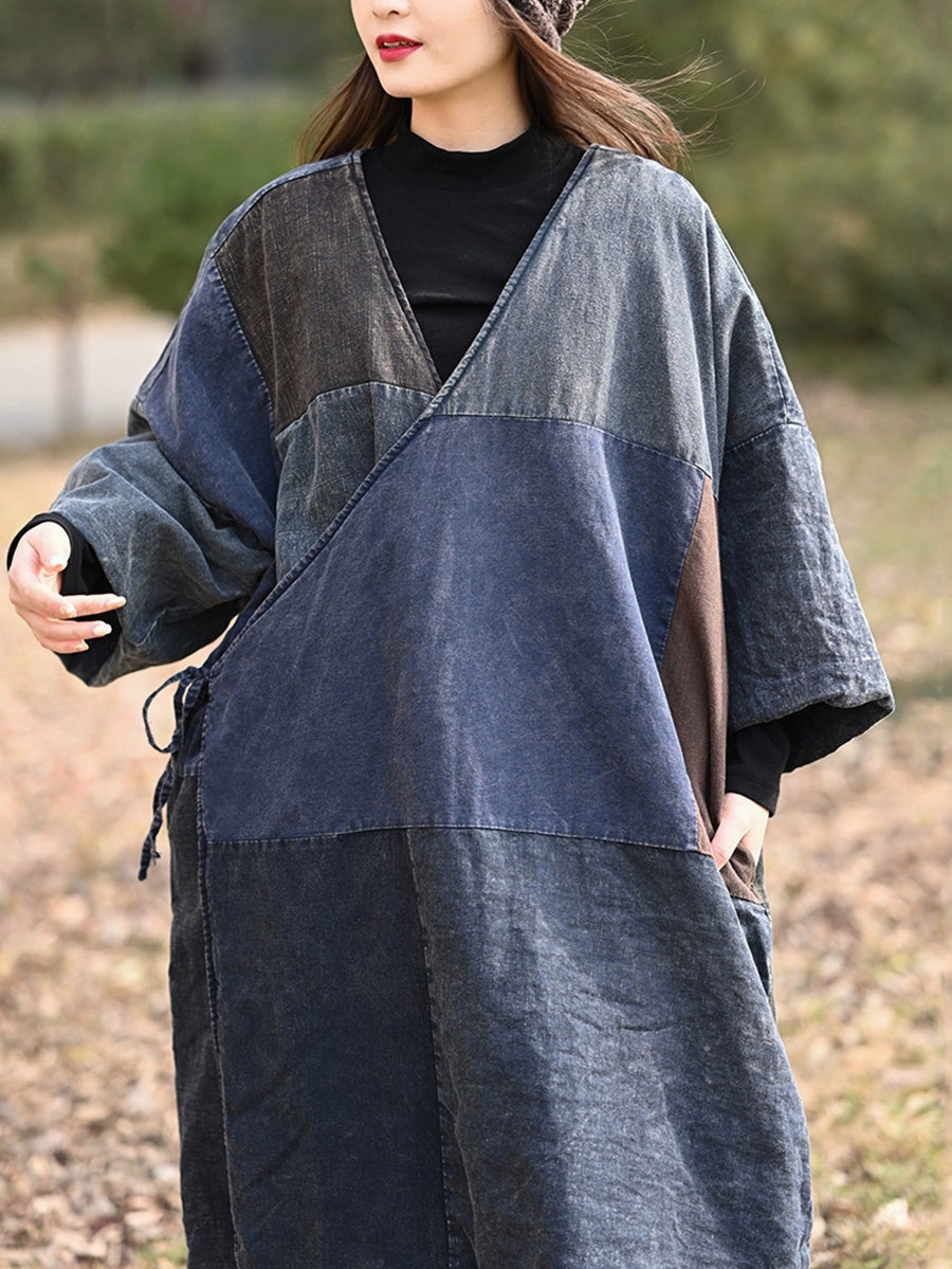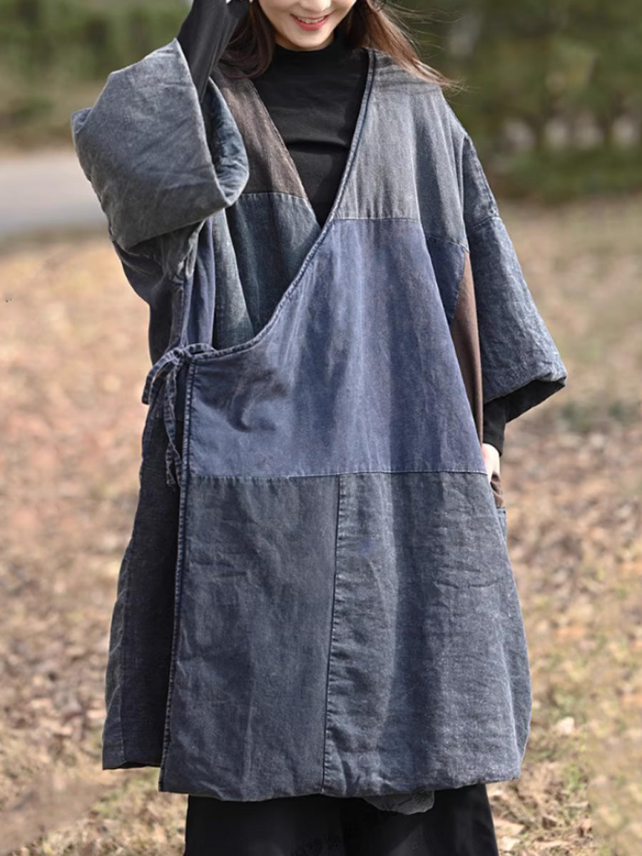 女士復古撞色拼接棉質V領羽絨服