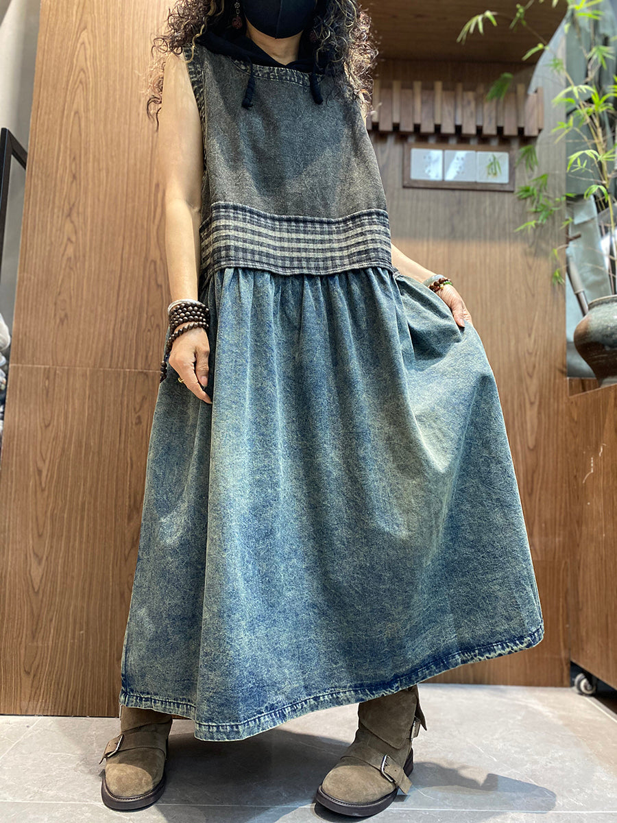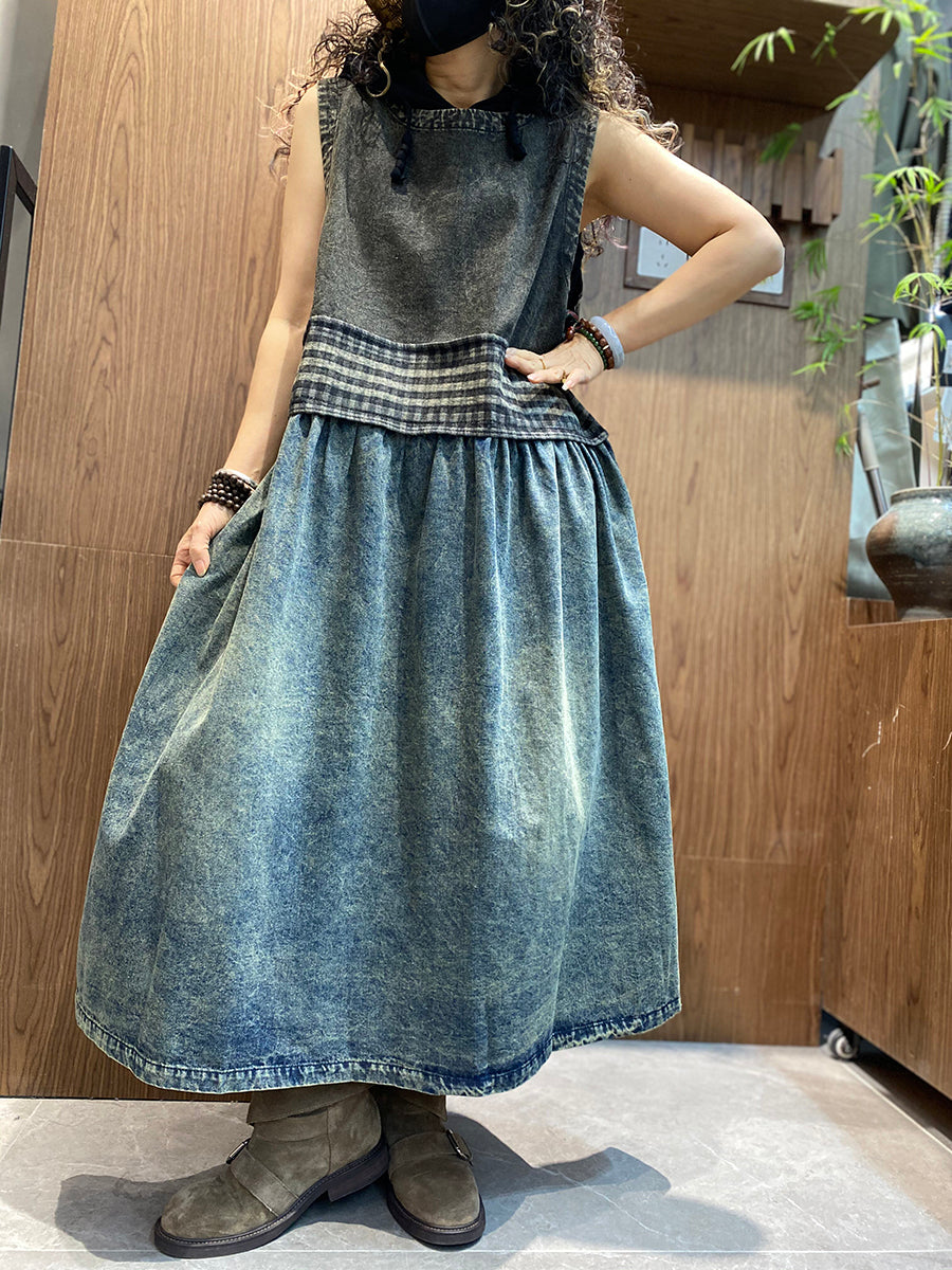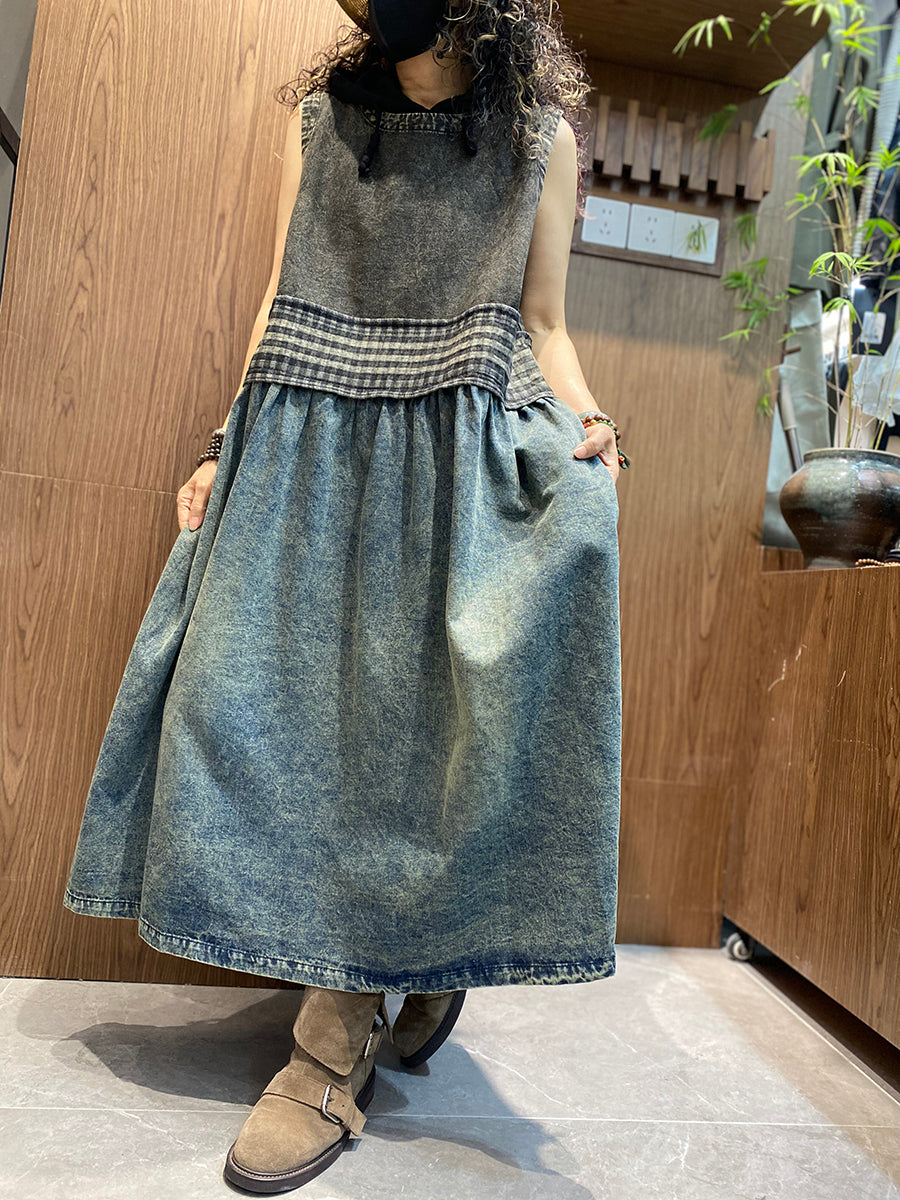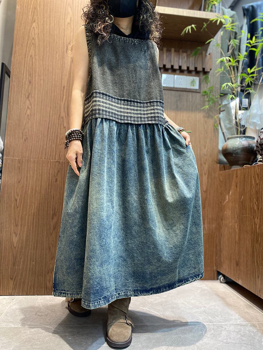 女士夏季復古牛仔拼接圓領背心連身裙