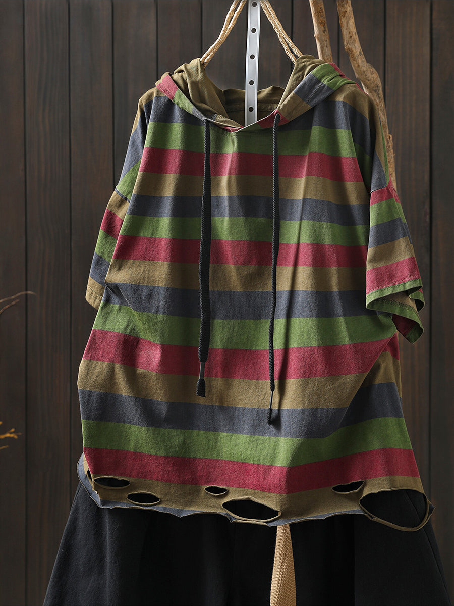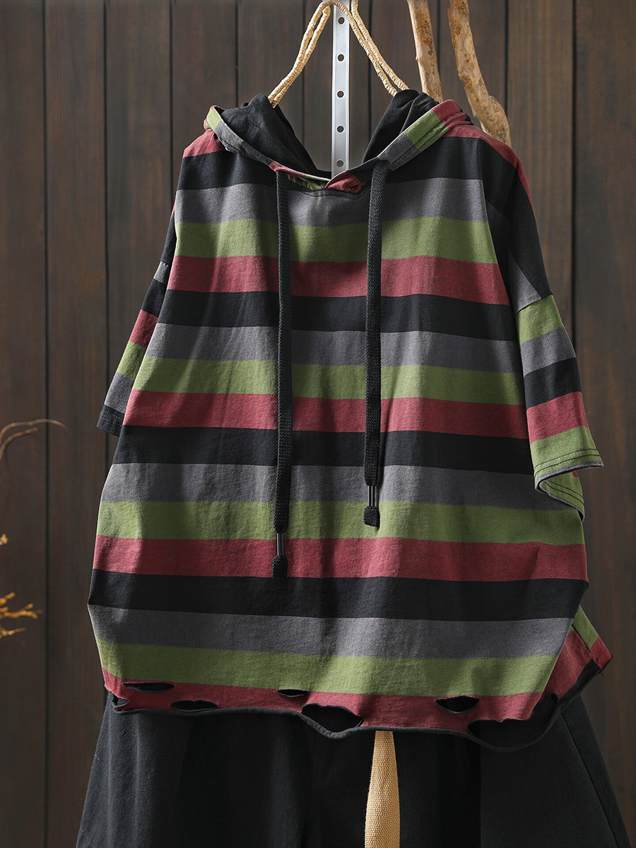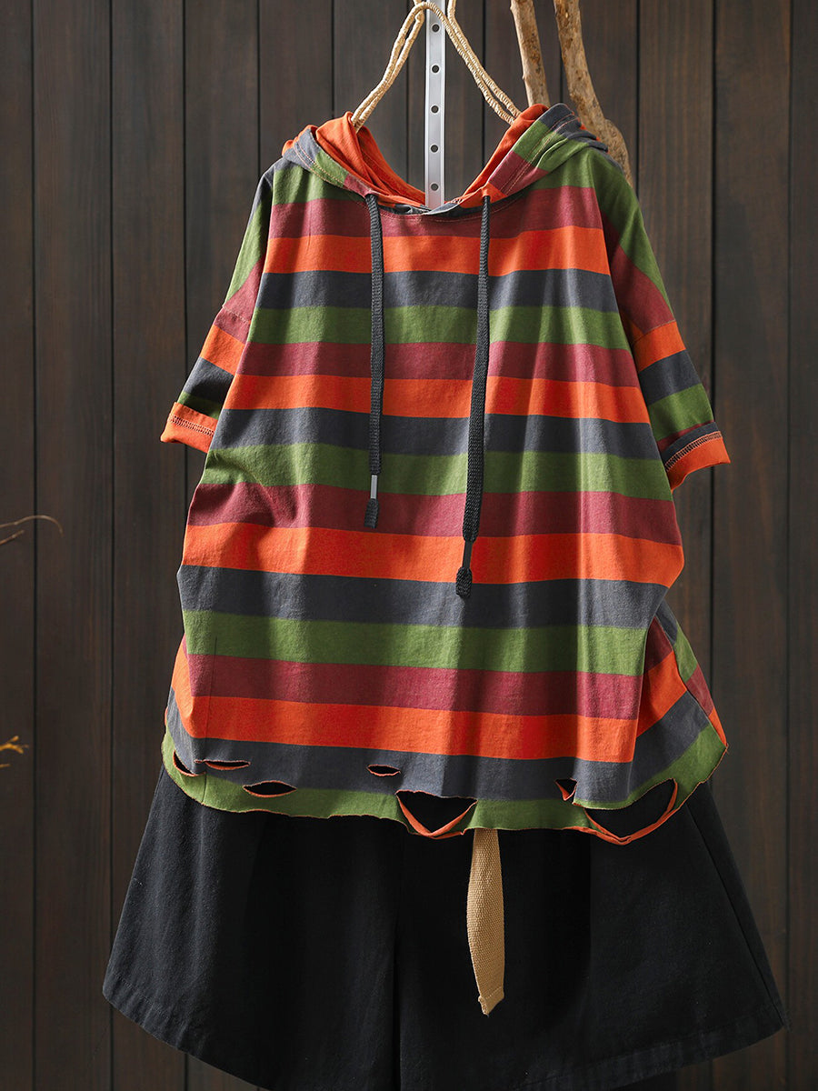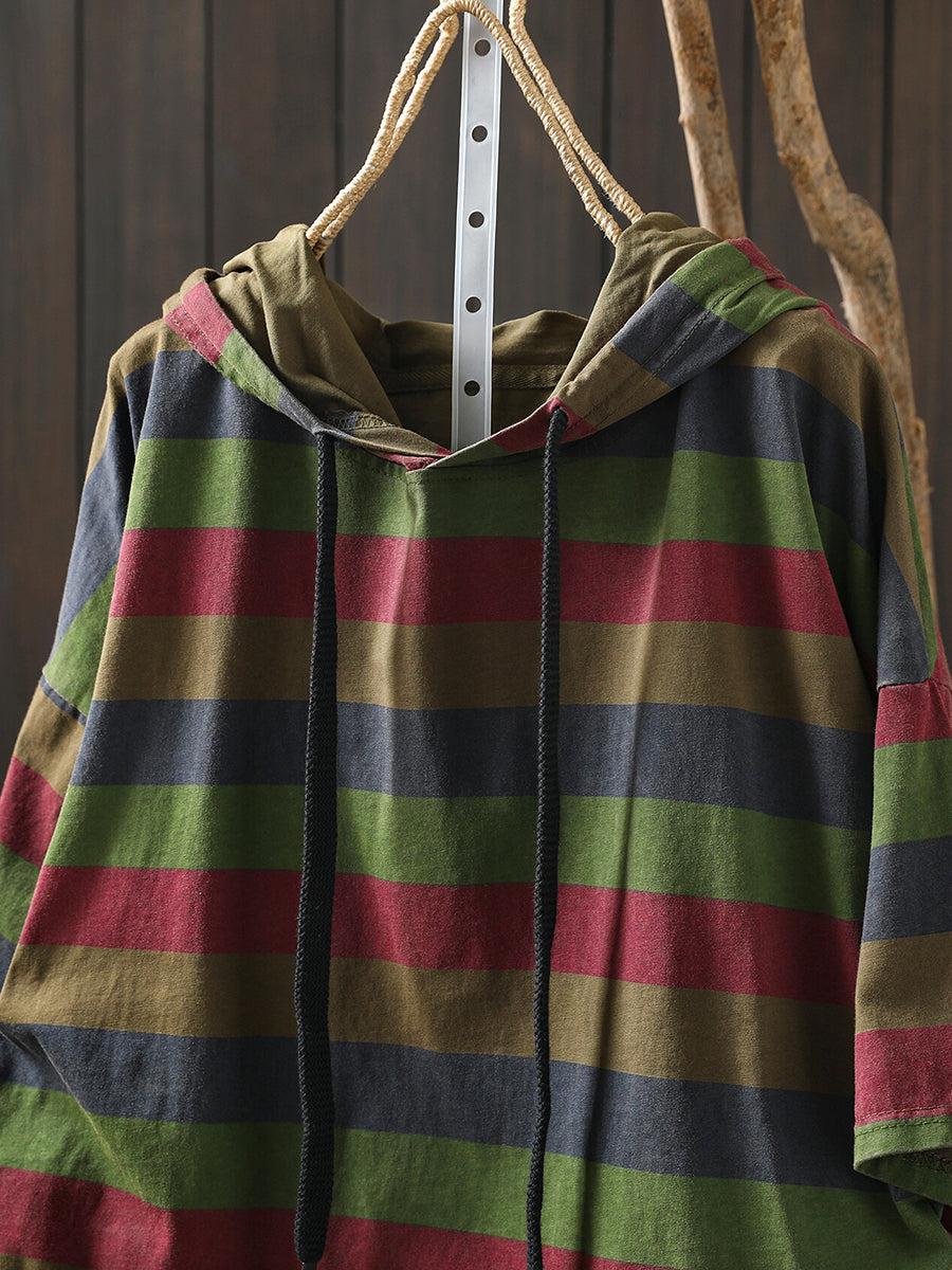 女士夏季休閒條紋圓領連帽衫