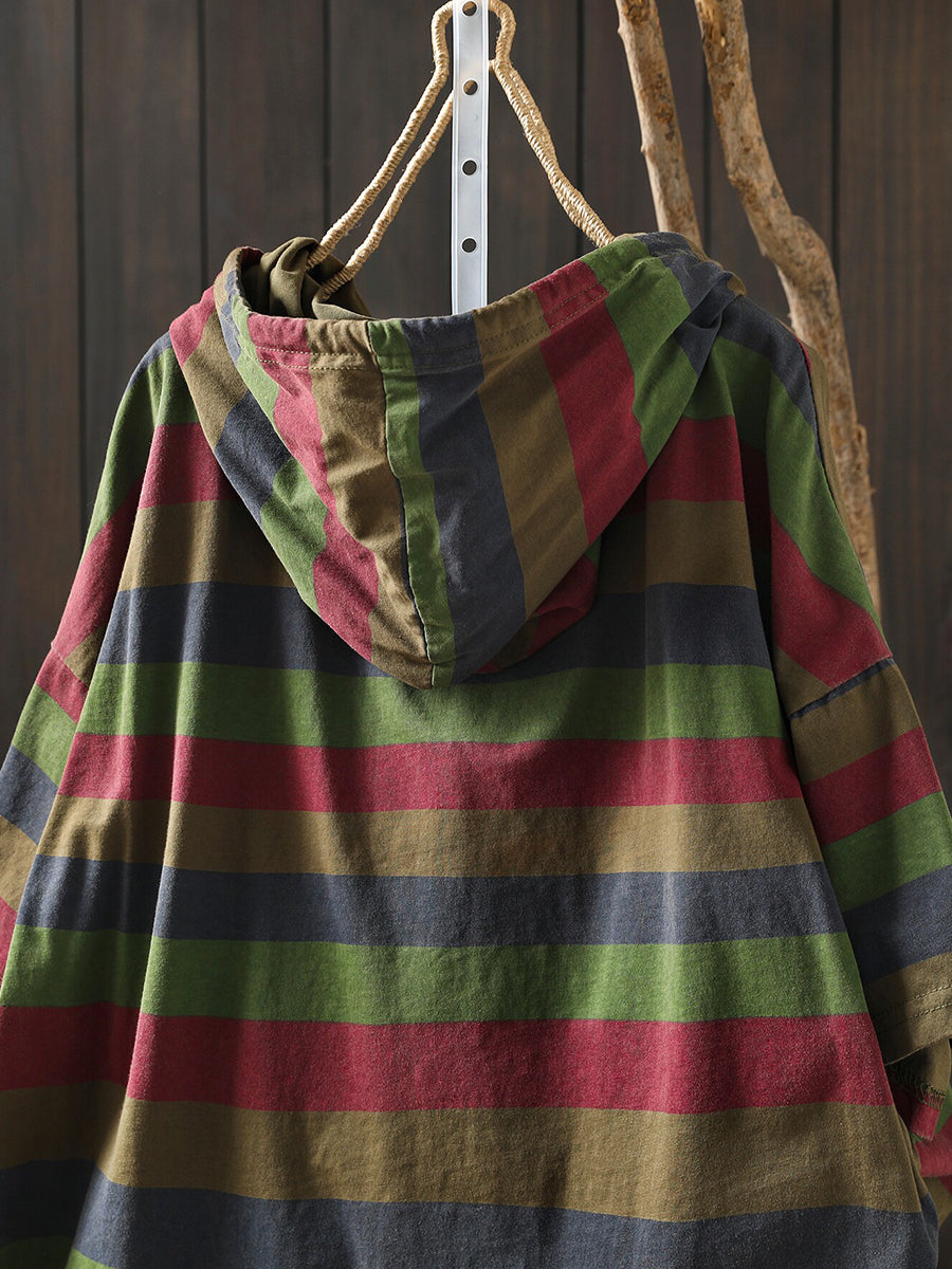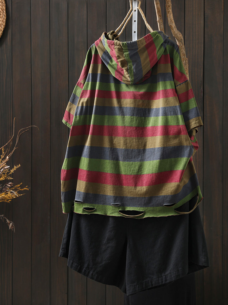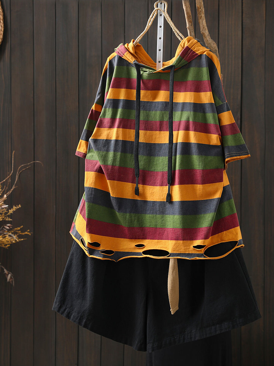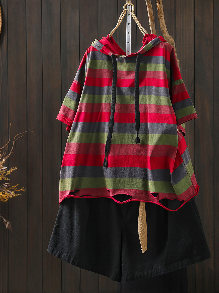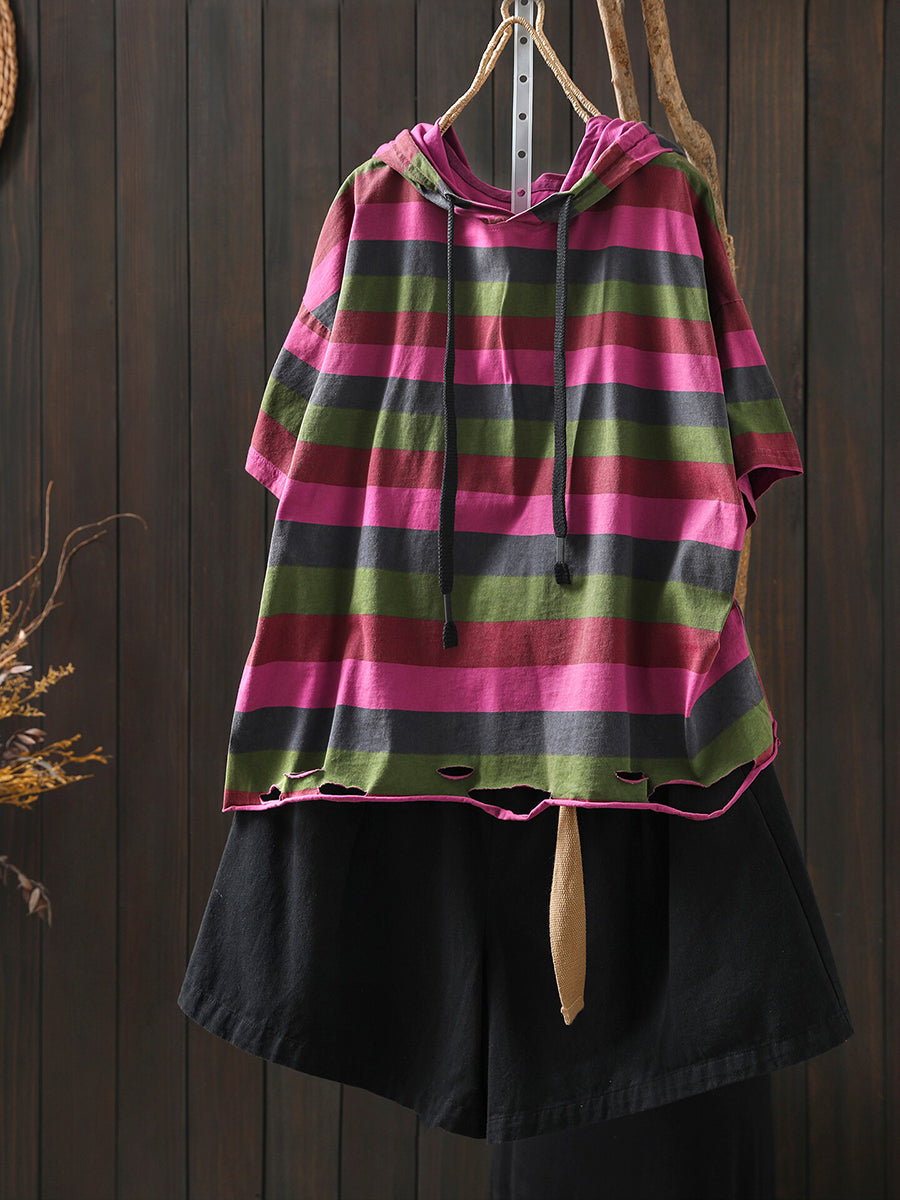 女士夏季休閒條紋圓領連帽衫