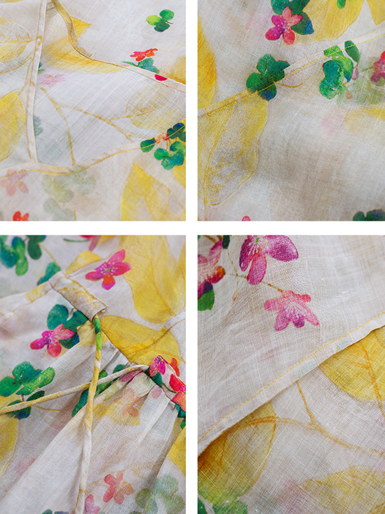大尺碼女款夏季草原別緻花卉 V 領苧麻連身裙
