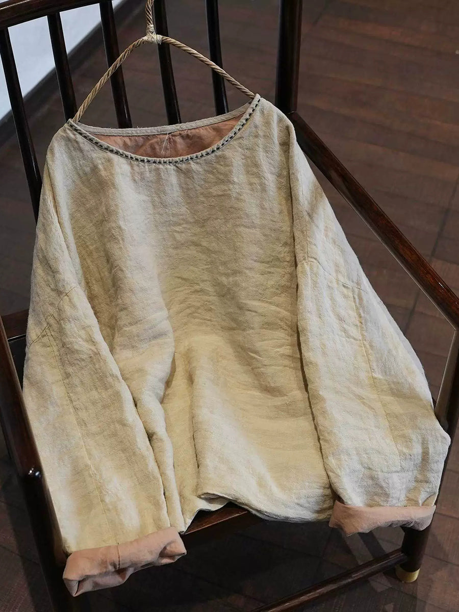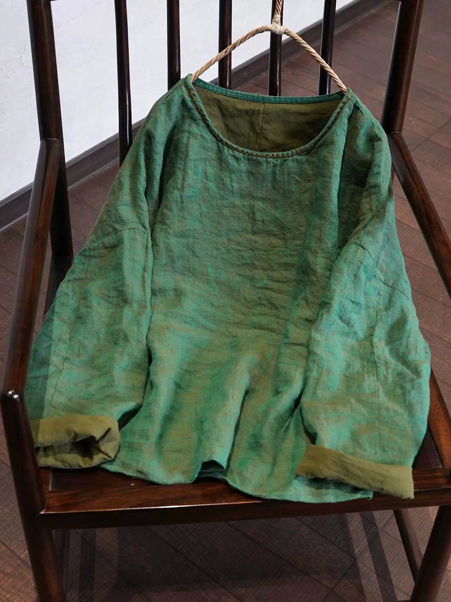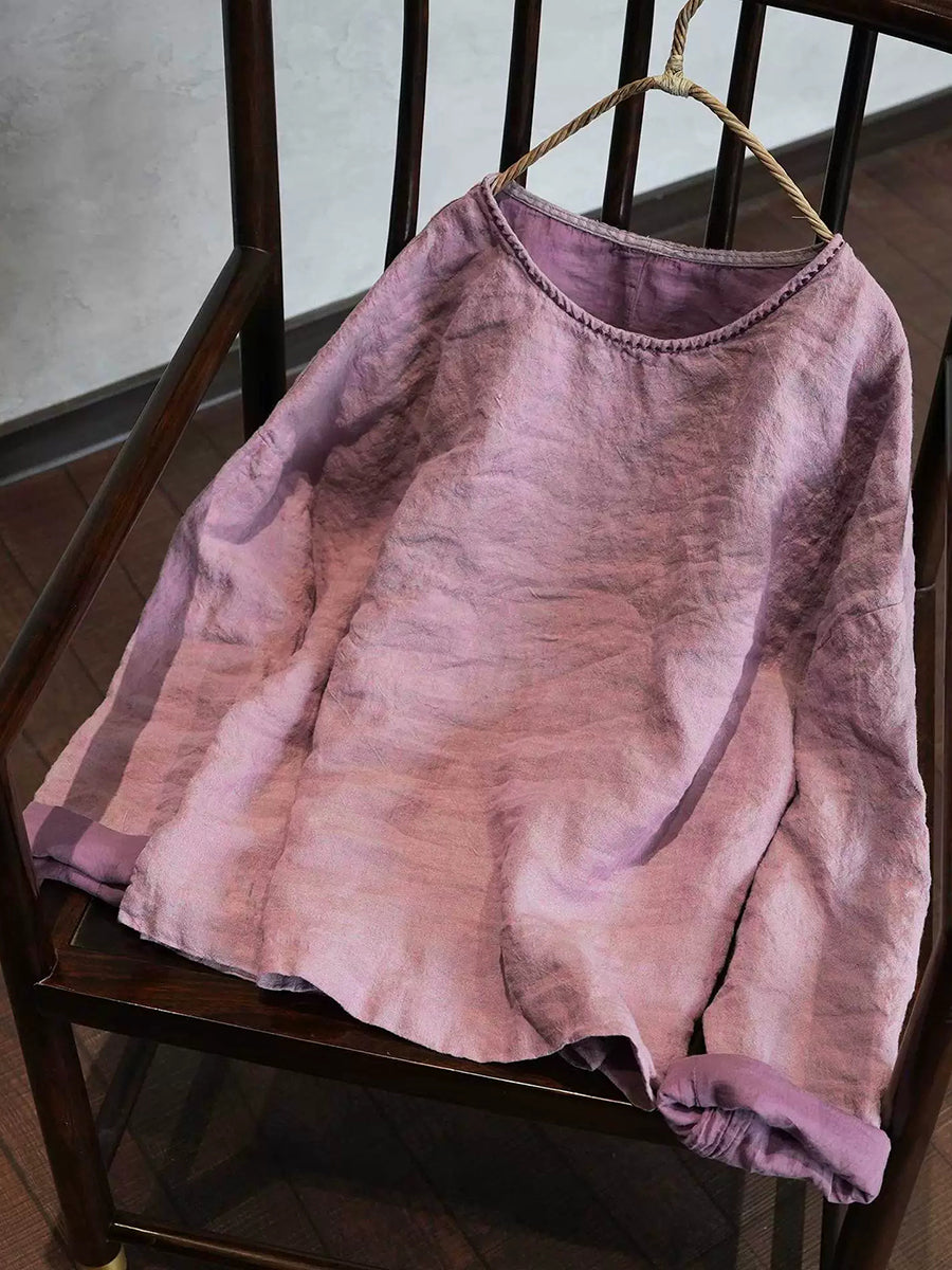 女士春季藝術純色圓領亞麻襯衫