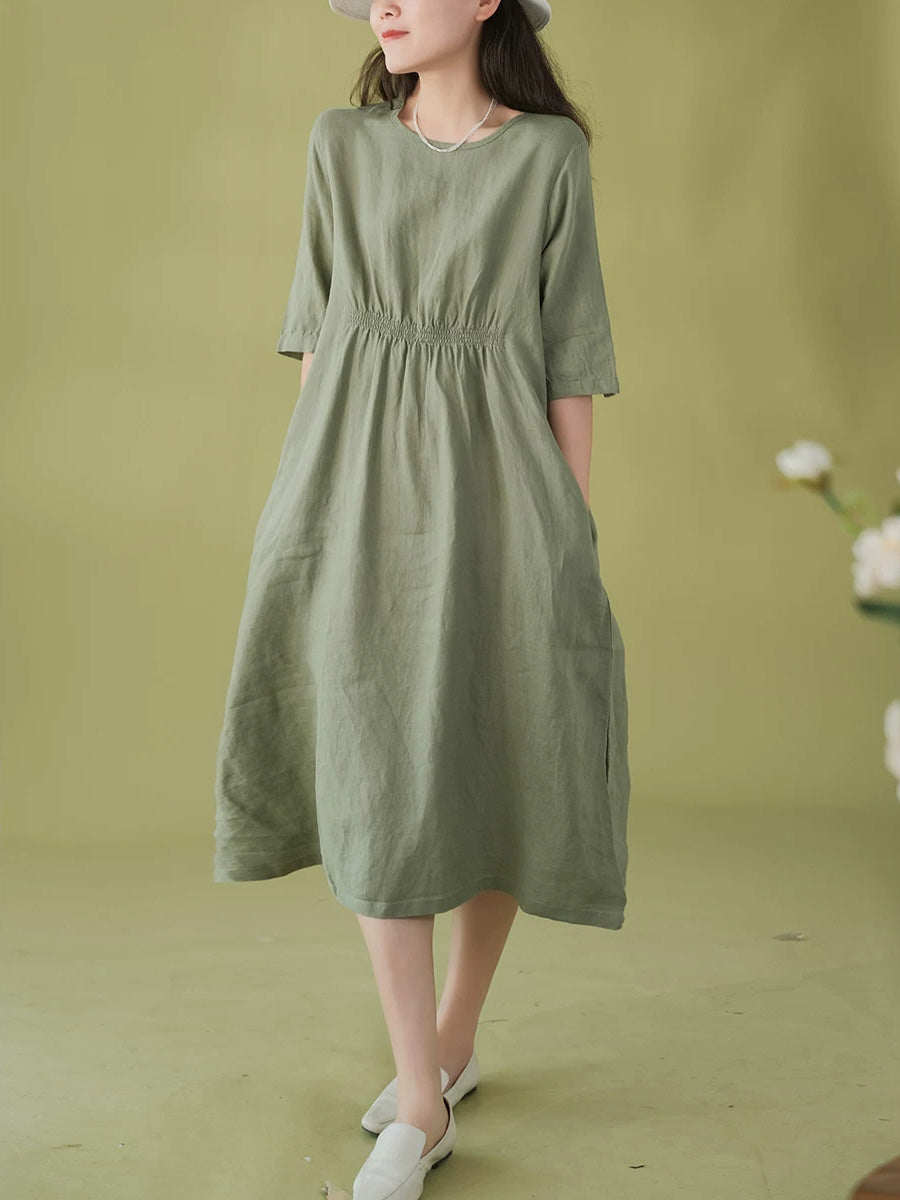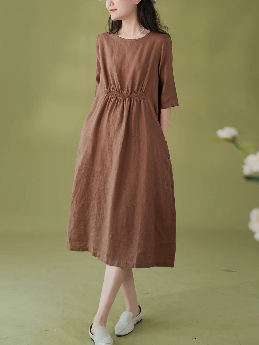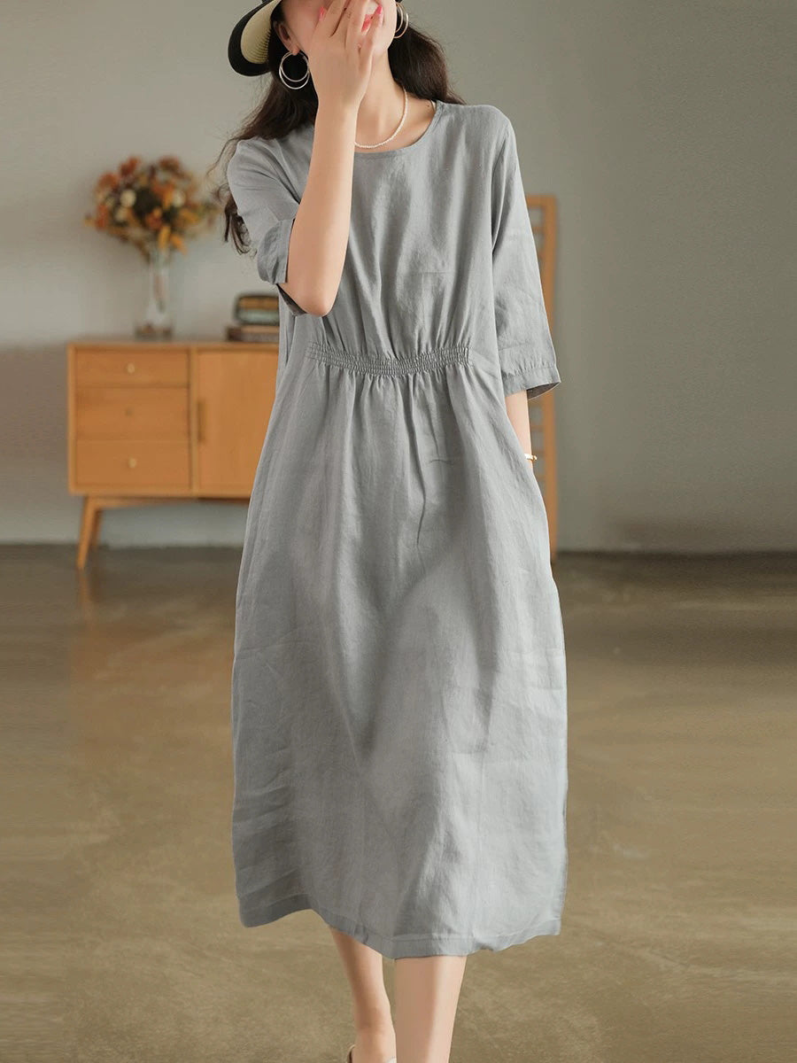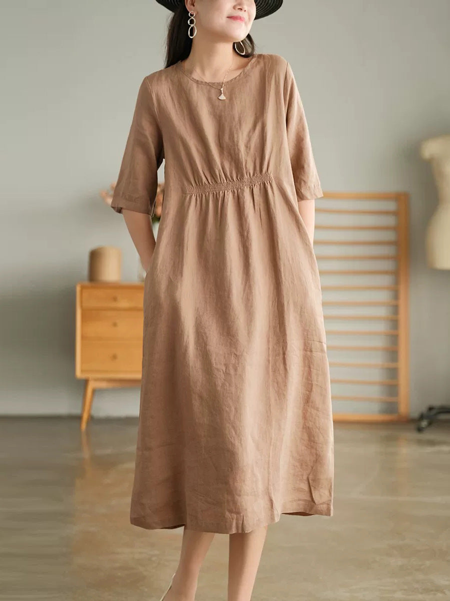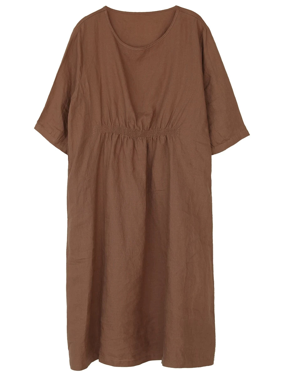 女士夏季藝術純色100%亞麻圓領連身裙
