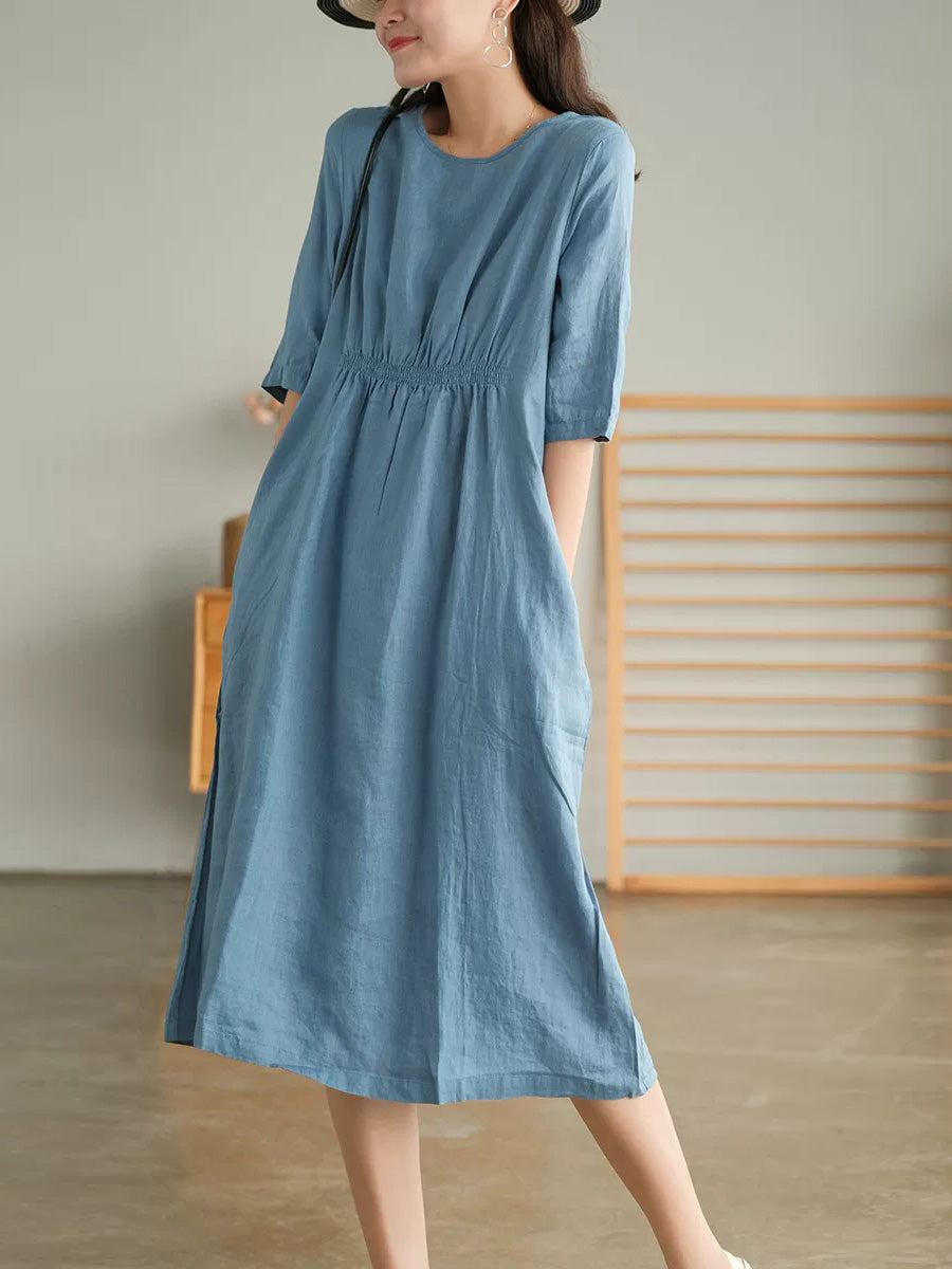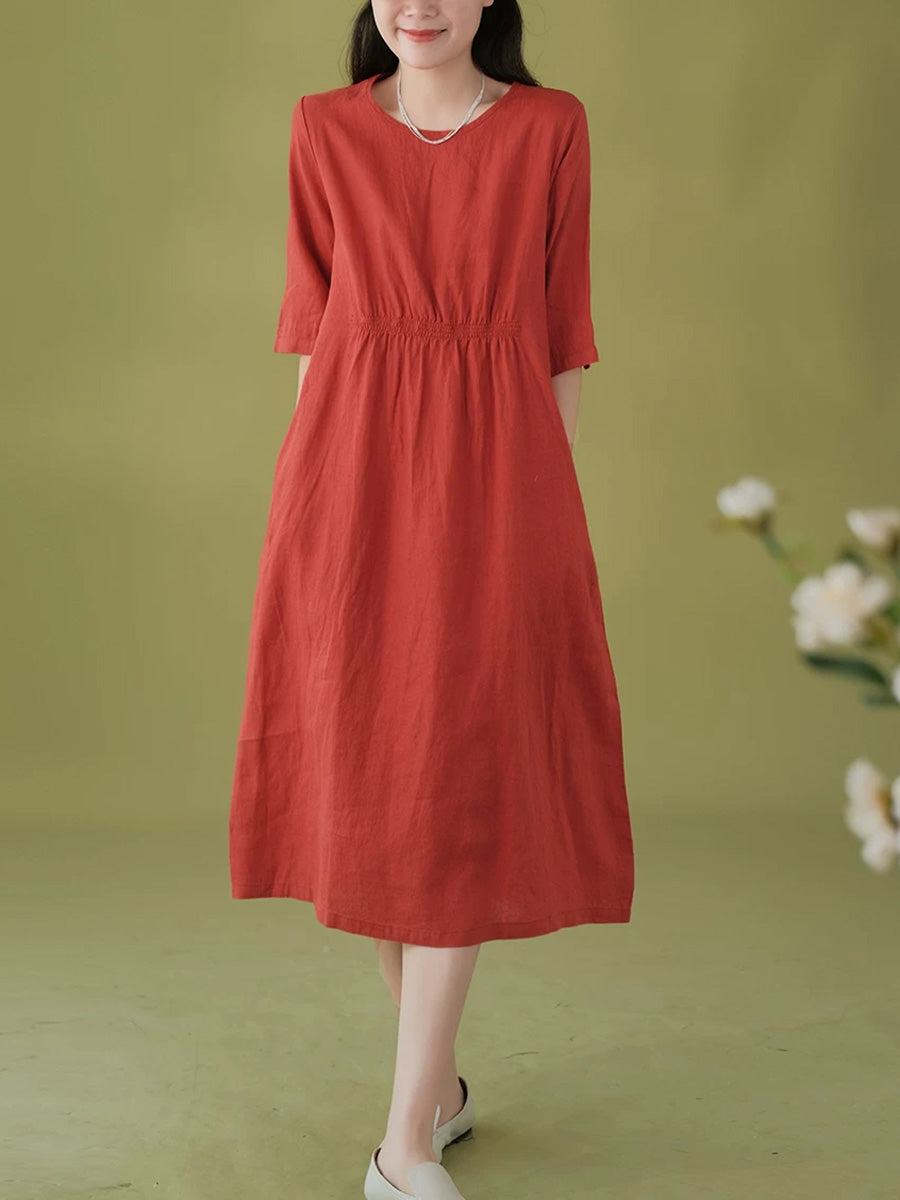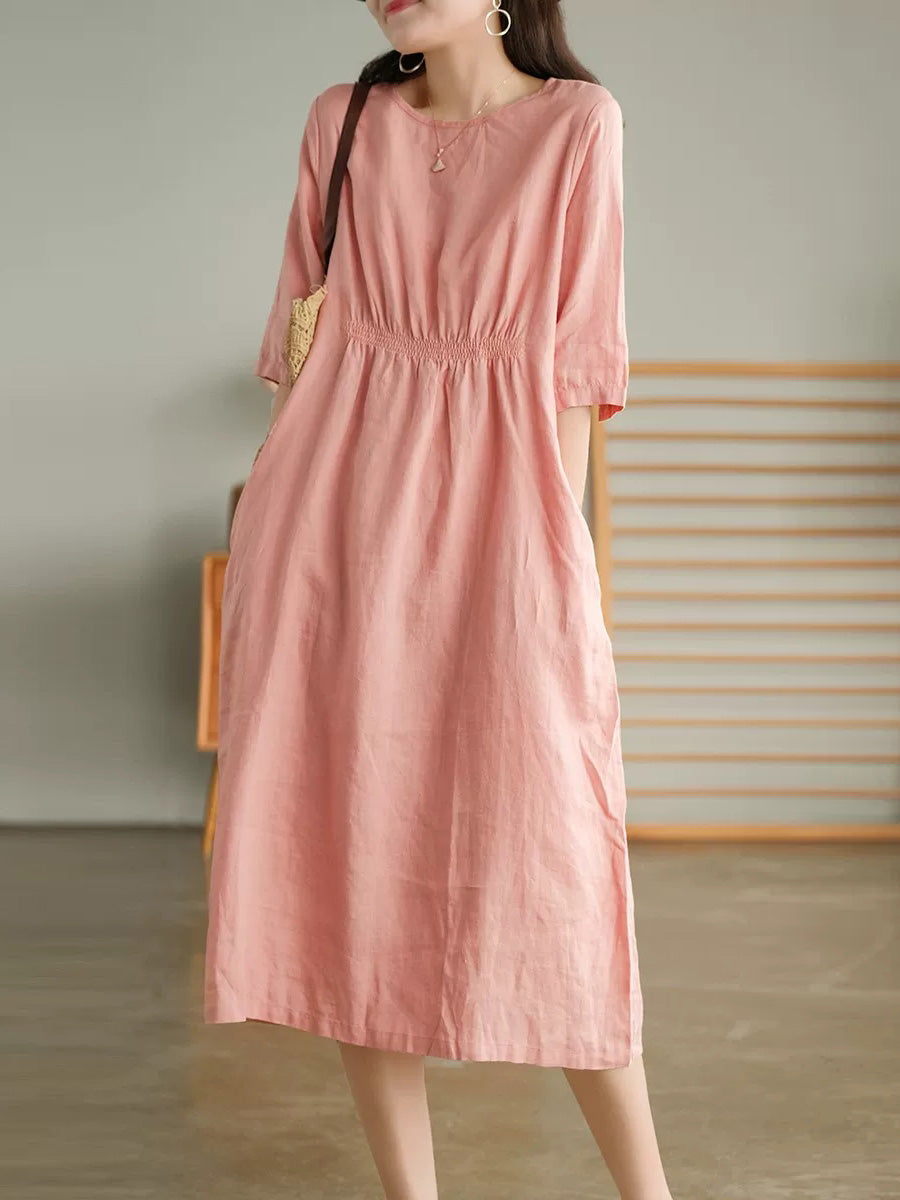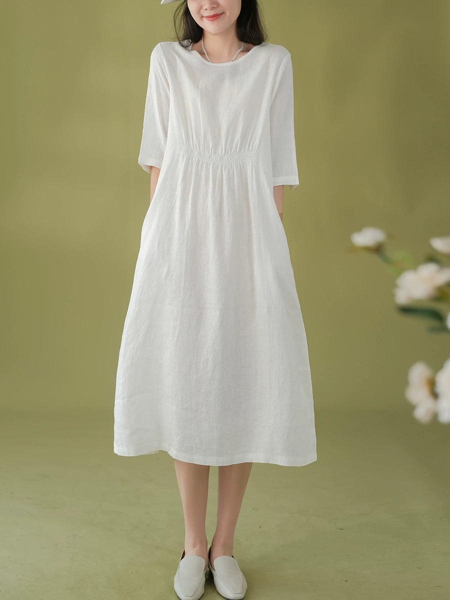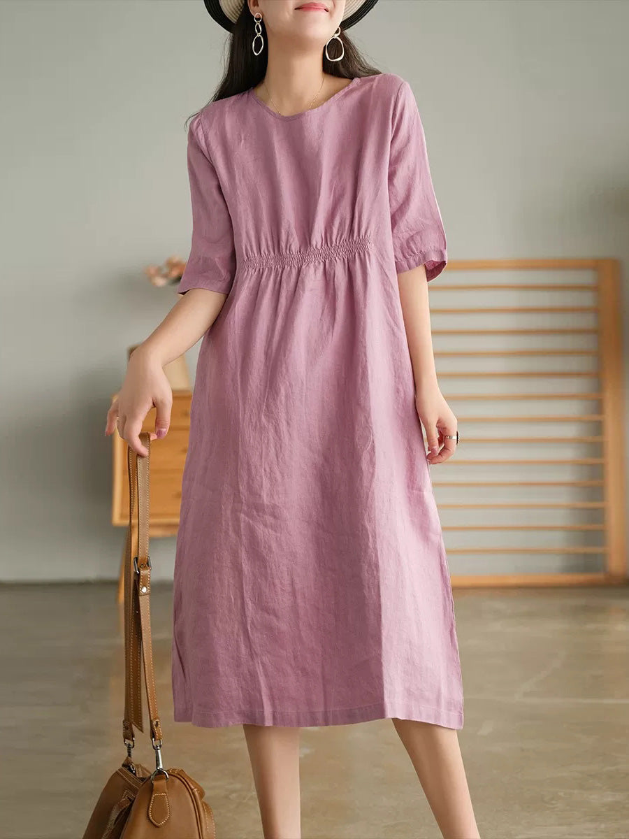 女士夏季藝術純色100%亞麻圓領連身裙