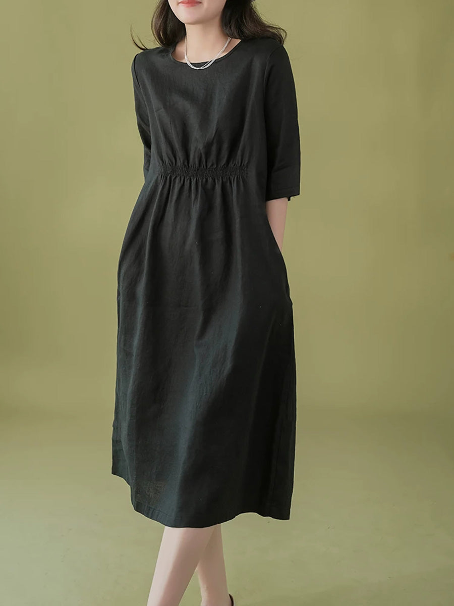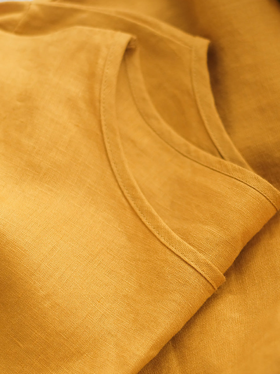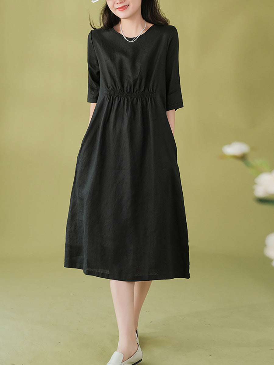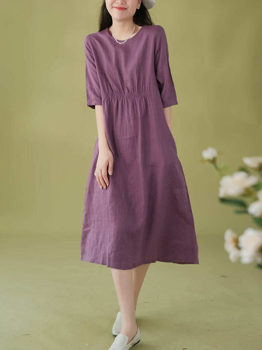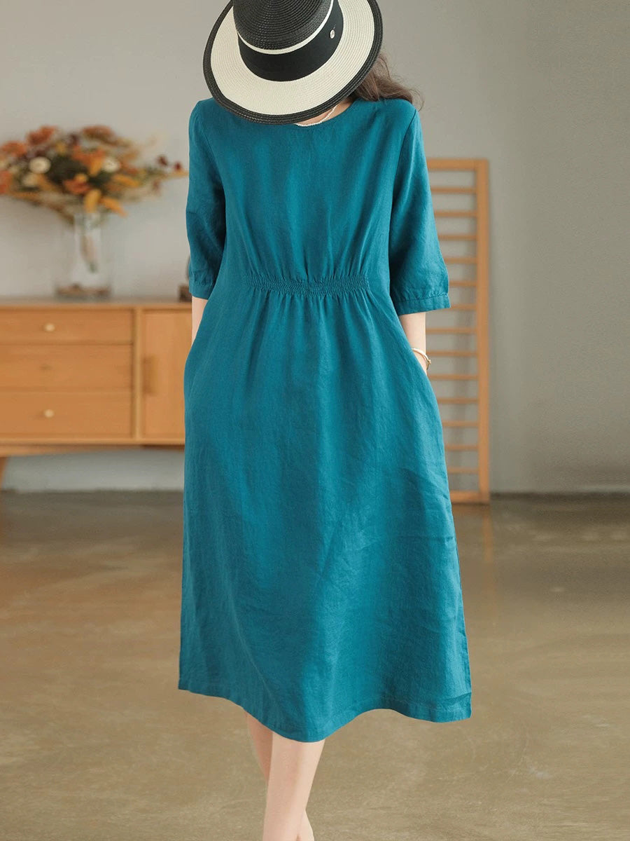 女士夏季藝術純色100%亞麻圓領連身裙