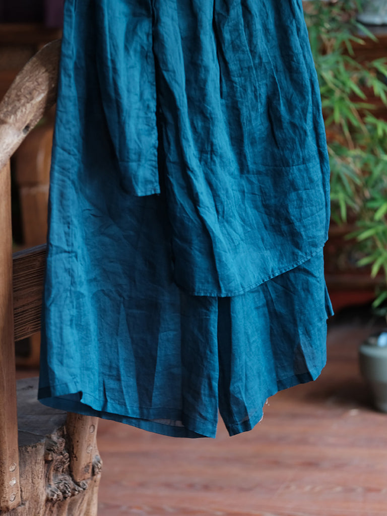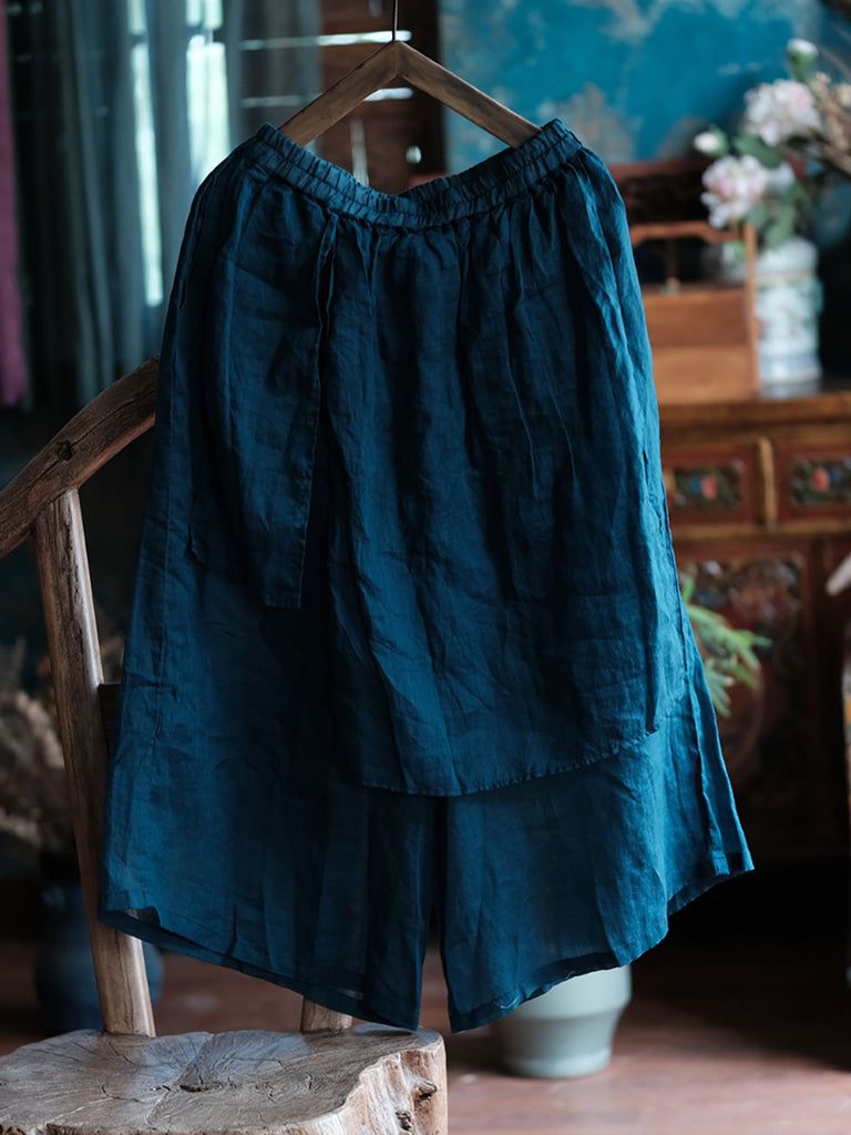這款女款夏季復古純色拼接闊腿褲採用 100% 苧麻材質製成,採用鬆緊腰部和全長設計,復古風格。非常適合春季和夏季。