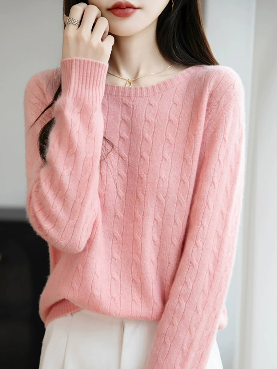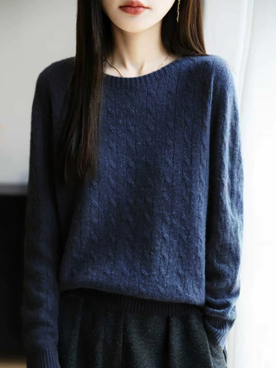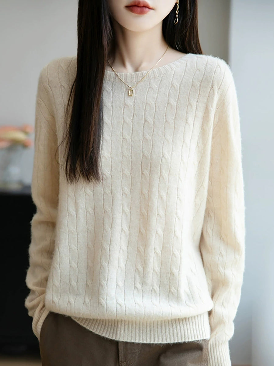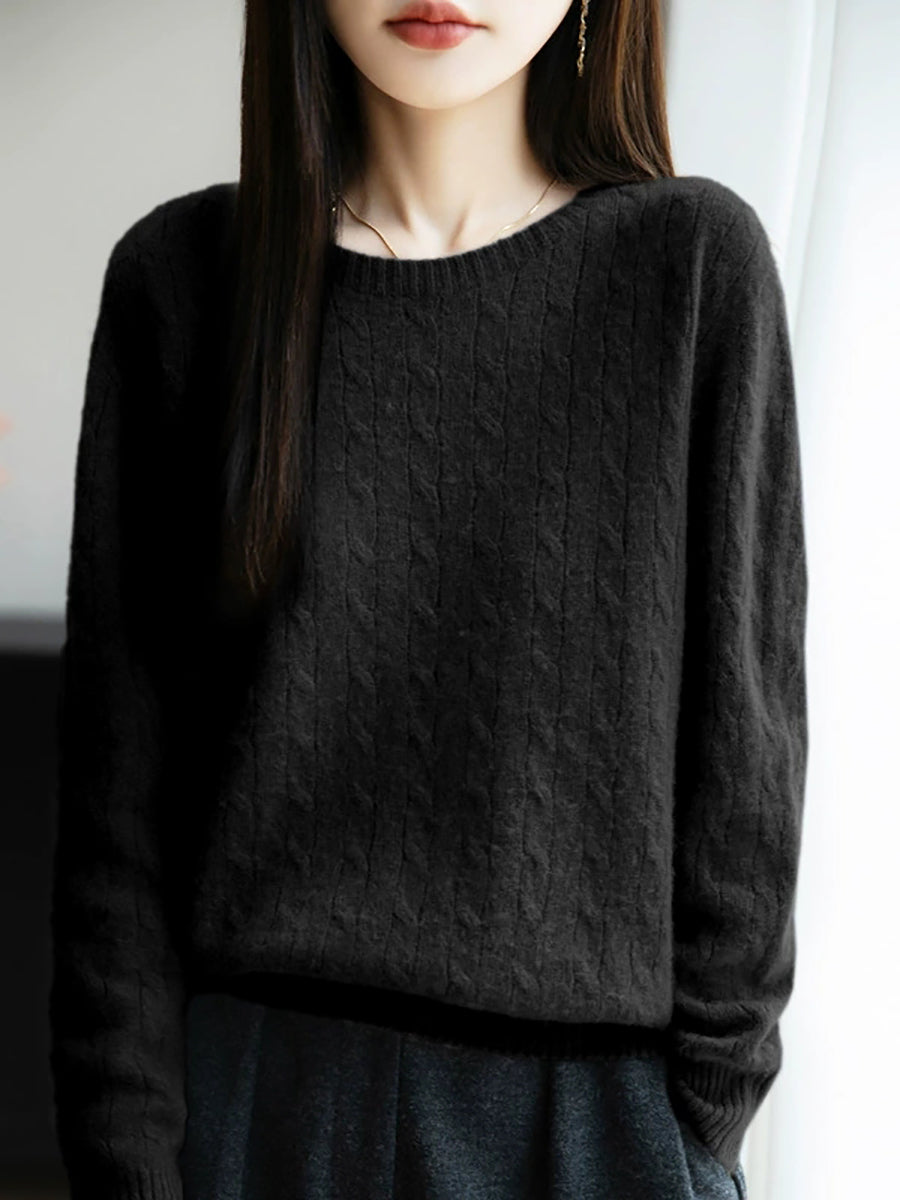 女士春季純色絞花針織圓領毛衣