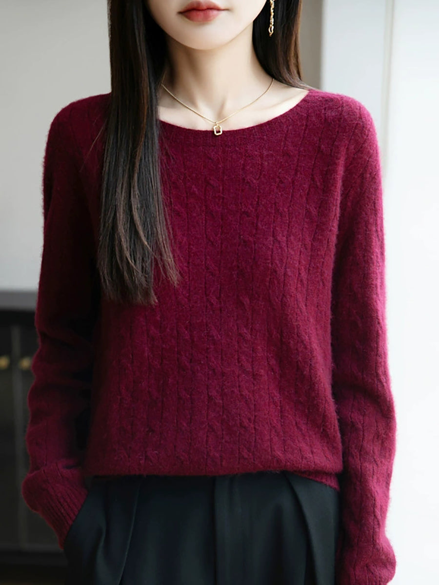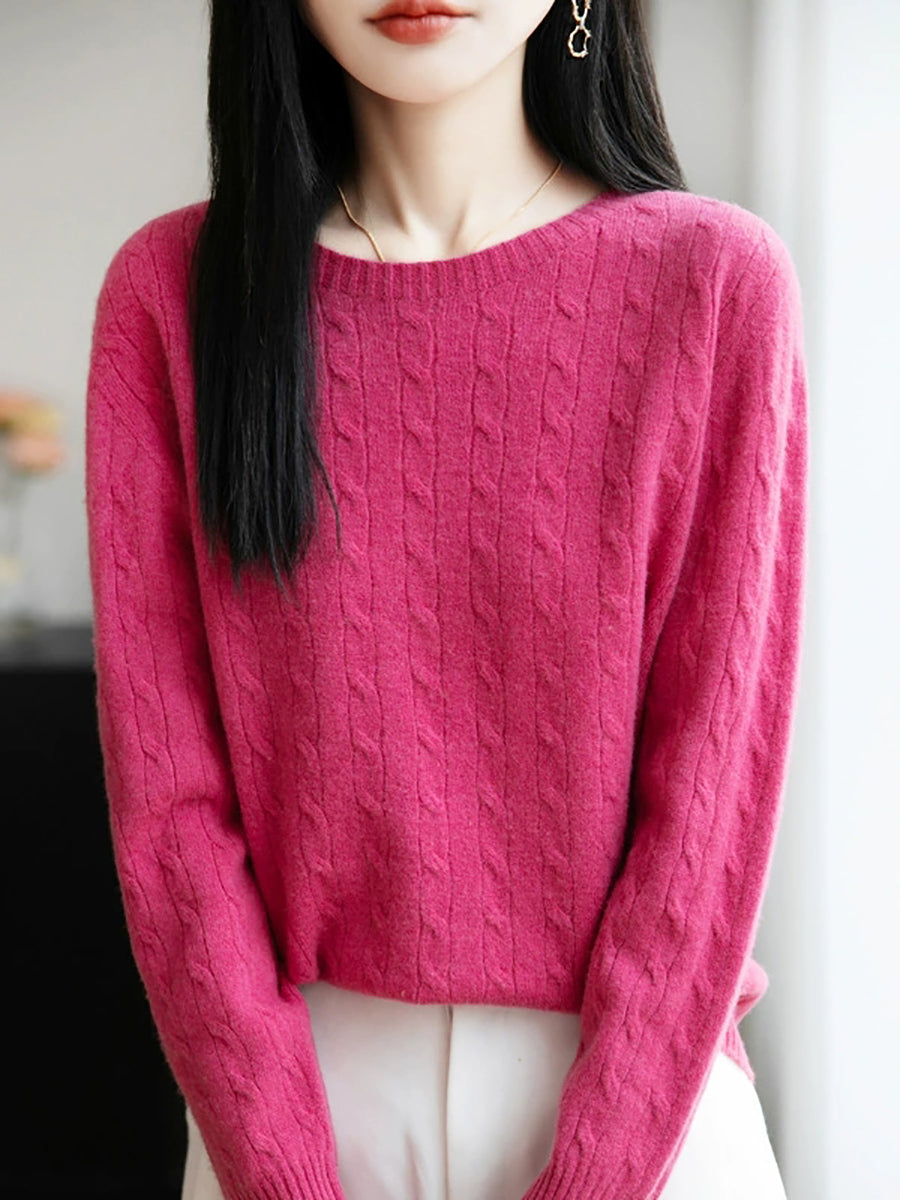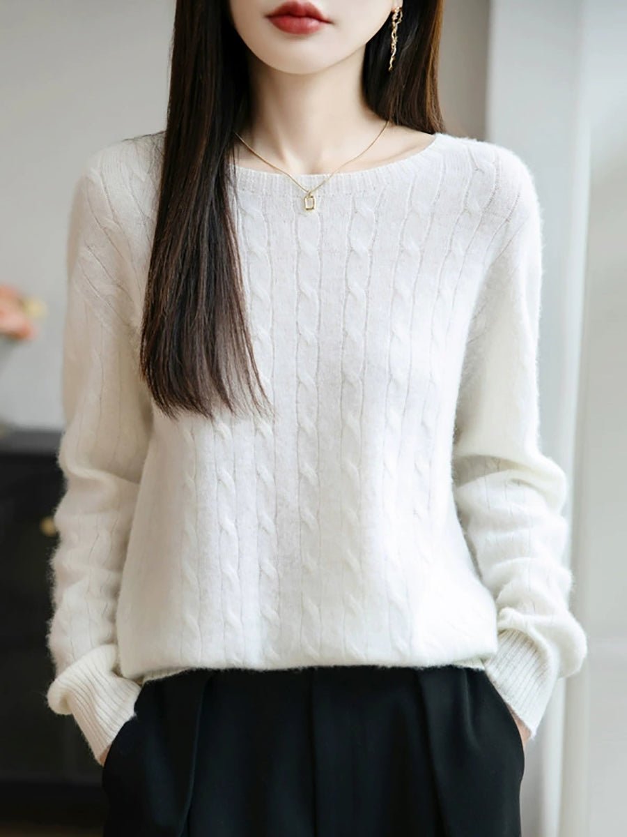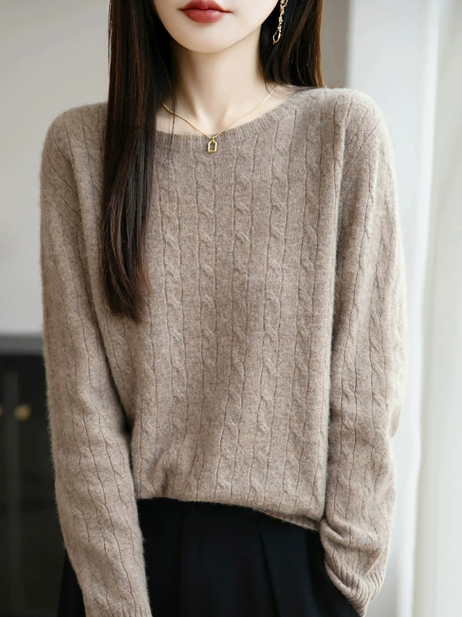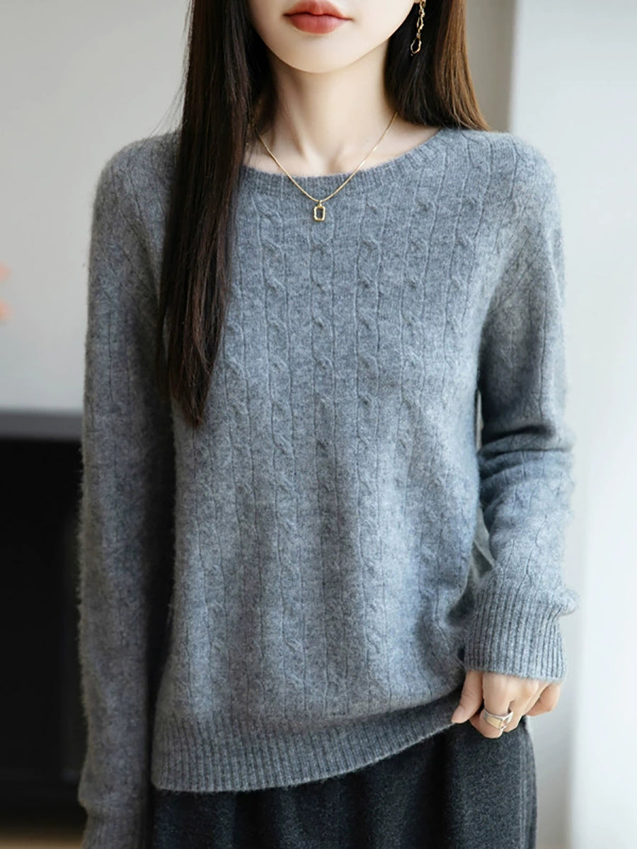 女士春季純色絞花針織圓領毛衣