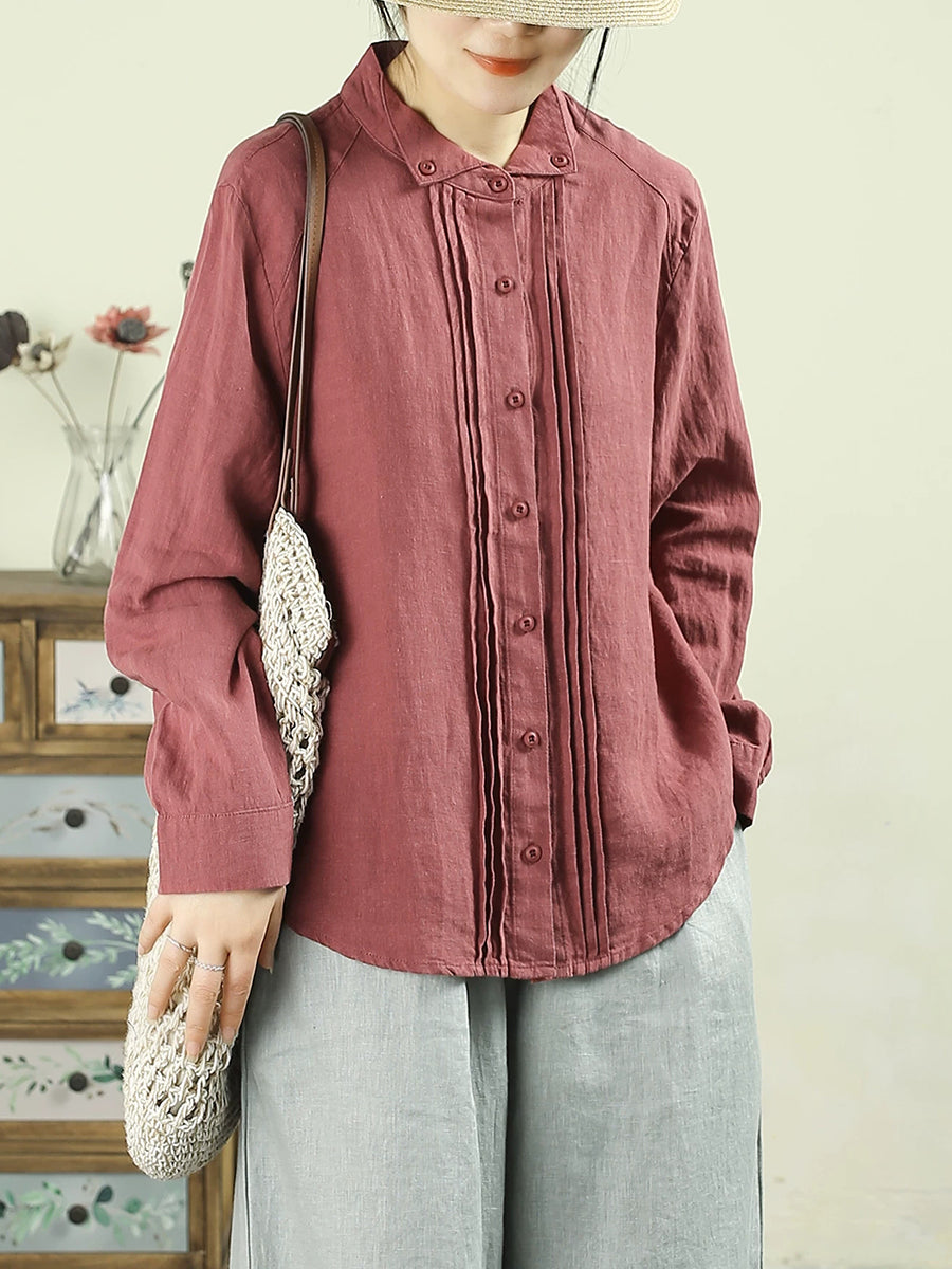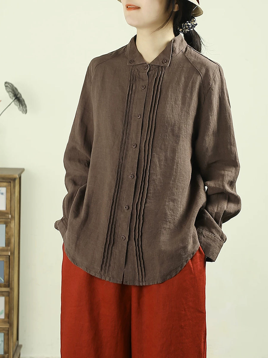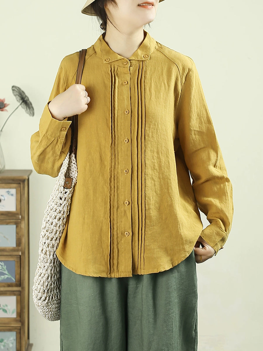 女士藝術風春季褶皺純色100%亞麻襯衫