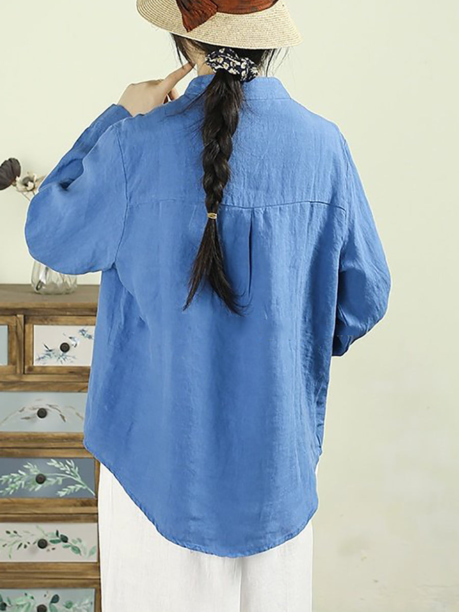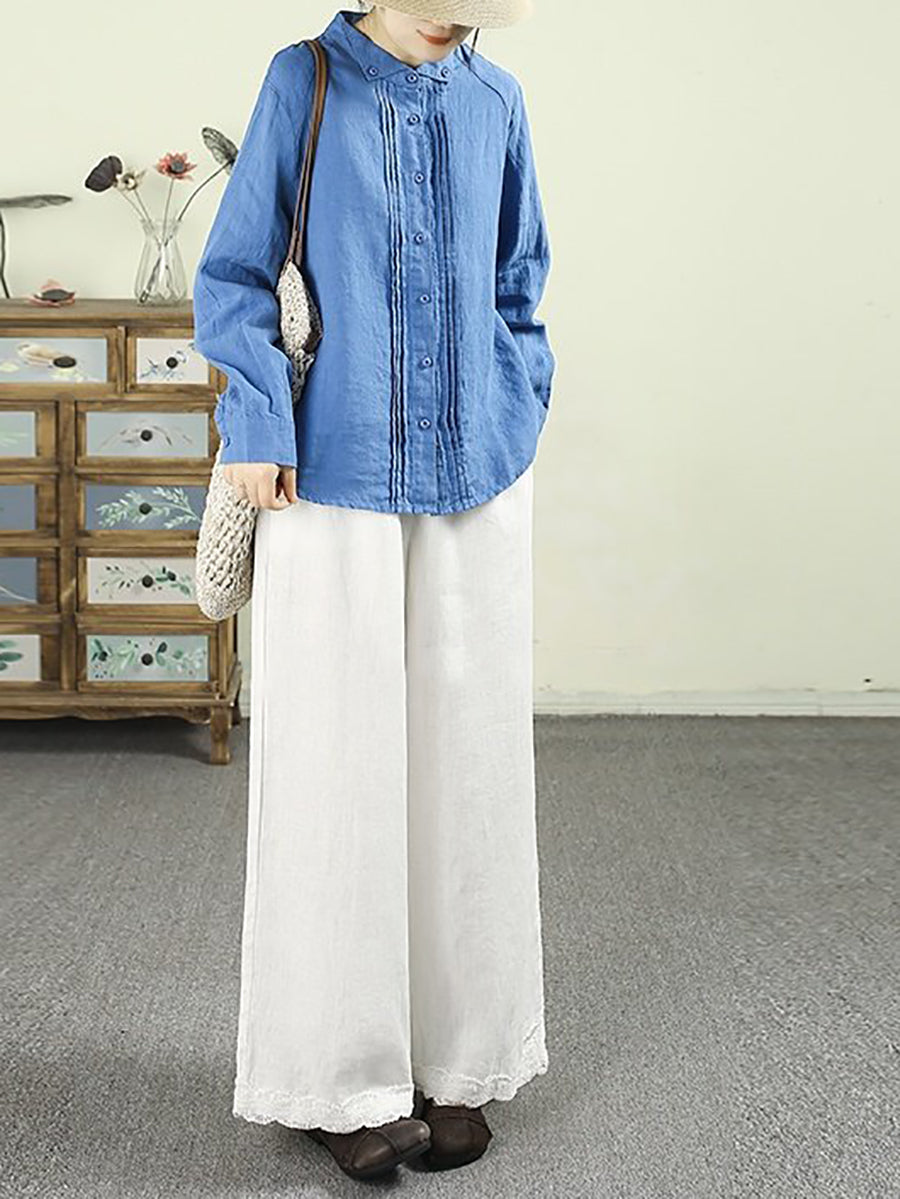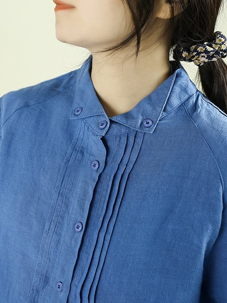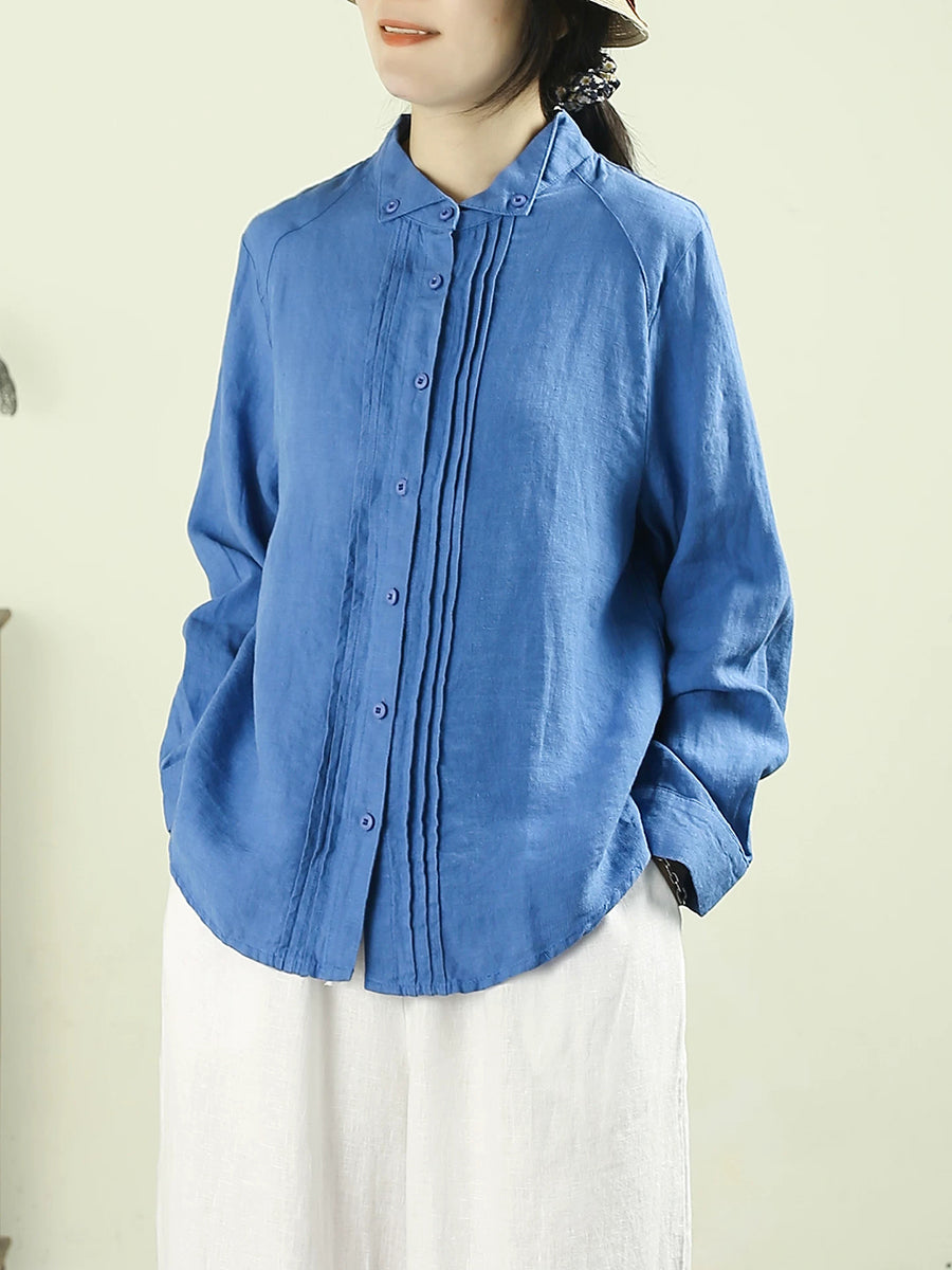 女士藝術風春季褶皺純色100%亞麻襯衫