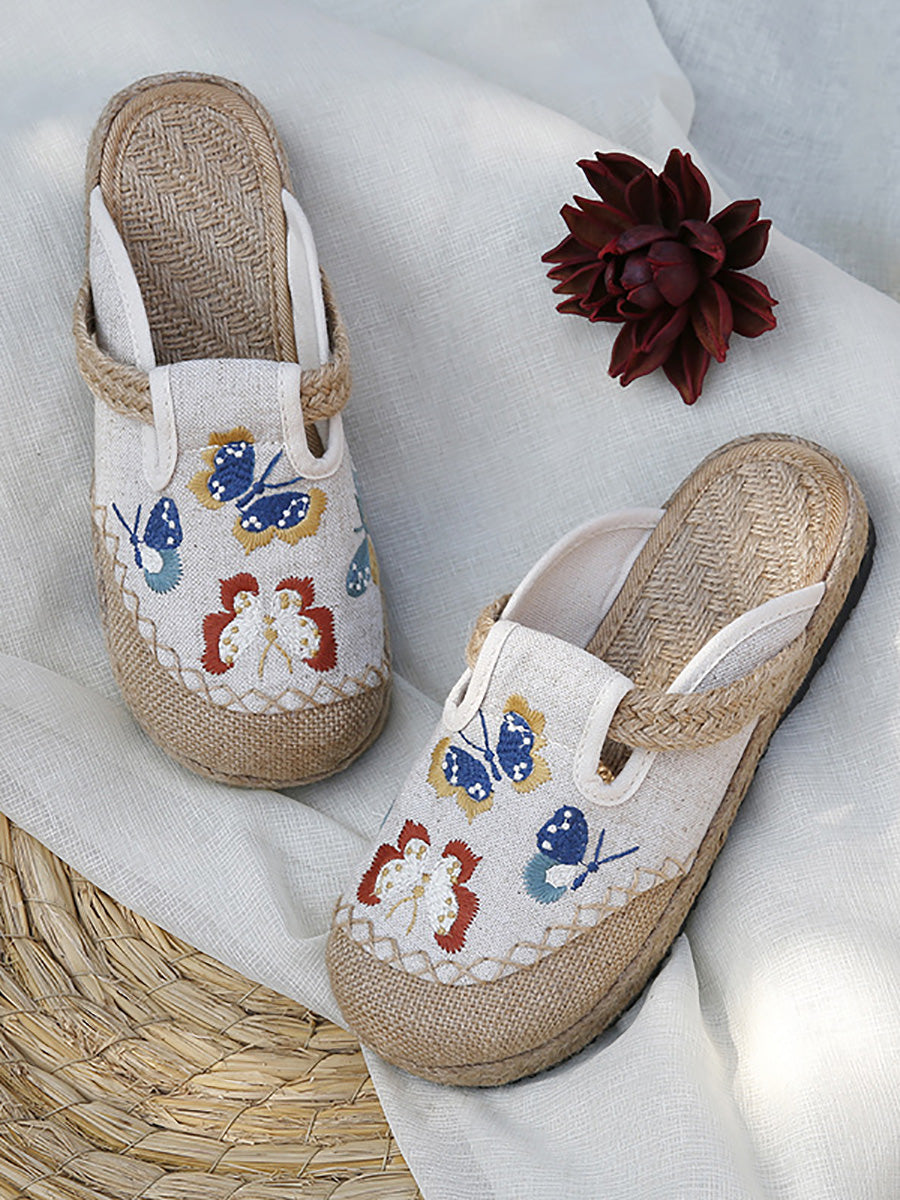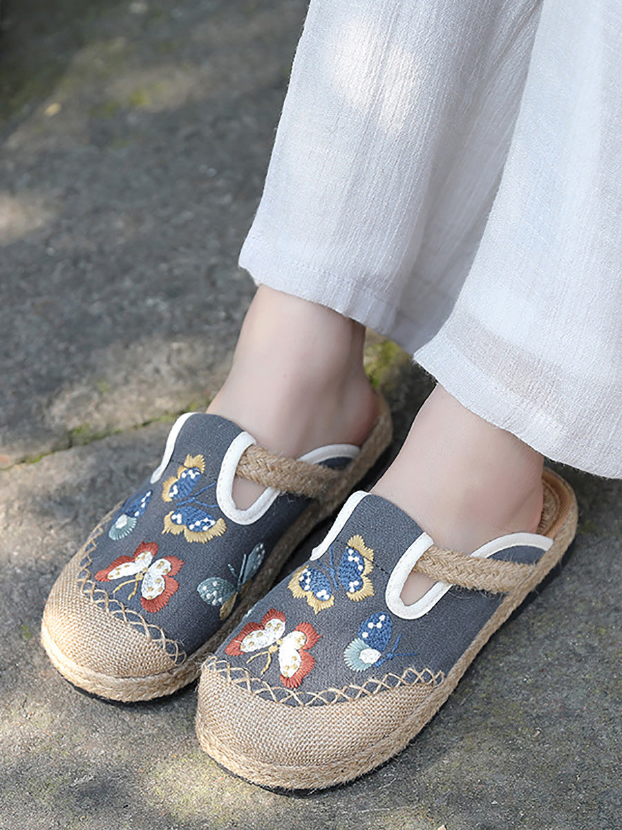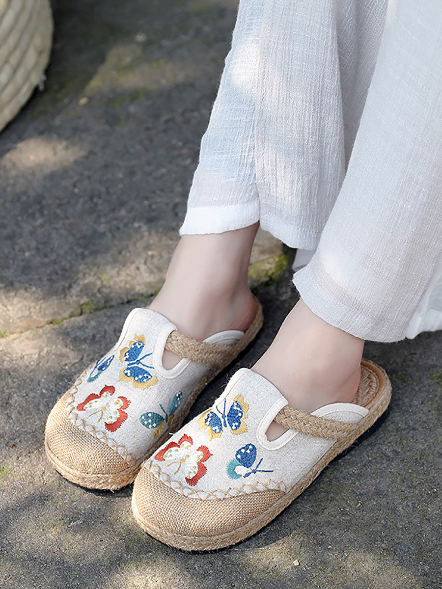 女士夏季藝術蝴蝶刺繡帆布拖鞋