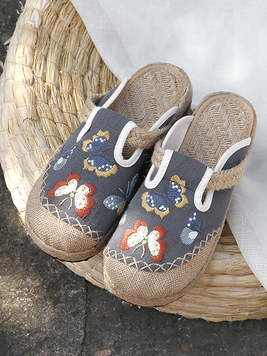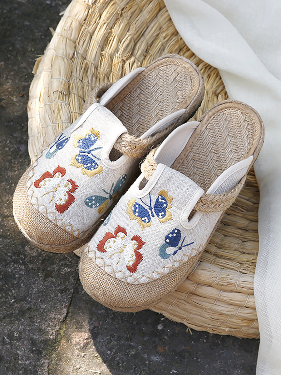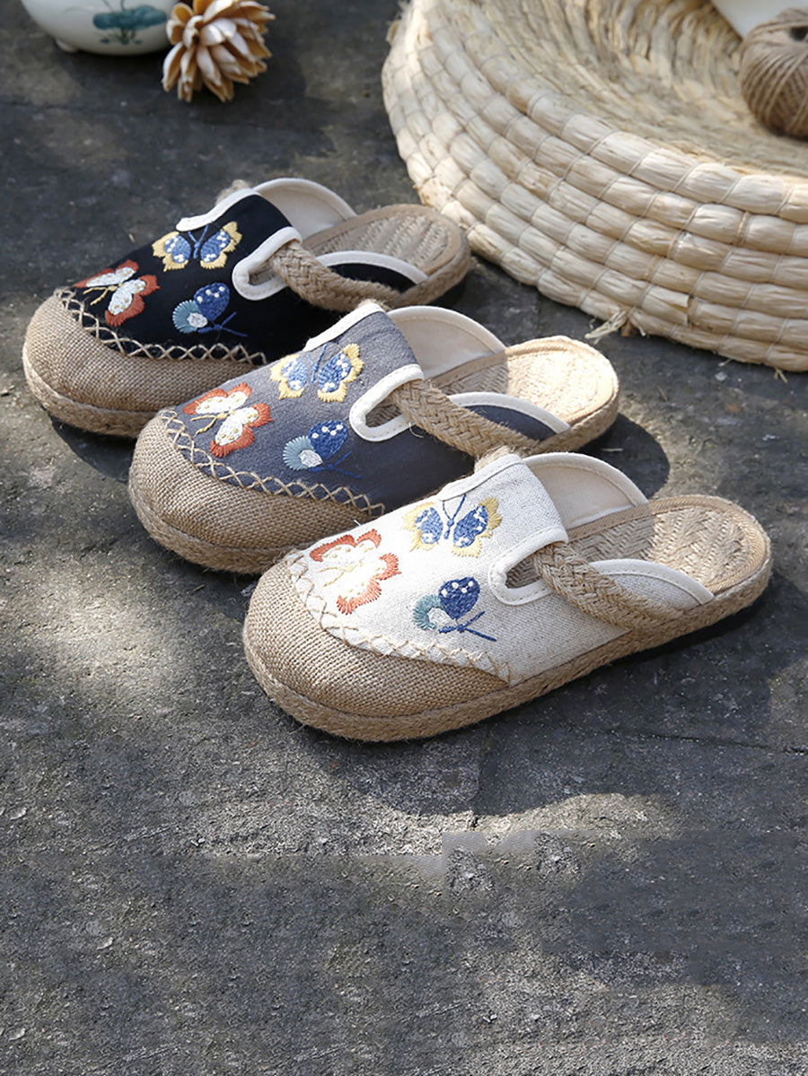 女士夏季藝術蝴蝶刺繡帆布拖鞋