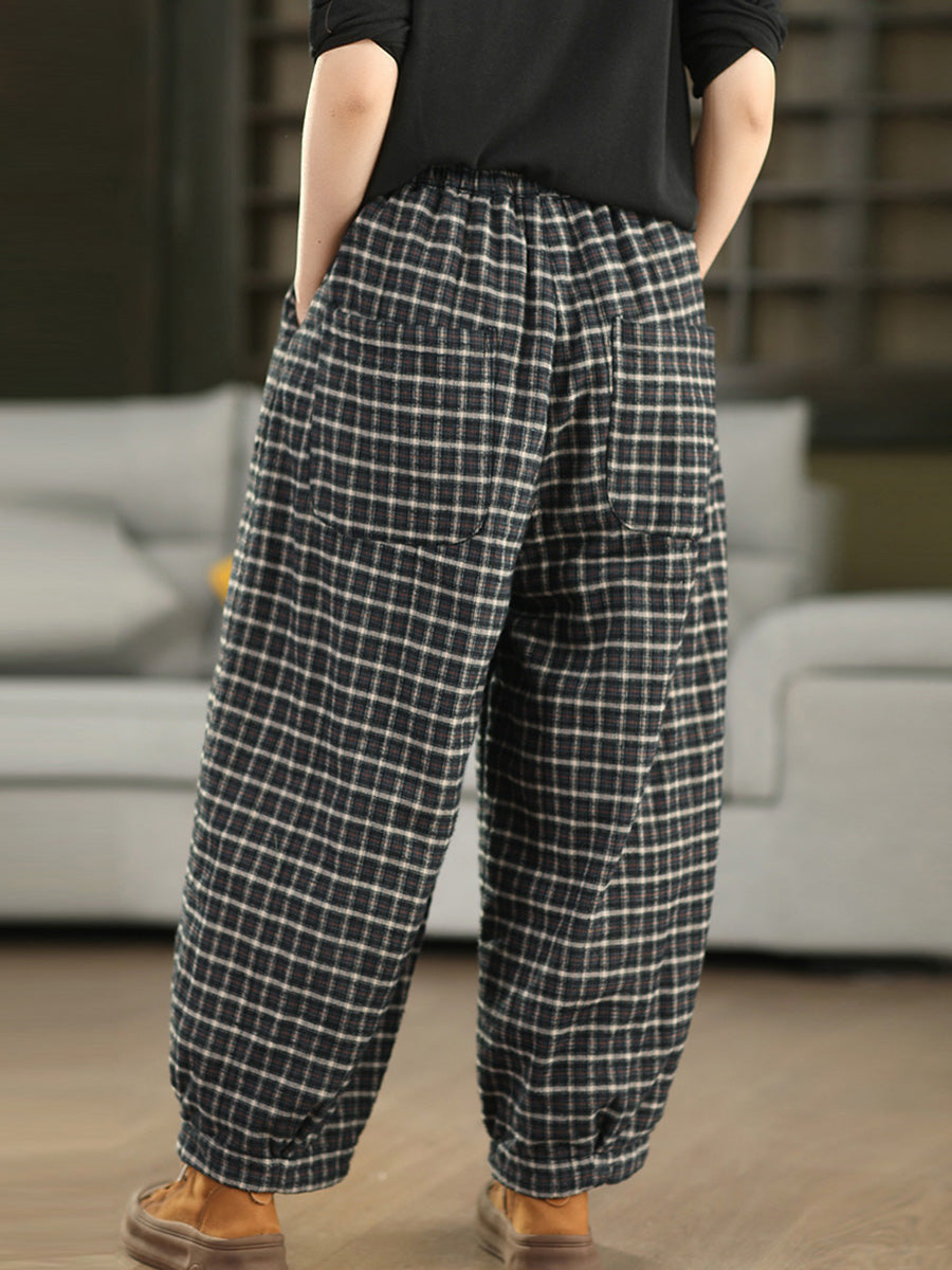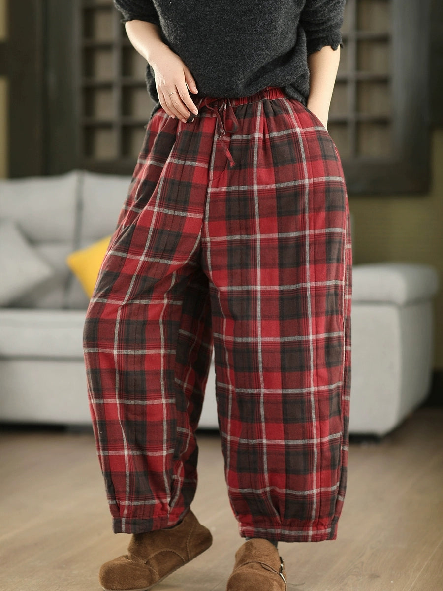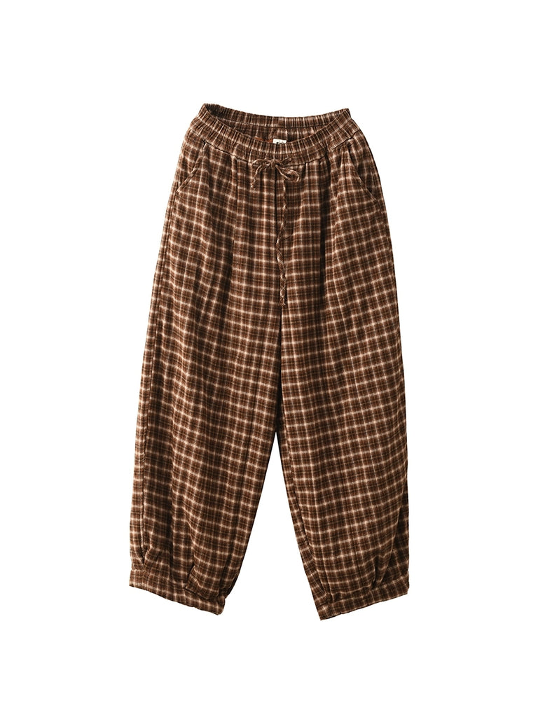 女士冬季復古格子100%純棉絎縫哈倫褲