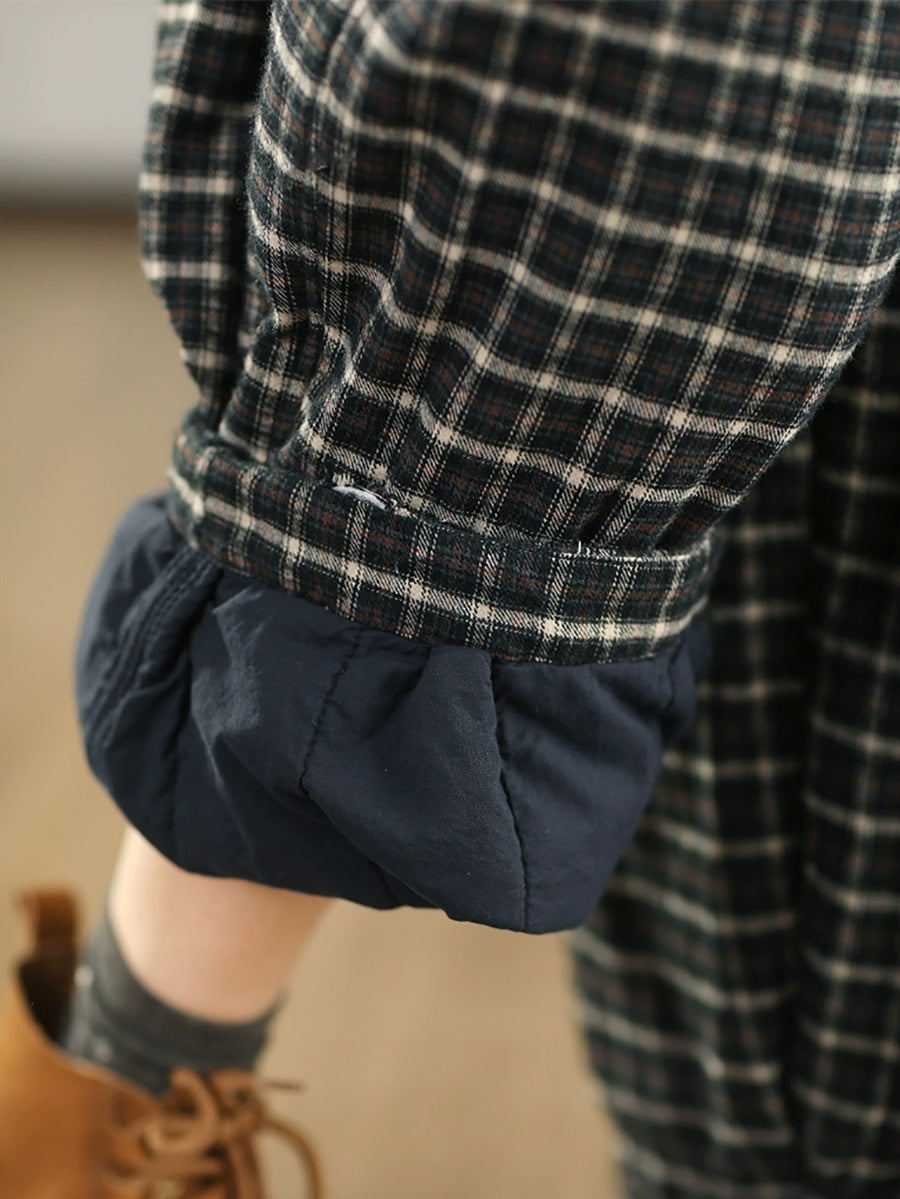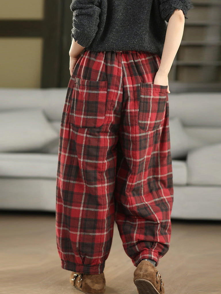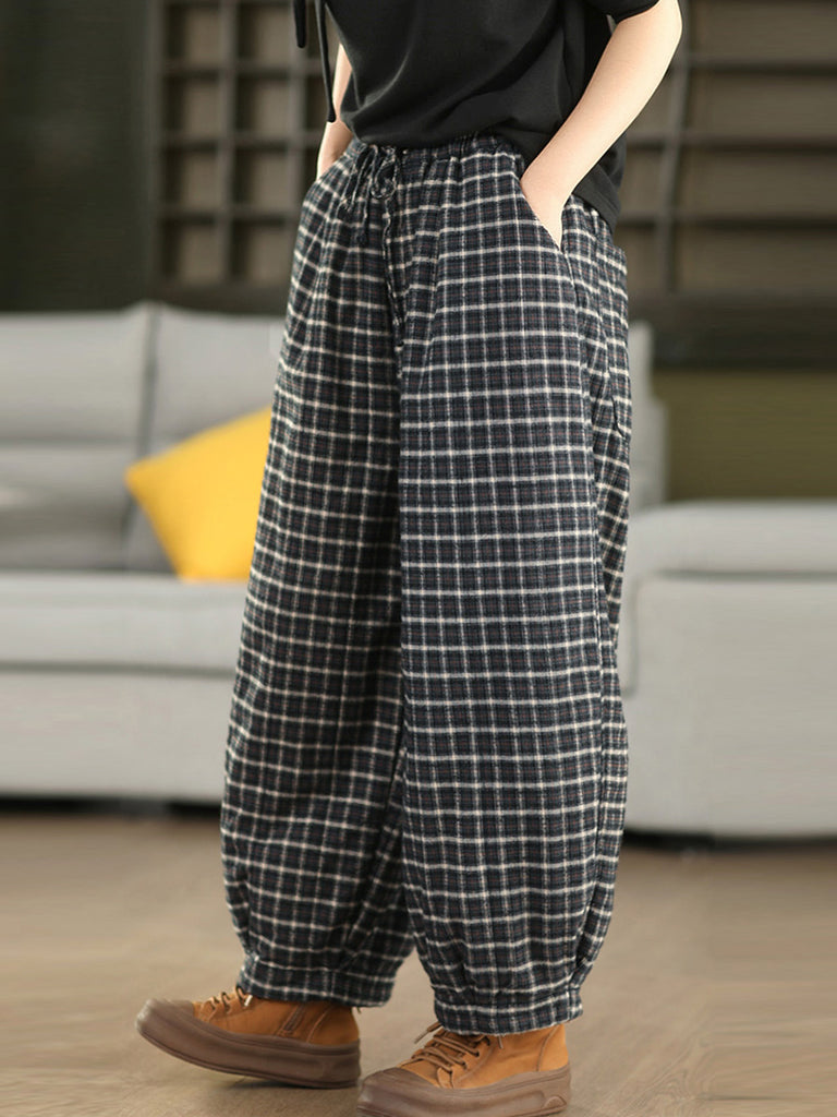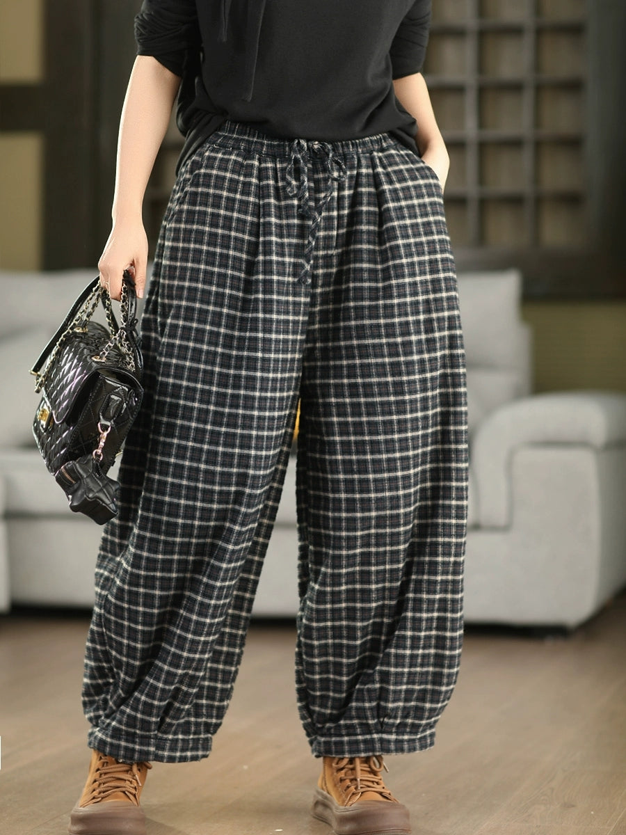 女士冬季復古格子100%純棉絎縫哈倫褲